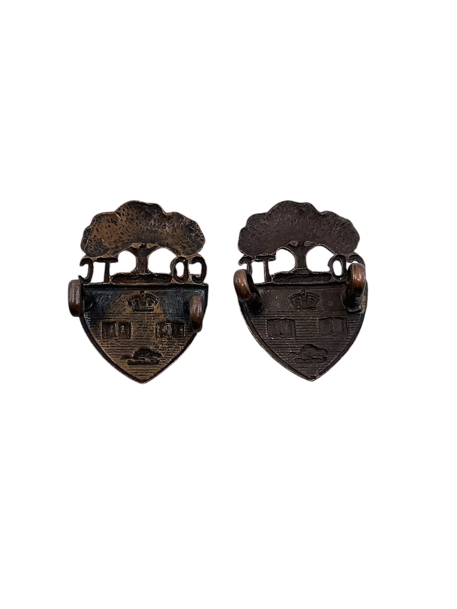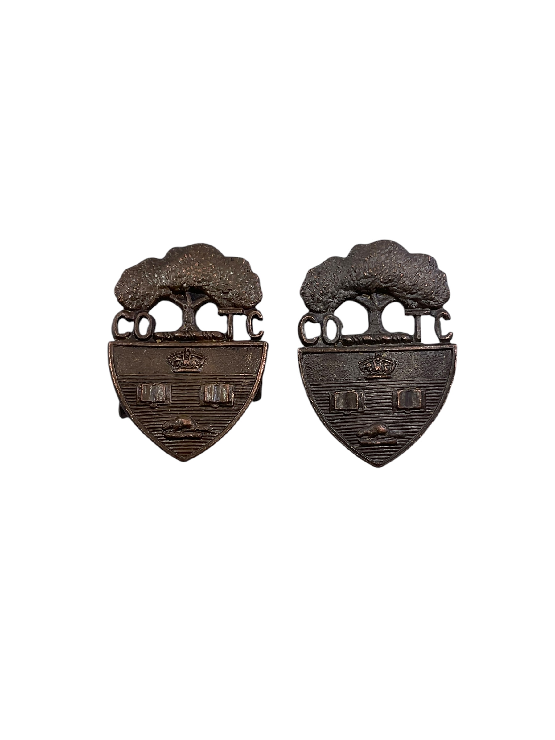 This product is a pair of WW2 Canadian COTC (Canadian Officer Training Corps) University of Toronto Collar Insignia. These rare historical items are a tribute to the military training provided at the University of Toronto during the Second World War. The insignia are made of high-quality metal that has been well-preserved, showcasing the intricate details of the design. The coat of arms of the University of Toronto is prominently displayed on each insignia, surrounded by a wreath and topped with a crown, symbolizing the allegiance to the monarch of Canada. This pair of collar insignia is not only a piece of military memorabilia but also a significant artifact from one of Canada’s oldest and most prestigious educational institutions. They hold immense historical significance and would make a valuable addition to any collection.