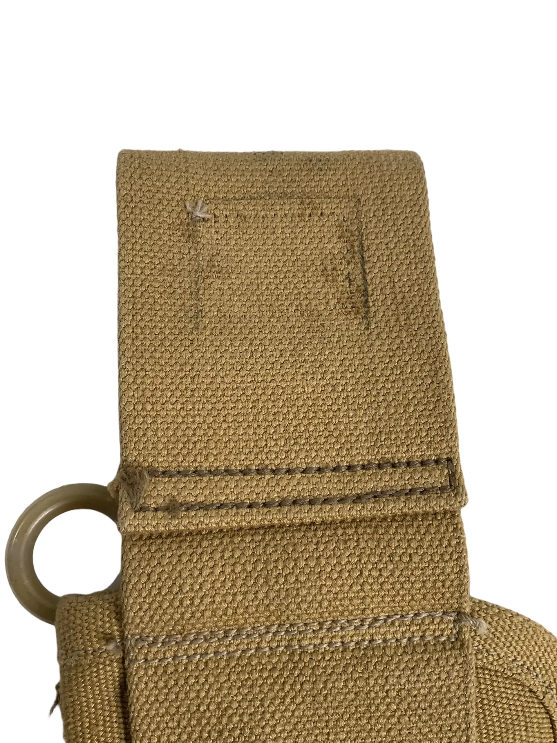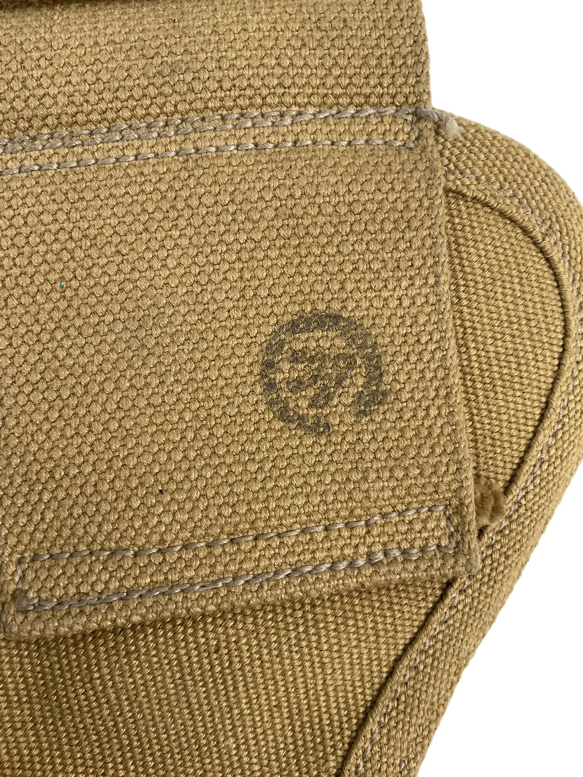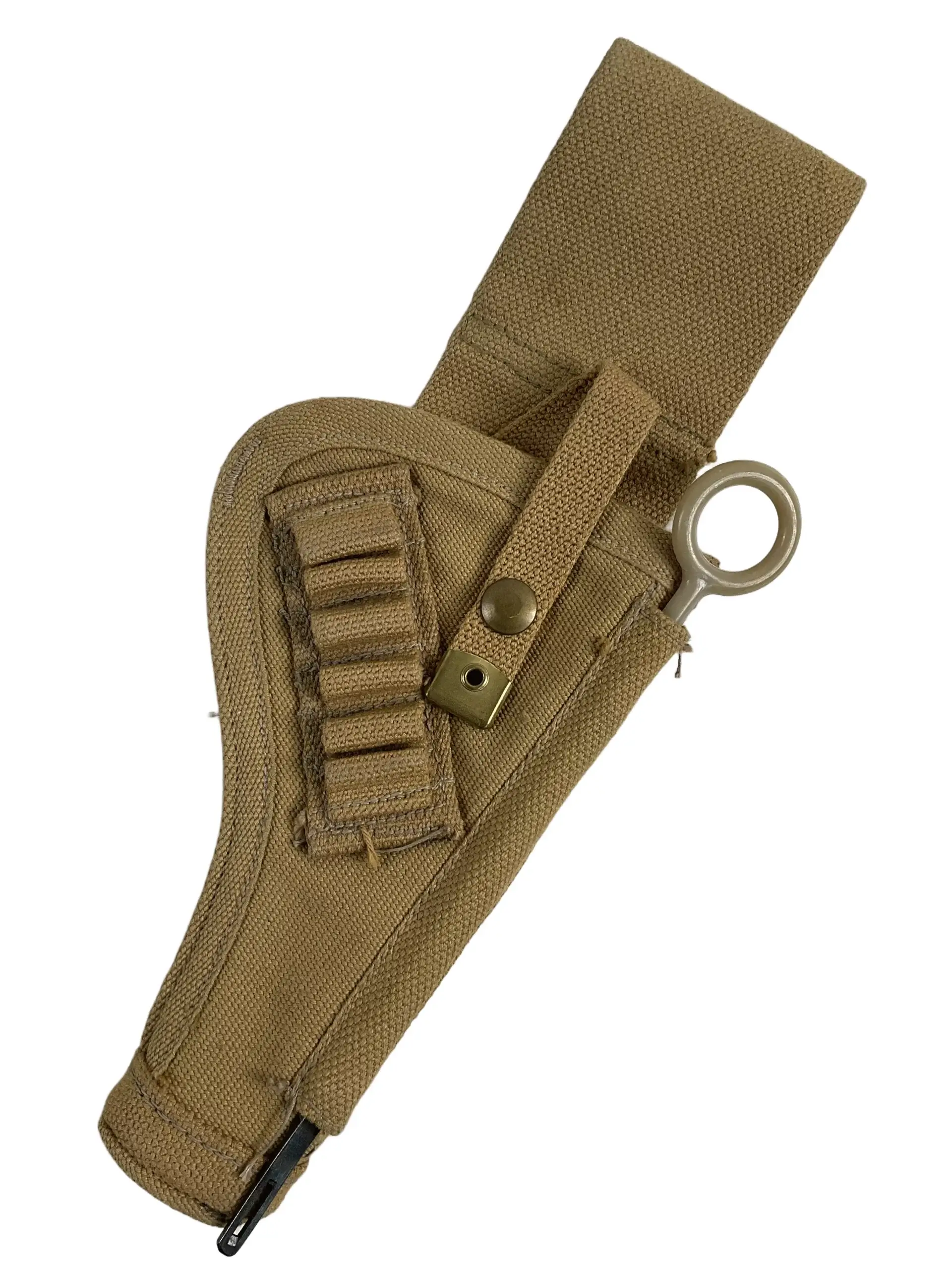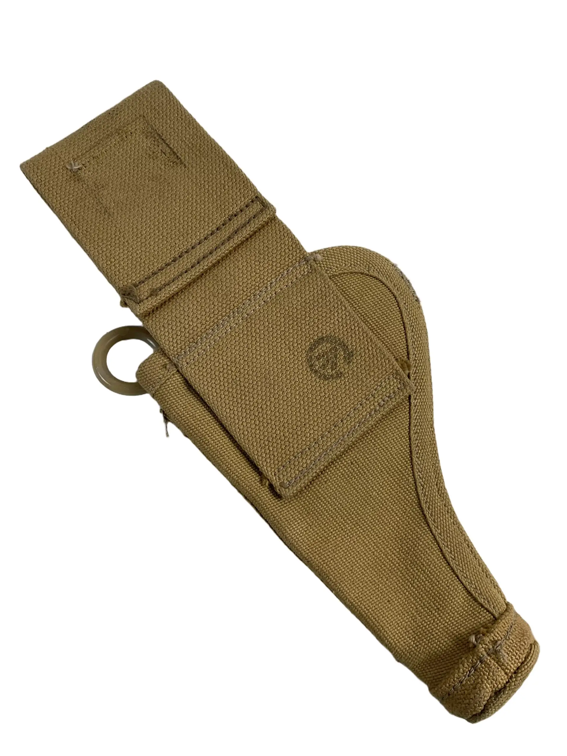 The WW2 Canadian Drop Leg Holster C Broad Arrowed is a standard-issue sidearm holster used by Canadian military forces during the Second World War. Designed to accommodate service pistols such as the Enfield No. 2 or the Browning Hi-Power, it features a rugged canvas construction with reinforced stitching to withstand operational use. The holster is distinguished by its drop-leg design, allowing for ease of access and comfortable wear over battle dress or webbing. A broad arrow stamp marked with the letter “C” indicates official Canadian military property, as per Commonwealth ordnance identification practices of the period. The holster includes a securing flap with metal closure and belt loops for attachment to standard-issue webbing equipment. This type of holster was widely issued to officers, vehicle crews, and other personnel requiring a sidearm. Its practical features and distinct markings make it a representative example of Canadian-issued equipment from World War II.