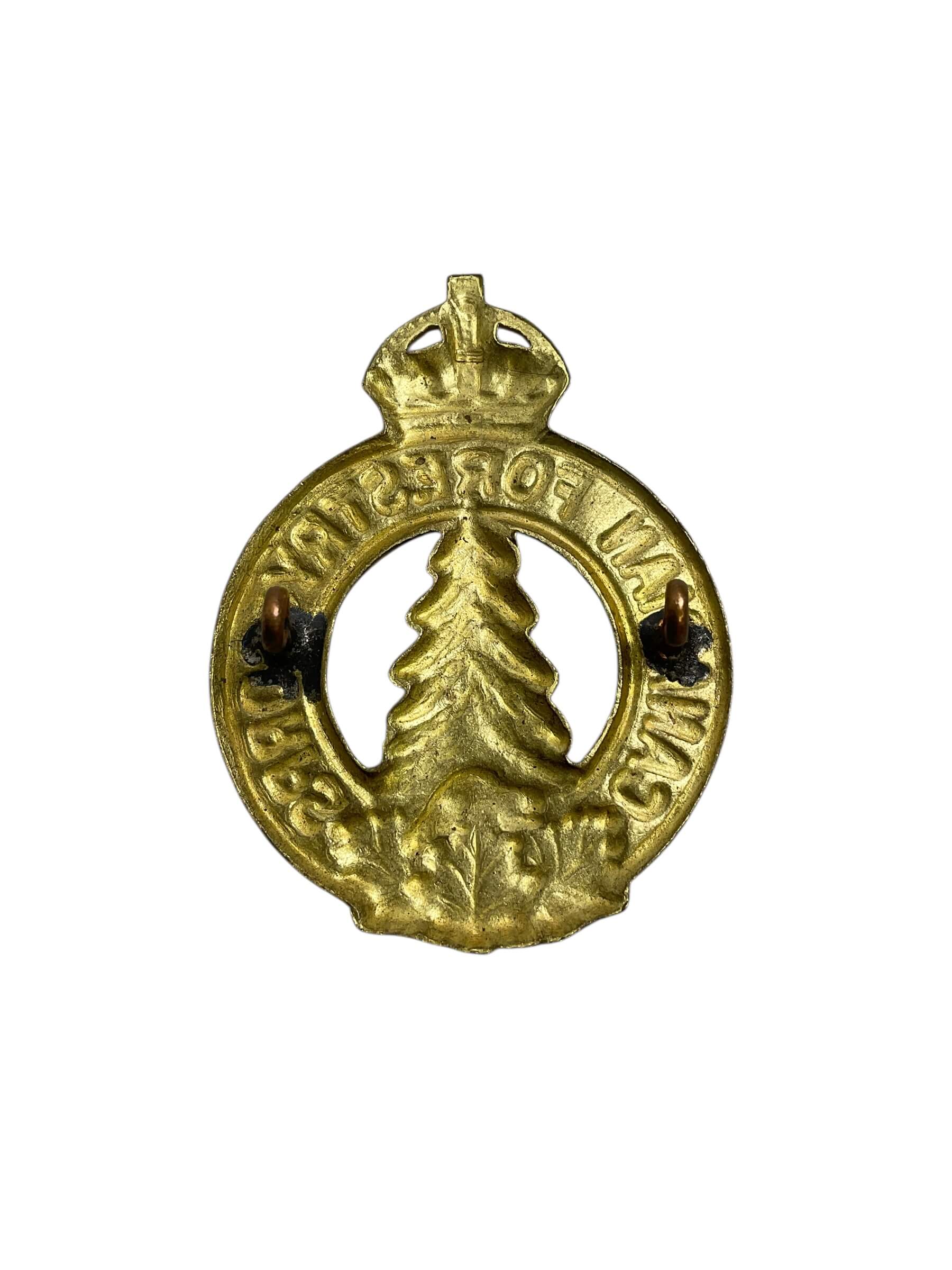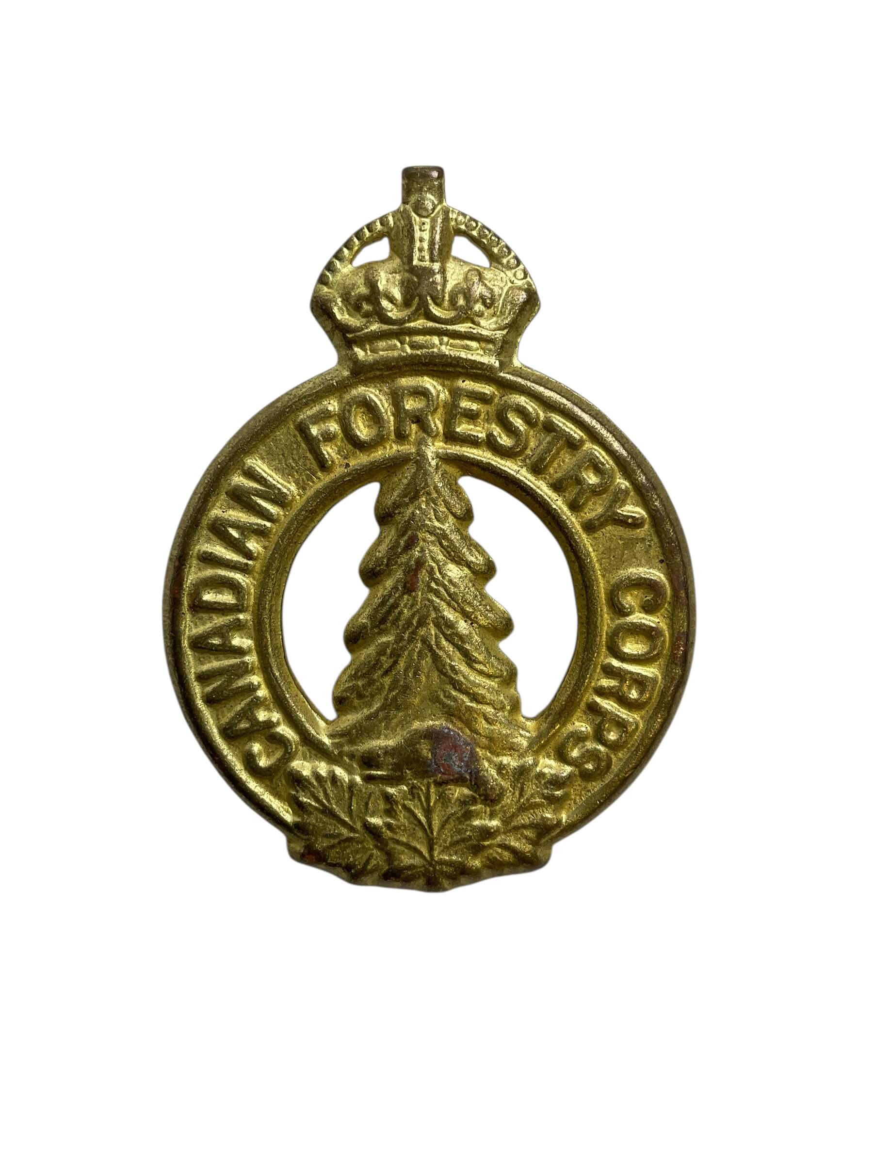 The WW2 Canadian Forestry Corps Cap Badge is an iconic piece of military memorabilia, emblematic of Canada’s contribution to the war effort. Made mainly from brass, this distinctive badge features the logo of the Canadian Forestry Corps, which includes a tree and two crossed axes, symbolizing the Corps’ role in providing timber for the Allied forces. Above the logo is King George VI’s crown, signifying the Corps’ allegiance to the monarch. The badge was attached to the ‘Tam o’ Shanter’ cap, worn by the Corps’ members. This cap badge not only signifies a member’s belonging to the Corps but also stands as a historical artifact that pays homage to the crucial services provided by the Canadian Forestry Corps during WW2. The intricate design and fine craftsmanship of the badge reflect the pride and honour associated with serving in the Corps.