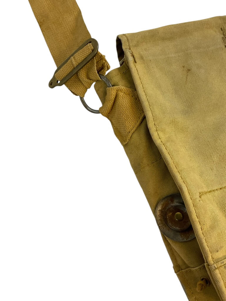 This WW2 Canadian Gas Mask Bag is a historical artifact that served as an essential piece of equipment for Canadian soldiers during the Second World War. These canvas bags were used to carry gas masks, a crucial survival tool amid the threat of chemical warfare. The bag features a single strap for over-the-shoulder wear, allowing soldiers to keep their hands free. It is characterized by a rectangular shape and a flap top secured with a buckle, providing easy access while offering protection from dust and damage. The bag’s muted khaki color reflects its military origins. Not only does this WW2 Canadian Gas Mask Bag represent a practical item from a pivotal time in history, but it also offers a tangible link to Canada’s military past. It’s a noteworthy item for history enthusiasts, collectors, or anyone with a keen interest in wartime memorabilia.