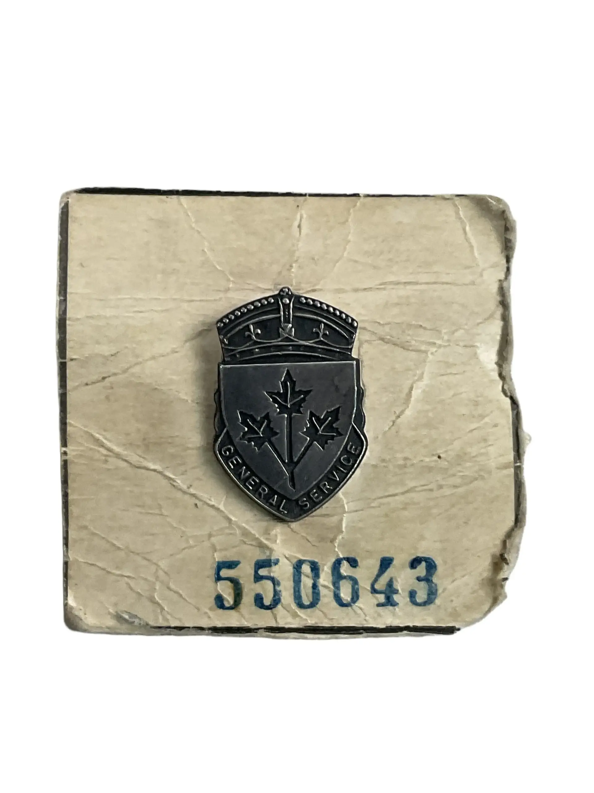 The WW2 Canadian General Service Lapel Badge On Card is an original military artifact issued during the Second World War to recognize the service of Canadian military personnel. The badge is typically made of brass or similar metals and features the Canadian maple leaf emblem, accompanied by the words “General Service” and “Canada.” Designed for wear on civilian clothing, this lapel badge allowed veterans to display their service when not in uniform. The badge in this listing is presented on its original card, which often includes printed information regarding eligibility or instructions for wear. Such badges were awarded to members of the Canadian armed forces who had volunteered and served during the war, reflecting the individual’s contribution to the Allied effort. The preservation of both the badge and its original card adds to its historical interest, providing insight into Canada’s military recognition practices during the 1940s.