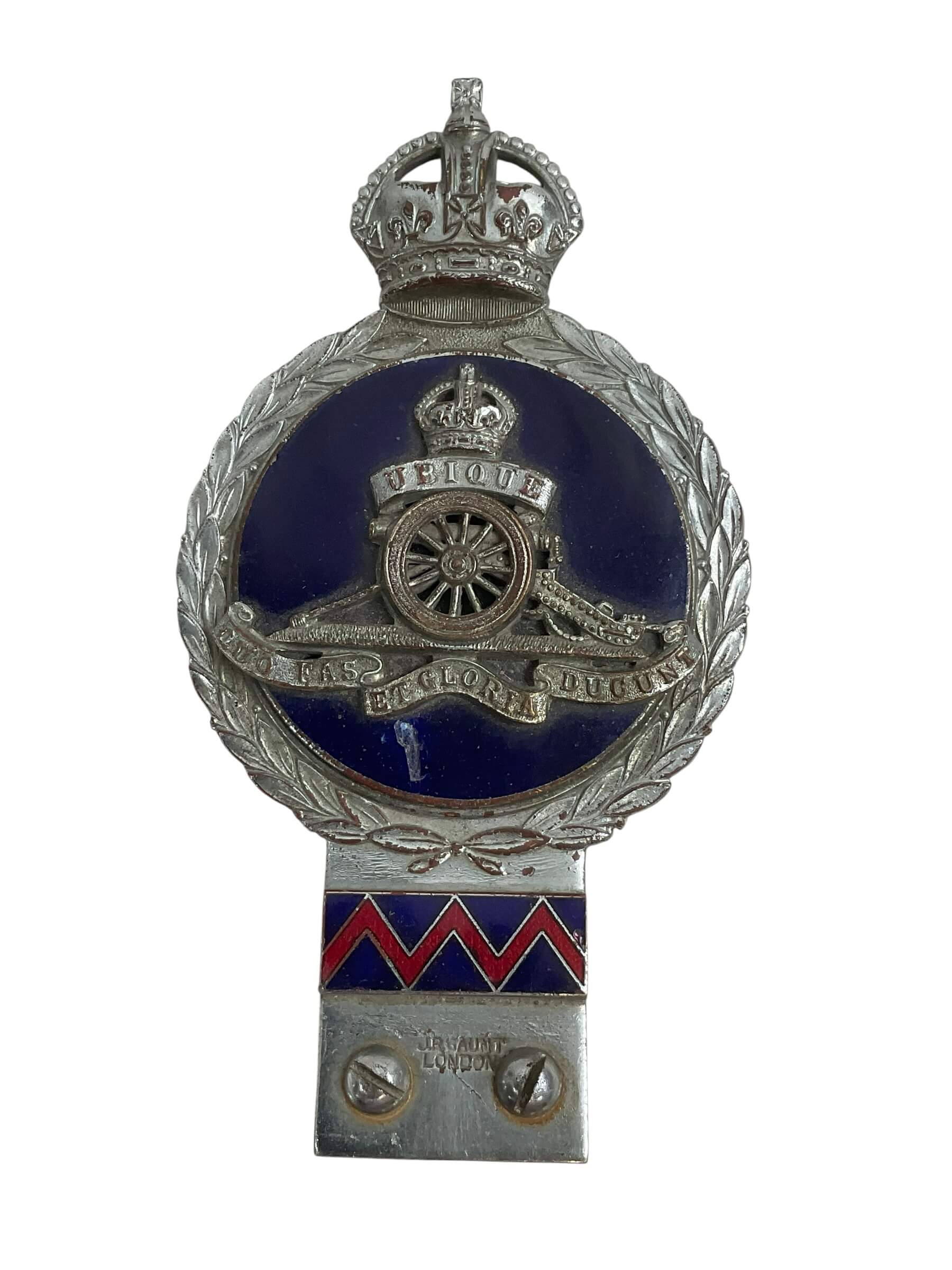 The WW2 Canadian Heavy Artillery Car Badge is a military insignia used by personnel assigned to heavy artillery units within the Canadian Army during the Second World War. Typically affixed to vehicles, this badge served to identify the affiliation and function of the vehicle within military columns or encampments. The design often features the insignia of the Royal Canadian Artillery, which may include elements such as a cannon, crown, or unit-specific designations, rendered in durable metal with an appropriate finish for wartime service. The badge provides historical insight into the organization and identification practices of Canadian forces during the 1939–1945 period. Measuring approximately several inches in width, it would have been mounted prominently to ensure visibility. Items of this type are of interest for their connection to the logistical and operational aspects of wartime artillery deployment, as well as their role in the broader context of Canadian military history.