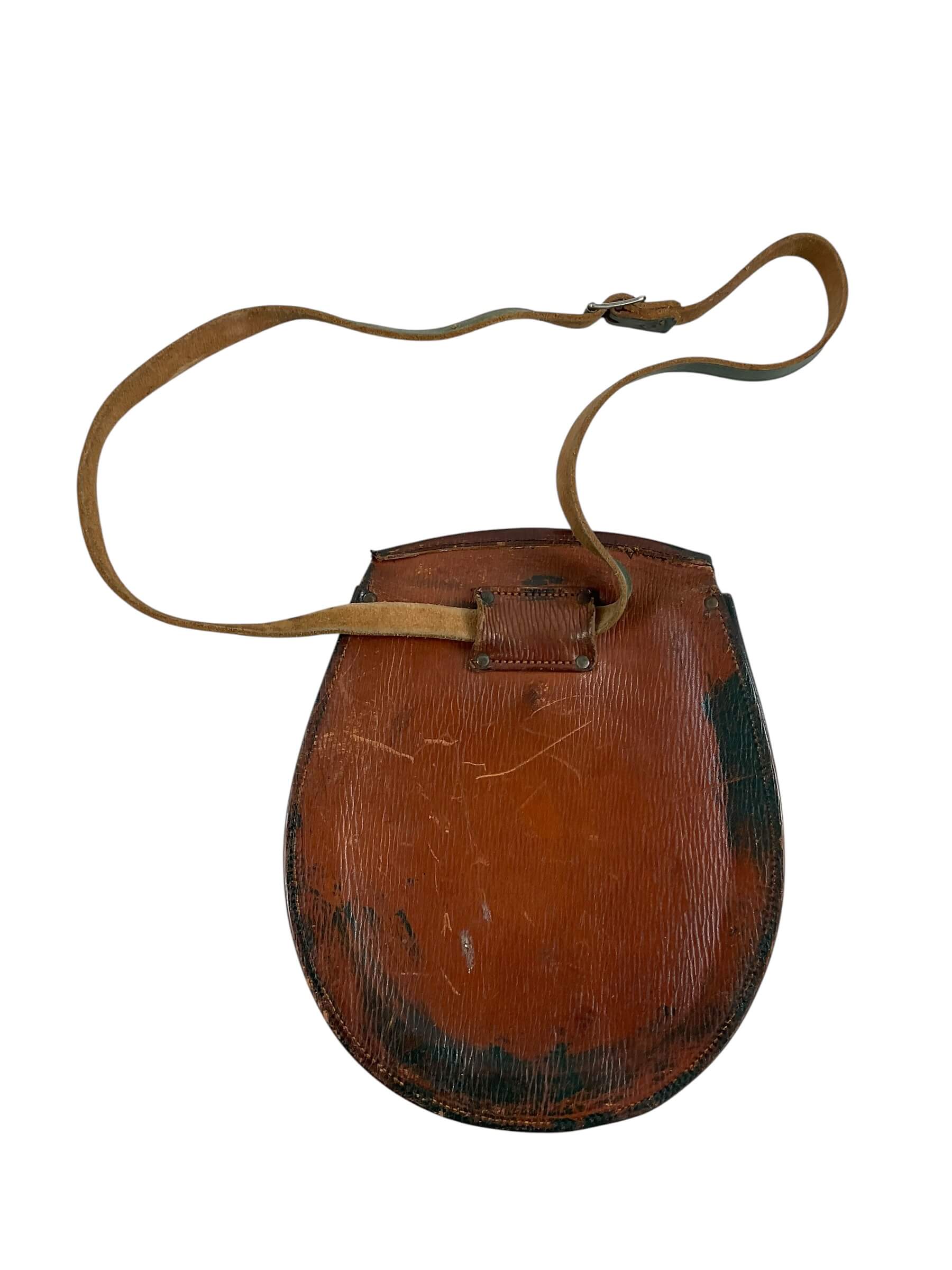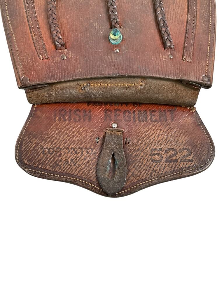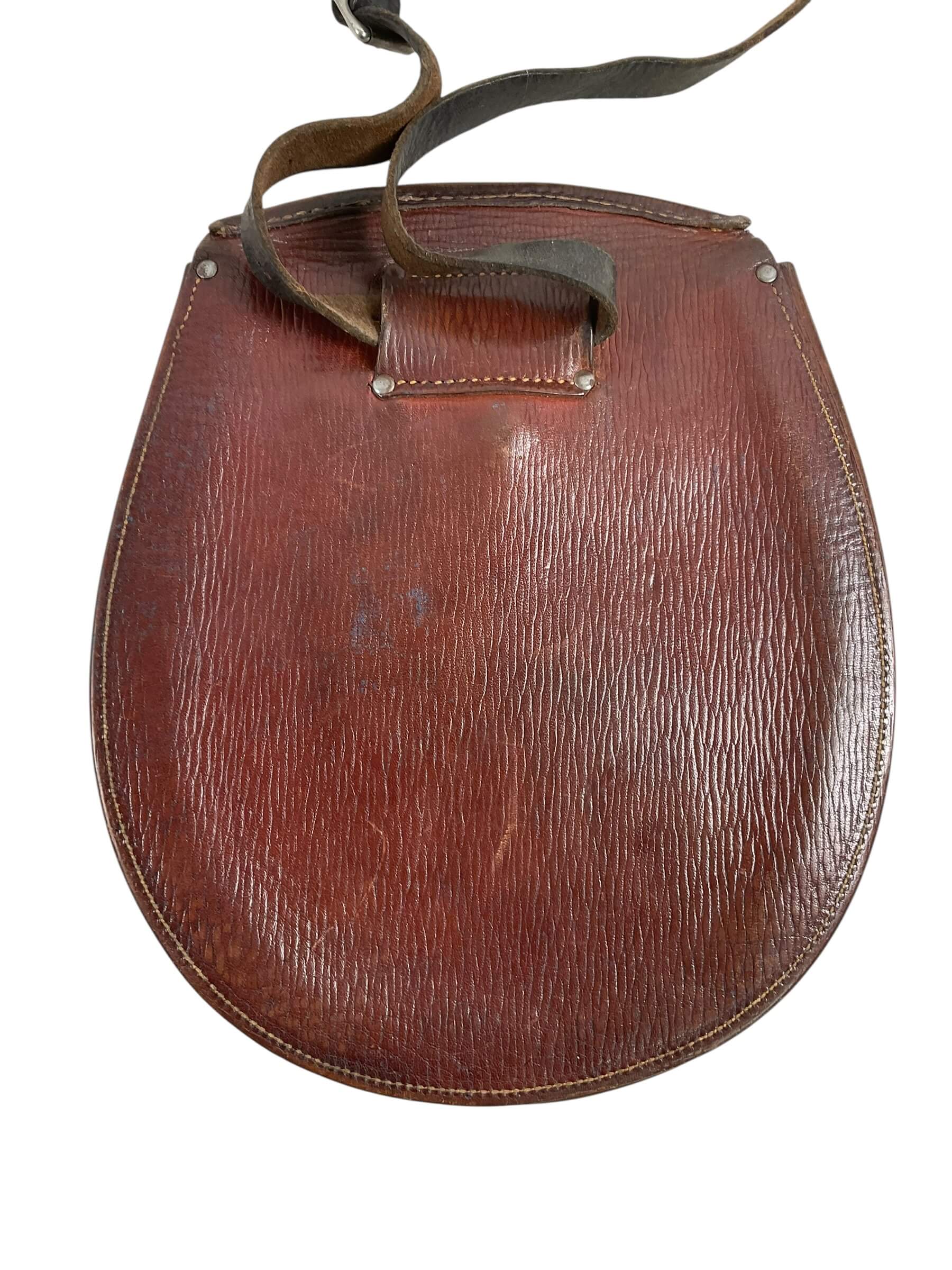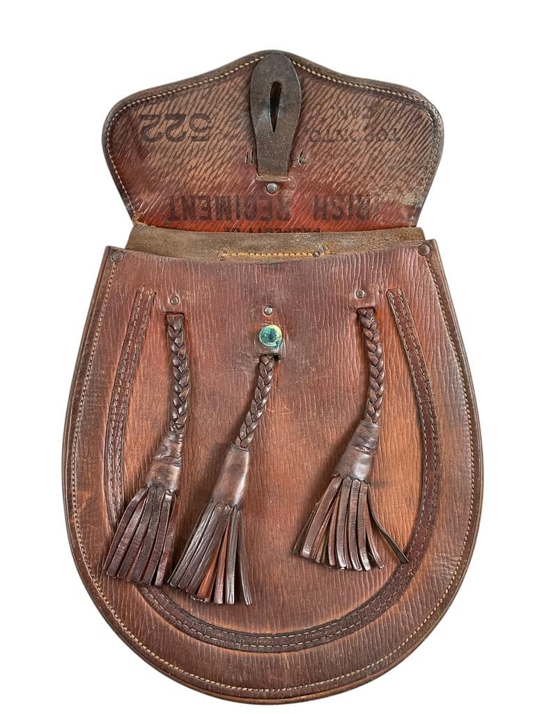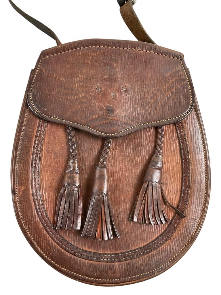 The WW2 Canadian Irish Regiment of Canada Brown Leather Sporran with 3 Tassels and Strap is a military accessory used historically by the Irish Regiment of Canada during World War II. Traditionally, a sporran is a pouch that performs the role of pockets on the kilts worn by Scottish and Irish regiments. This specific sporran is made of high-quality, robust brown leather, ensuring durability and longevity. Its design features three decorative tassels, enhancing the visual appeal of the traditional item, and a strap for attaching it to a belt or other apparel. This product is significant as it represents a piece of Canadian and Irish military history. Please note that this description refers to genuine periodic items, not modern reproductions or fakes. Historical enthusiasts, collectors, and those interested in military accessories would find this item particularly noteworthy.
