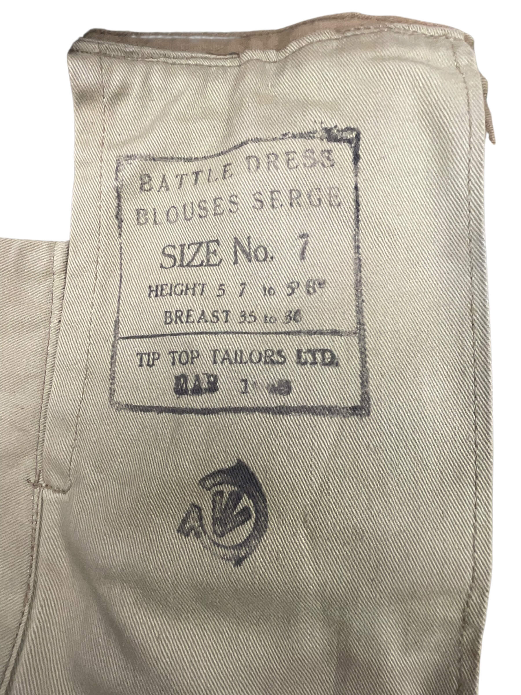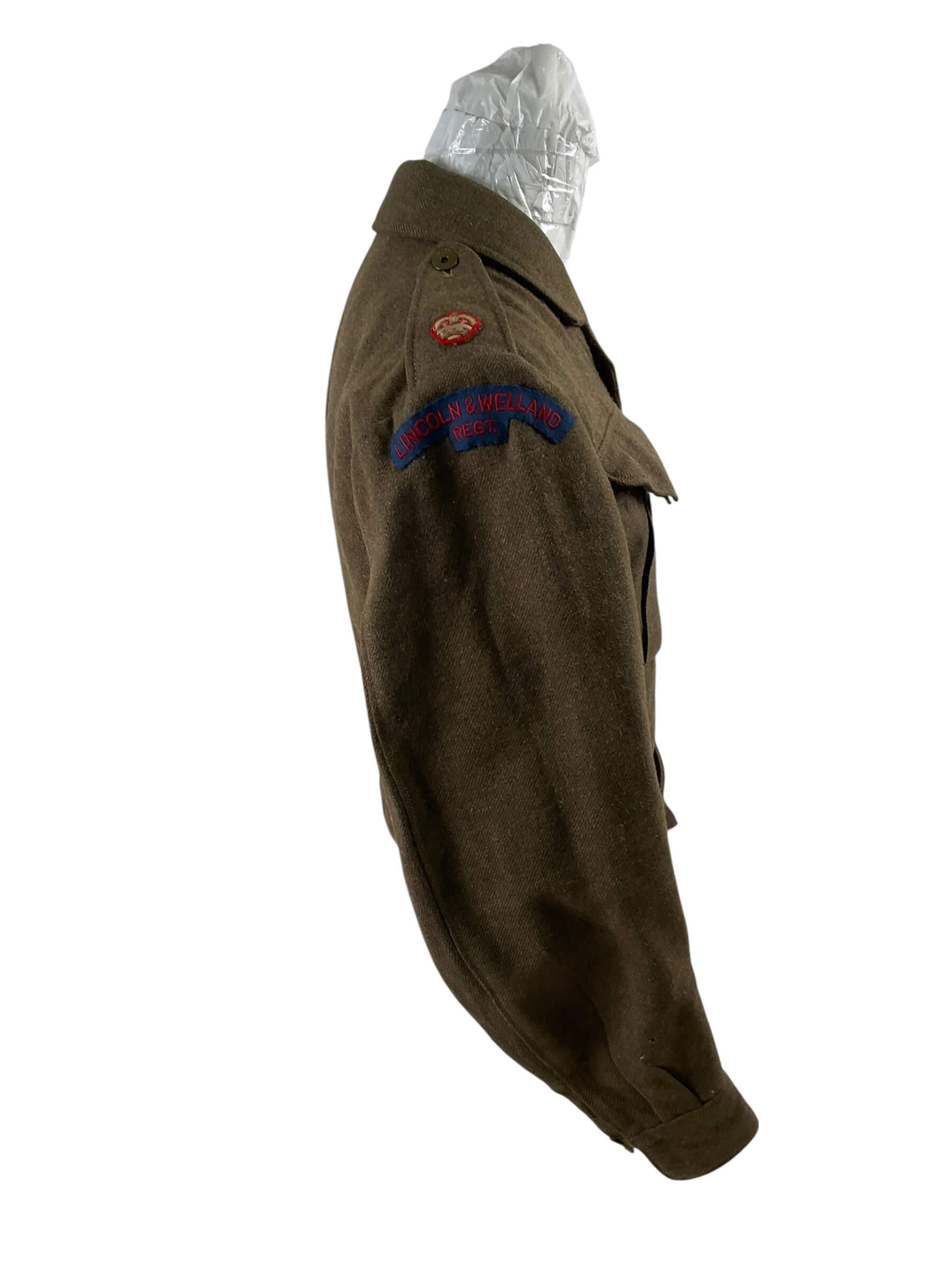 The WW2 Canadian Lincoln and Welland Officers Battle Dress, marked with a ‘C’ broad arrow, is a standard issue uniform artifact from the Second World War. This example, designated Size 7, was worn by officers serving with the Lincoln and Welland Regiment, a Canadian Army infantry unit active during the conflict. The battle dress consists of a woolen blouse featuring a button front, chest and waist pockets, and shoulder straps, typical of British Commonwealth designs of the era. The ‘C’ broad arrow stamp identifies the garment as wartime Canadian government property. Officer battle dress uniforms often display finer tailoring and higher quality materials compared to enlisted versions. Such garments played a key role in maintaining unit identification and cohesion throughout military operations. This piece provides historical context into Canadian military dress standards and the operational history of the Lincoln and Welland Regiment during World War II.