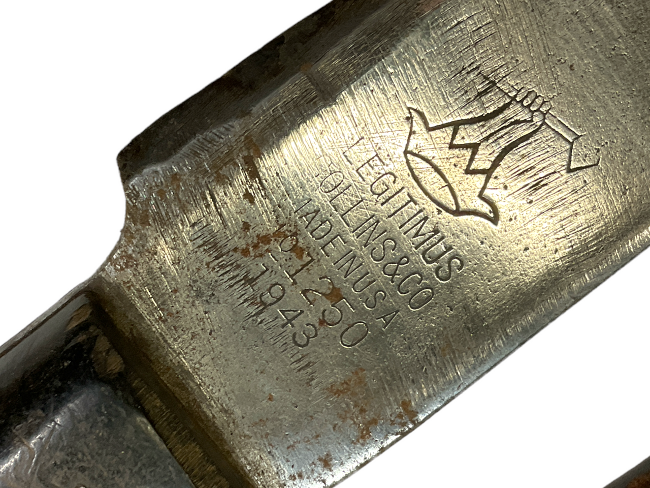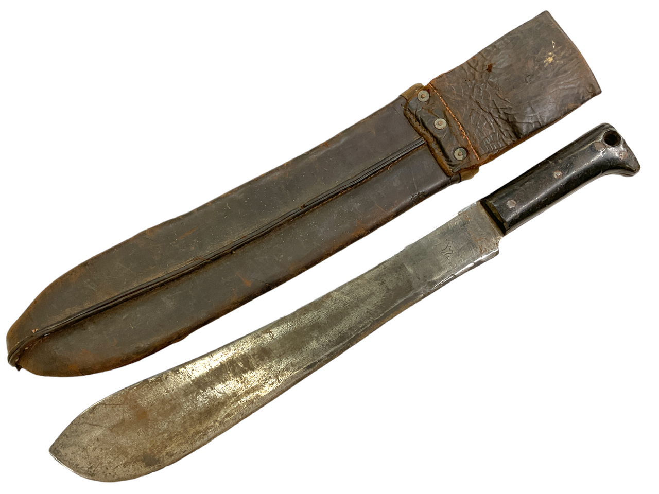 This authentic WW2 Canadian machete, accompanied by its original leather scabbard, is a remarkable piece of military history. Manufactured in 1943, the blade showcases the enduring craftsmanship and durability characteristic of wartime production. The machete features the distinctive “C” broad arrow mark, identifying it as official Canadian military issue. The leather scabbard, also marked with the broad arrow, has been carefully preserved, maintaining the integrity of its design and functionality. Its robust construction ensured the machete was securely held during intense military operations. Collectors and history enthusiasts will appreciate the historical significance and authenticity of this rare artifact, which reflects the gallant efforts of Canadian forces during World War II. This machete and scabbard set serves as a tangible connection to the past, offering a glimpse into the tools and equipment used by soldiers in the field over seven decades ago.