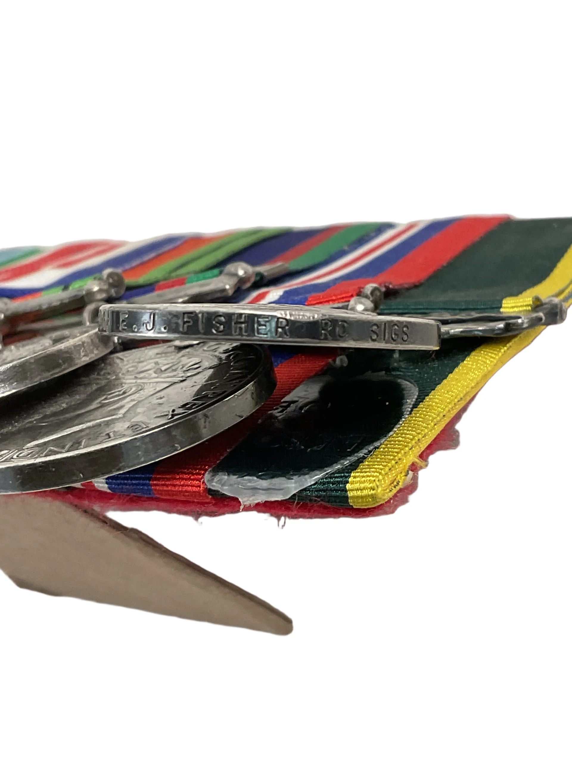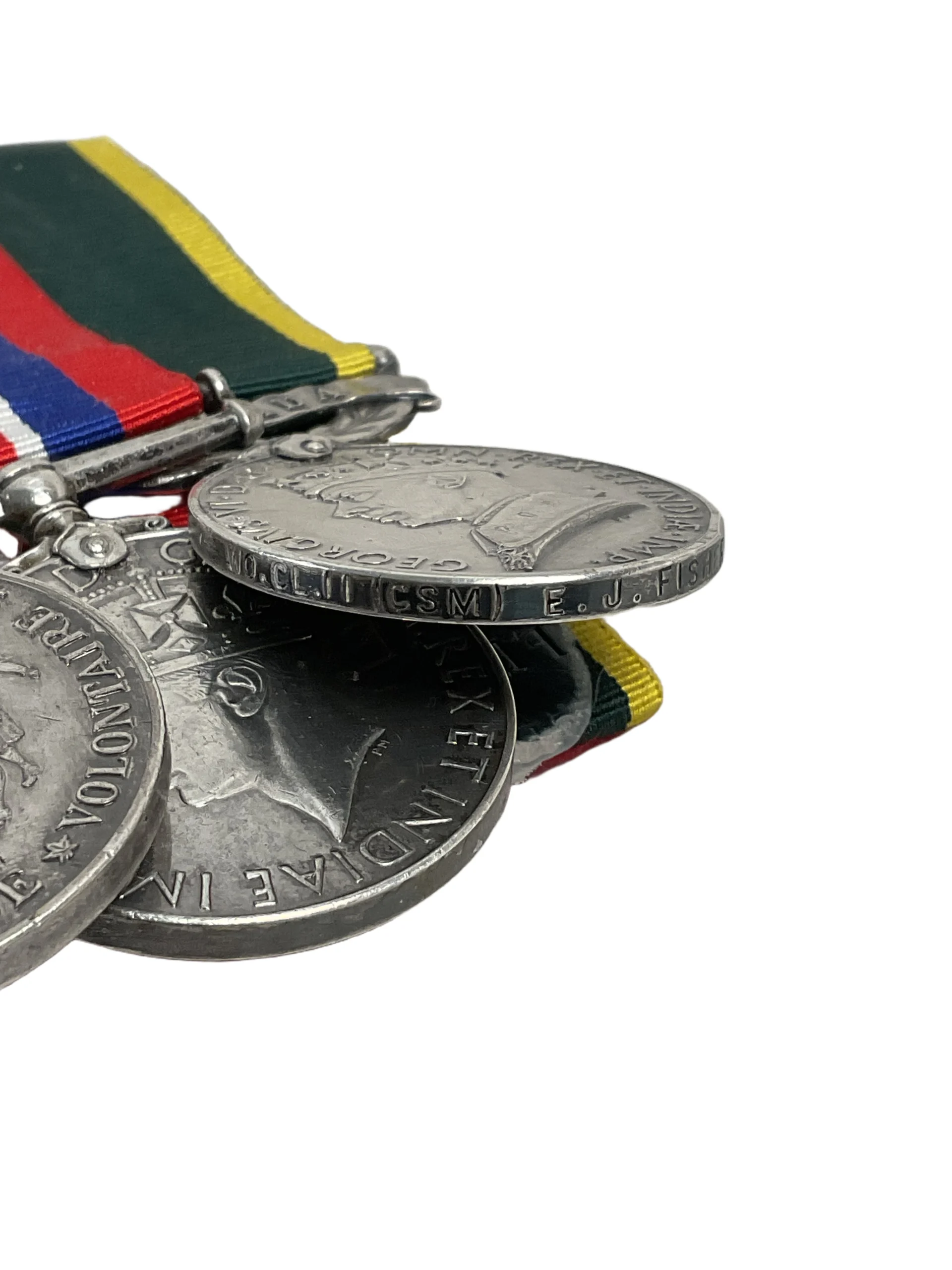 This World War II Canadian medal group consists of six original decorations, including the Efficiency Medal awarded for long and efficient service in the Non-Permanent Active Militia, with the “RC SIGS” (Royal Canadian Corps of Signals) unit designation. The group typically features campaign and service medals issued during the Second World War to Canadian personnel. Medals in this collection may include the 1939-1945 Star, France and Germany Star, Defence Medal, Canadian Volunteer Service Medal with overseas clasp, and the War Medal 1939-1945, alongside the Efficiency Medal. These medals are mounted together as worn, reflecting the recipient’s service with the Royal Canadian Corps of Signals. Such groups offer tangible links to individual military service within the context of Canada’s broader involvement in World War II. All items present original period manufacture, showing expected wear from age and handling. This grouping provides a representative example of Canadian military honors from the era.