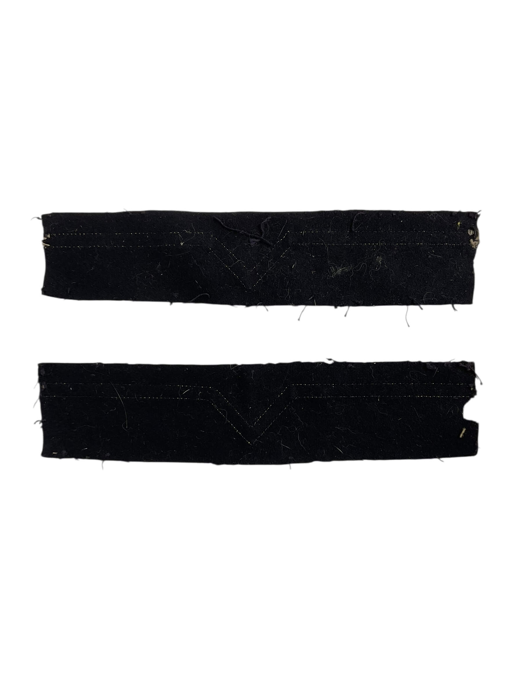 The WW2 Canadian Merchant Navy Second Engineer Officers Cuff Rank Insignia Pair consists of two original period insignia designed for wear on the uniform cuffs of Second Engineer Officers serving in the Canadian Merchant Navy during the Second World War. Each insignia is constructed from navy blue wool flannel with gold bullion wire lace, featuring a distinctive pattern of stripes signifying the rank of Second Engineer Officer. The insign
