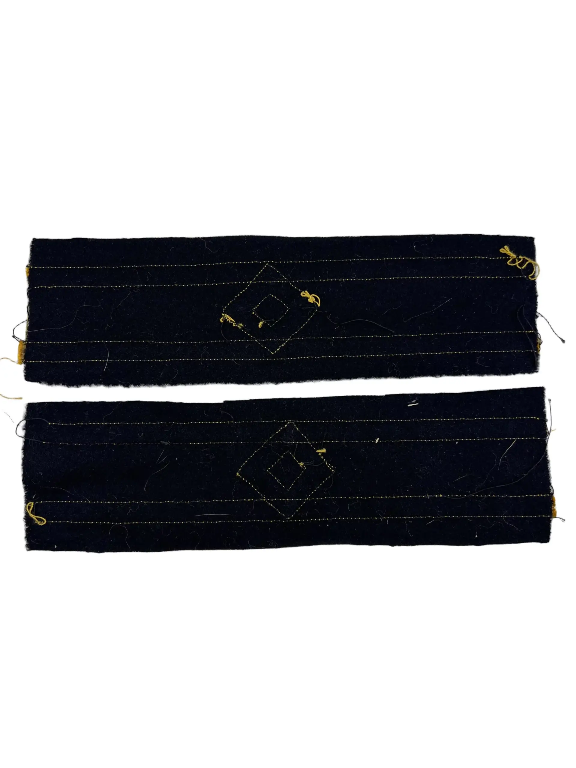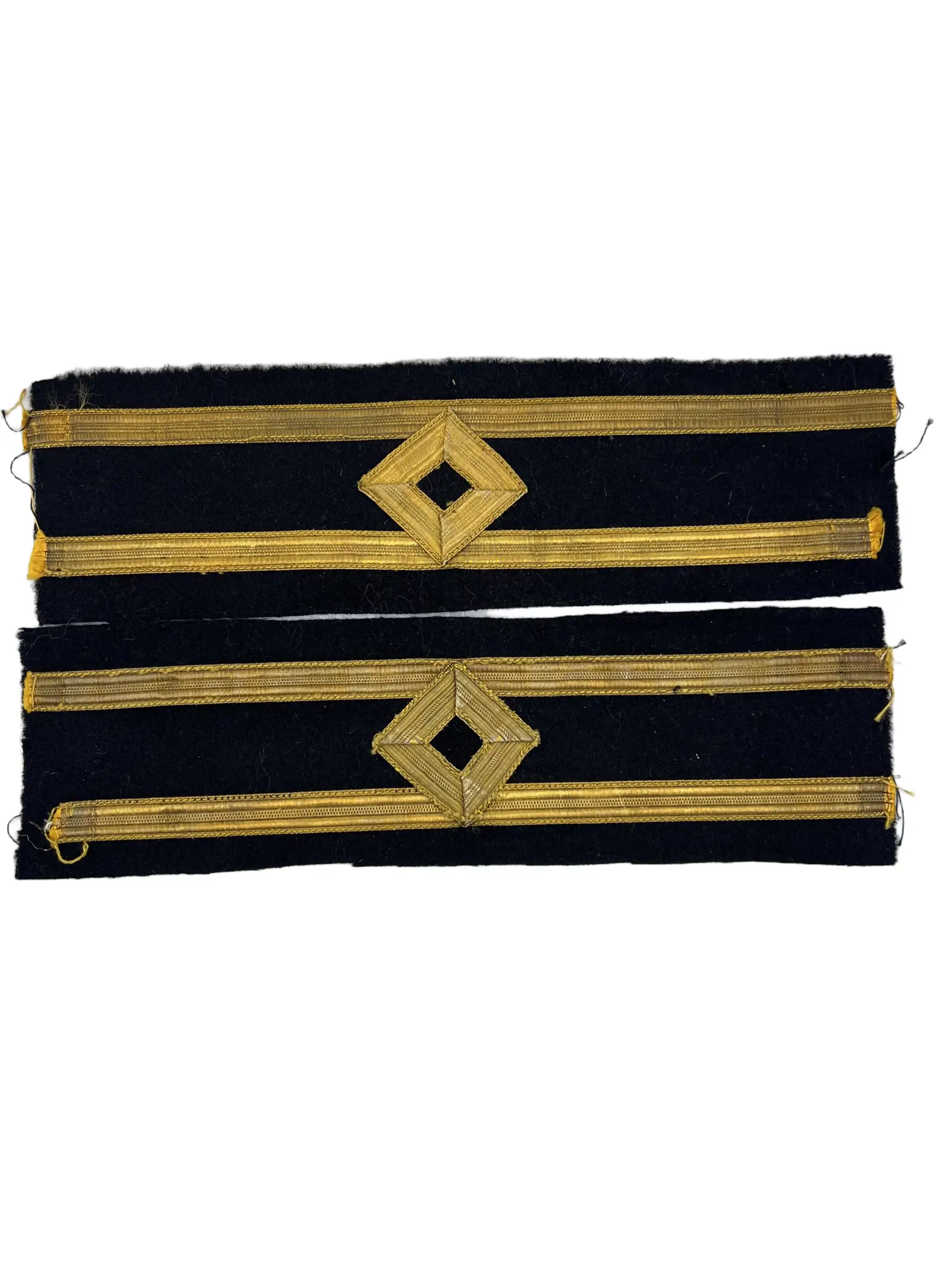 The WW2 Canadian Merchant Navy Second Officers Cuff Rank Insignia Pair consists of two matching rank insignia designed for attachment to the cuffs of a Second Officer’s uniform. Each insignia features gold braid striping, typically with two narrow bands and one distinctive diamond or curl indicating the specific rank within the Merchant Navy officer hierarchy during the Second World War. These insignia reflected the British tradition adopted by the Canadian Merchant Navy, distinguishing officer roles aboard merchant vessels responsible for crucial logistics and supply operations between 1939 and 1945. Materials often included gilt metallic thread or wire sewn onto dark navy blue wool backing. The pair offered here would have been worn as a set, positioned on the lower sleeves of the officer’s uniform jacket. Insignia of this type are valued for their connection to the history of Canadian maritime service and wartime logistics, providing a visible symbol of rank and duty aboard ship during World War II.