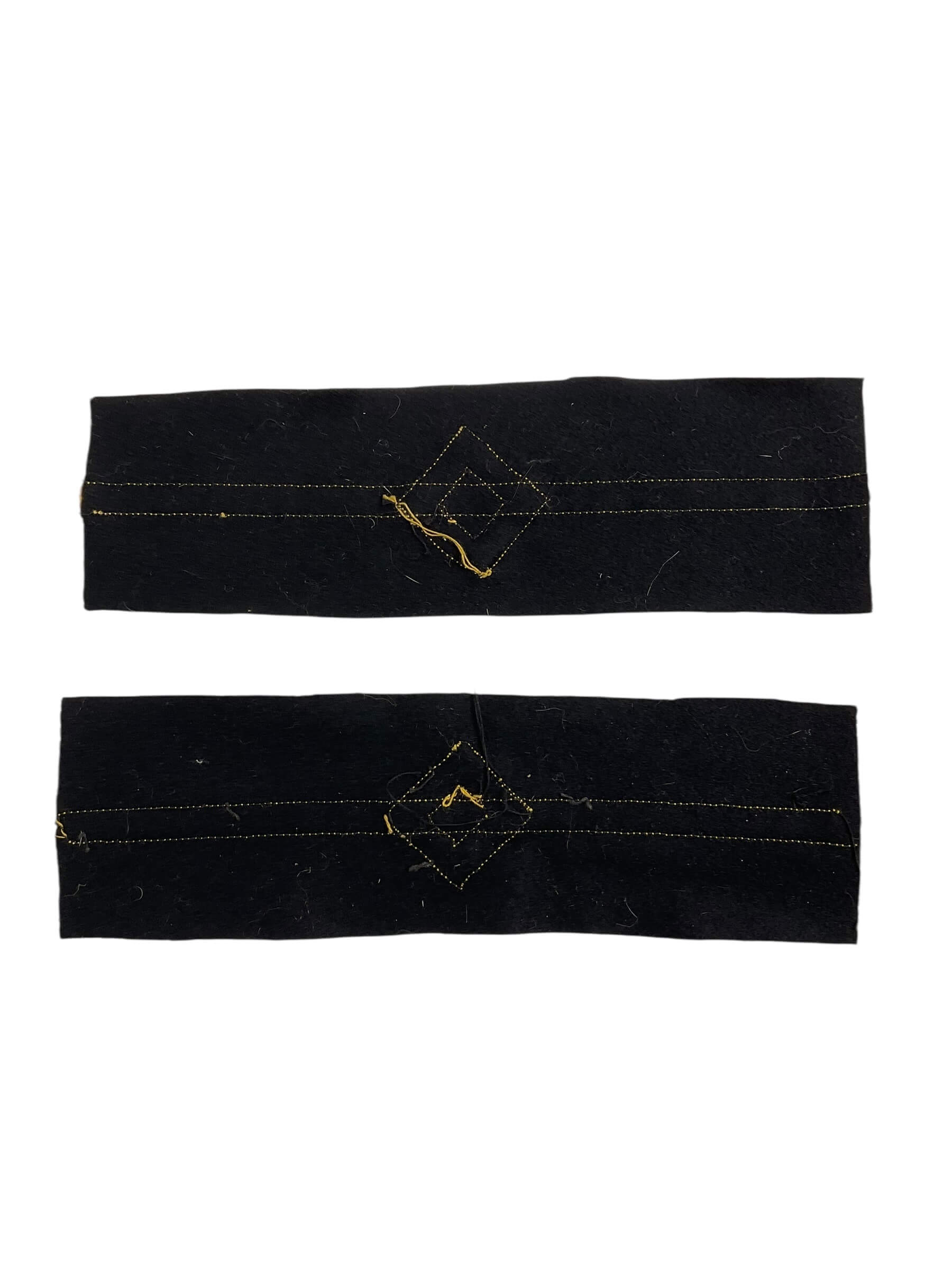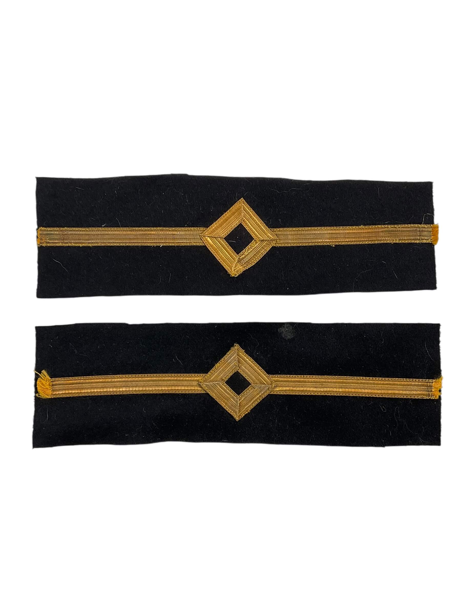 The WW2 Canadian Merchant Navy Third and Junior Certified Officers Cuff Rank Insignia Pair consists of two matching cuff insignia worn by officers serving as Third and Junior Certified Officers within the Canadian Merchant Navy during the Second World War. Each insignia is constructed from navy blue wool adorned with gold bullion wire lace in the form of one broad and one narrow band, indicating Third Officer rank according to contemporary regulations. The insignia would be sewn onto the lower sleeve cuffs of the officers’ dress uniforms, serving as a visual identifier of rank and responsibilities on board merchant vessels. The Canadian Merchant Navy played a vital role in transporting troops, supplies, and equipment during the war; clear identification of rank was essential for maintaining hierarchy and operational efficiency. Items such as this pair are representative of the uniform insignia prescribed for Canadian Merchant Navy officers during the 1939–1945 period. Signs of service wear are commensurate with age and intended use.