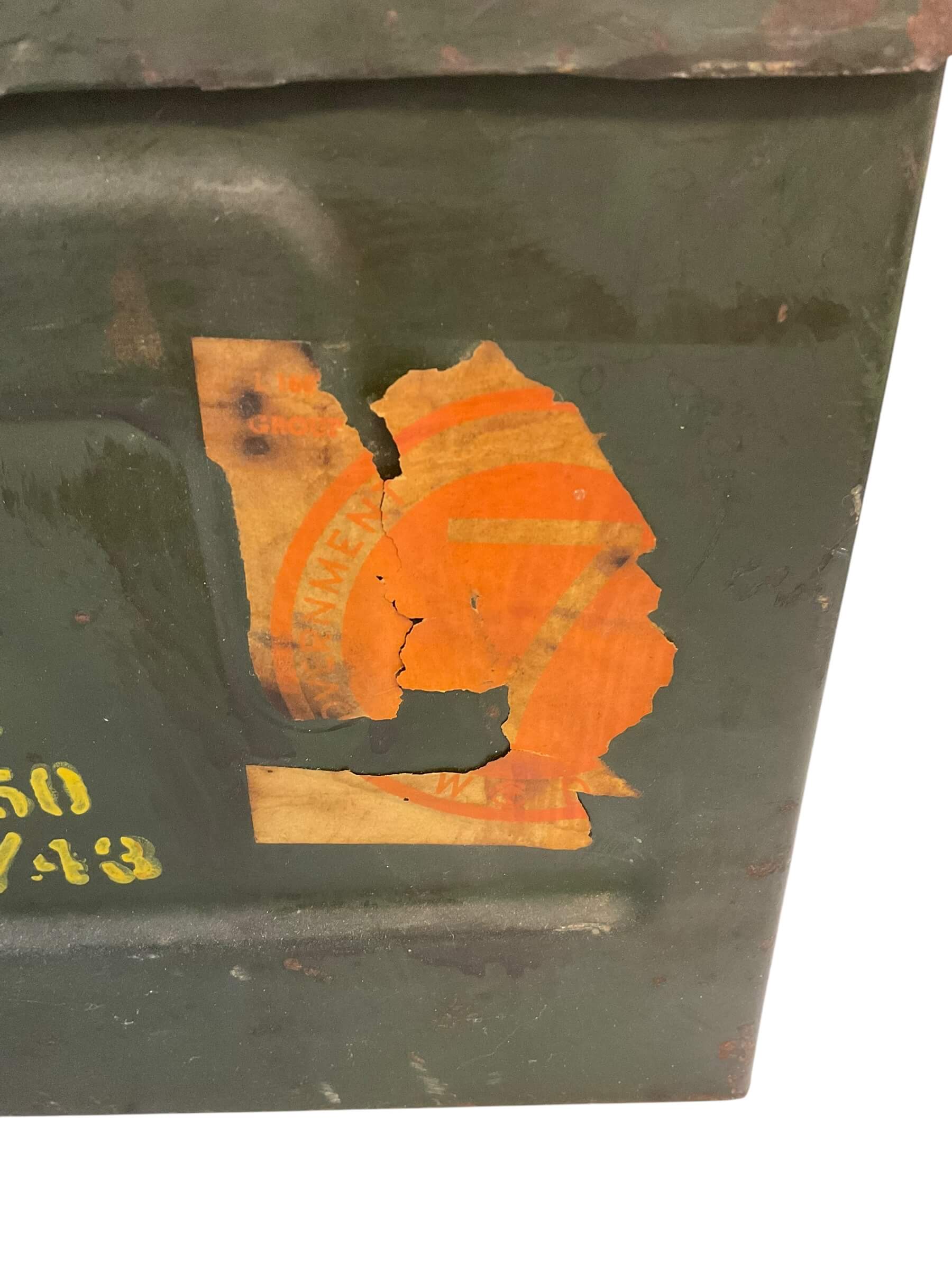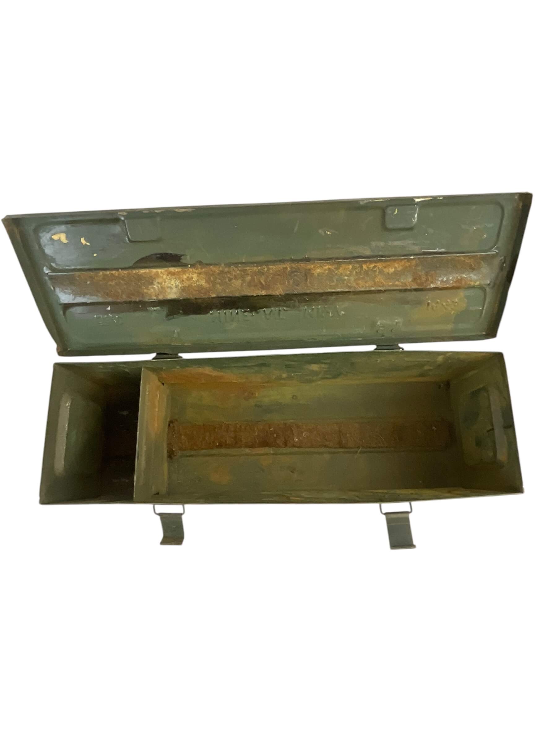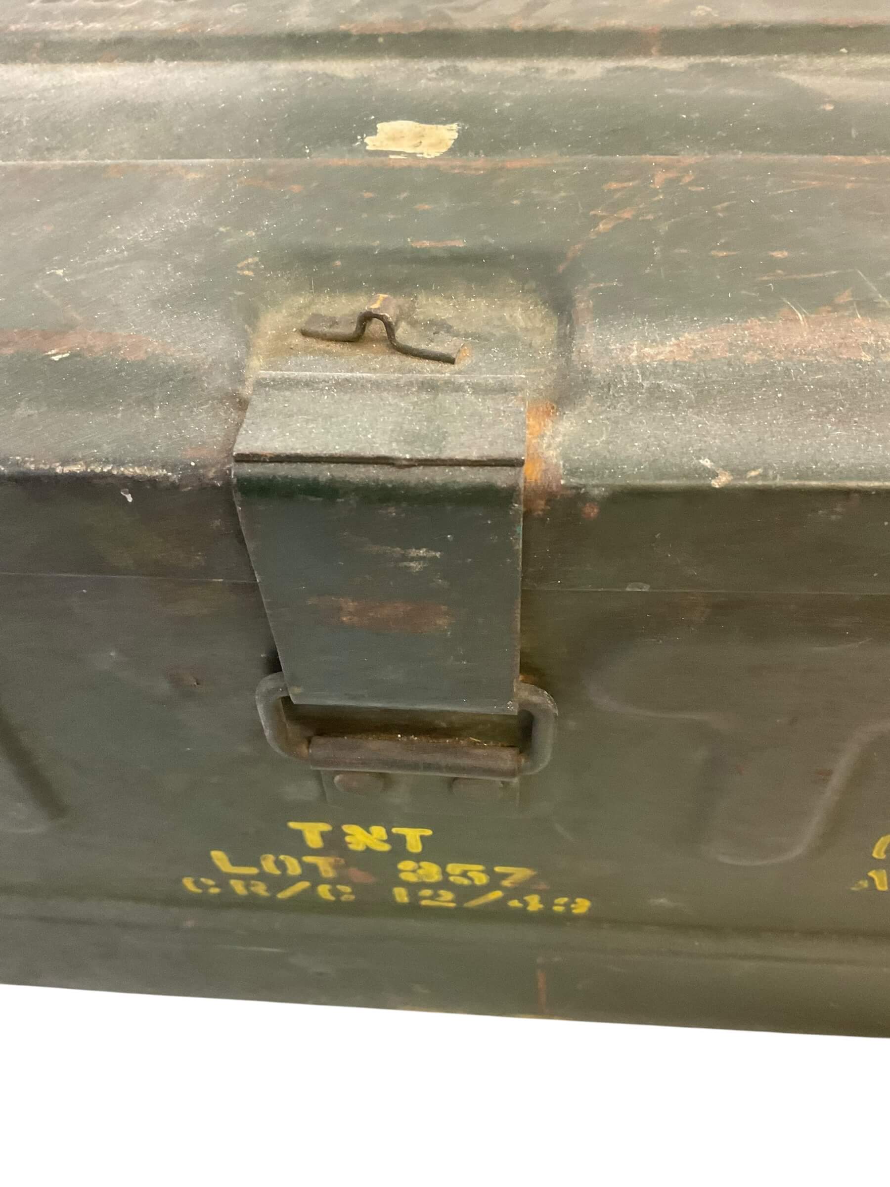 This item is an authentic WW2 Canadian Mine Anti-Tank Ammo Box, produced in 1943. Despite its age, the box has been well-preserved and retains its historic charm. The box is EMPTY, meaning it no longer contains the original ammunition. Crafted from robust, heavy-duty metal, it features a secure latch and a sturdy handle for portability. The exterior showcases the patina of time, with faint, weathered markings indicating its original military designation. This ammo box serves as a tangible piece of history, offering a glimpse into the experiences of Canadian soldiers during the Second World War. Whether for a military enthusiast or history collector, this item is a unique find, evoking a sense of nostalgia and respect for a bygone era. This ammo box is not only a historic artifact, but also an artistic object that tells a story of resilience, bravery, and sacrifice.