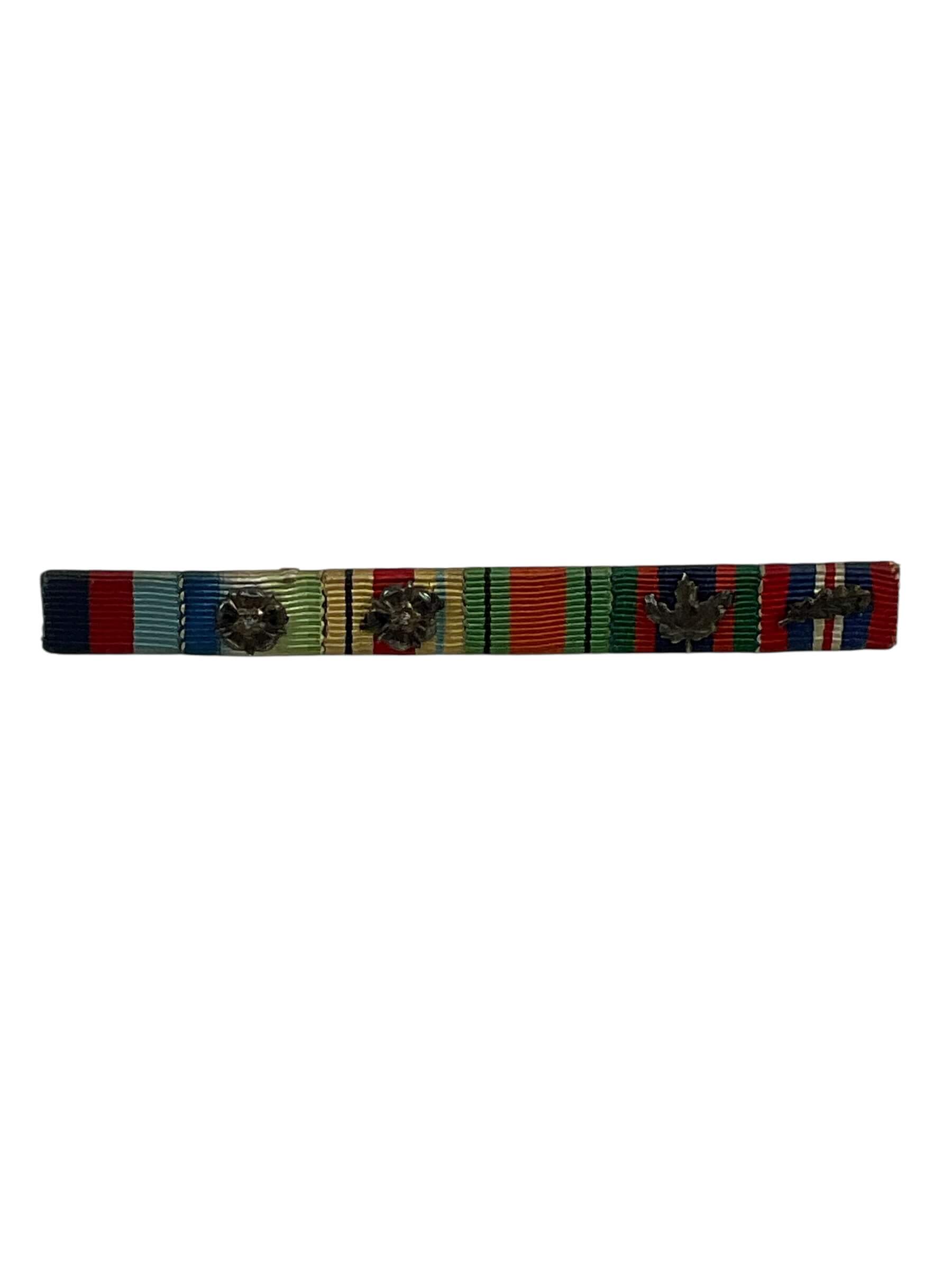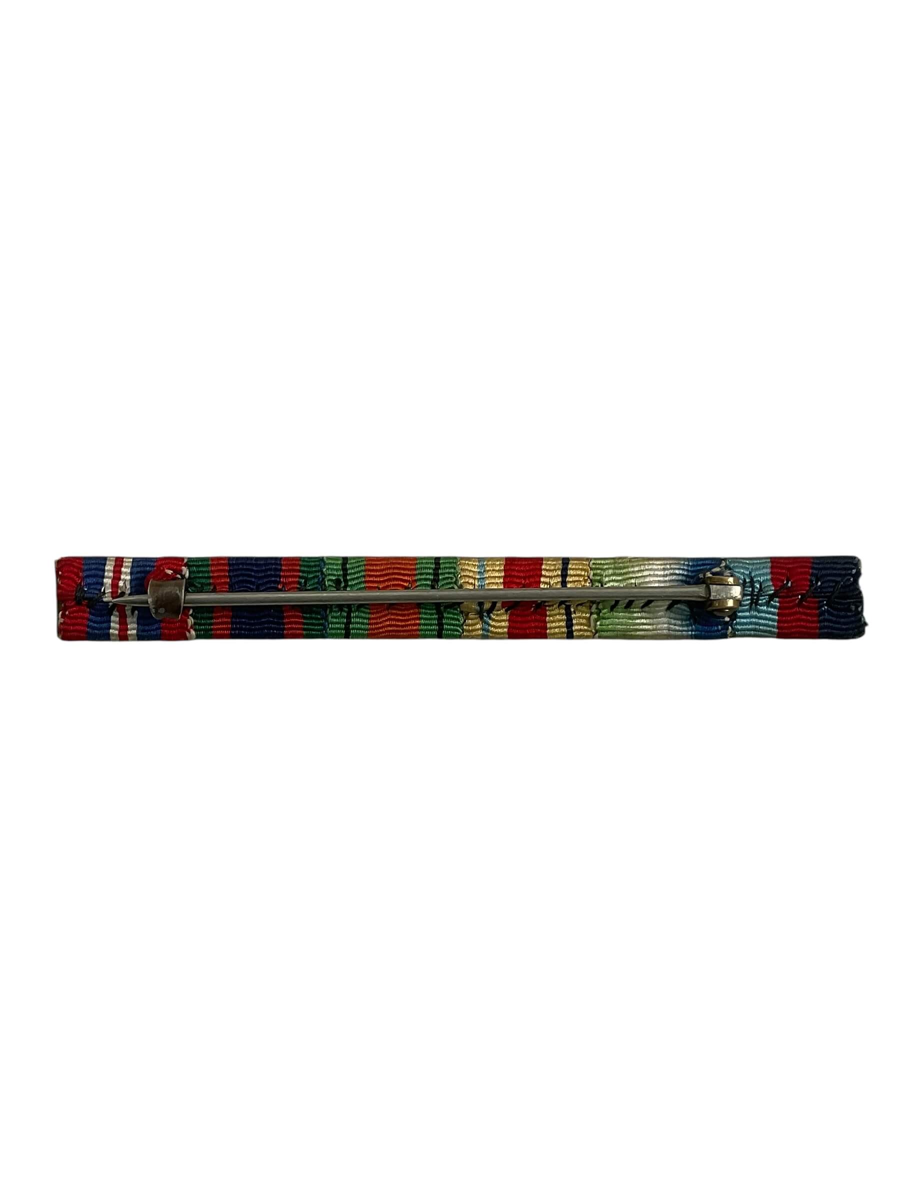 The WW2 Canadian Miniature Medal Ribbon Bar X 6 consists of six miniature ribbon bars representing various military decorations awarded to Canadian personnel during the Second World War. These ribbon bars were worn on the uniform in place of the full-sized medals, offering a compact and practical alternative for everyday use. Each ribbon measures approximately one-third the size of its corresponding full medal ribbon and features the appropriate colors and patterns to signify specific awards. The ribbons are mounted side by side on a metal bar for neat attachment to the uniform. Items of this type provide a visual record of an individual’s service and commendations during the war. Collecting miniature ribbon bars is of interest for researchers and collectors focusing on Canadian military history, insignia, and the recognition of service. This set is suitable for reference, display, or as part of a broader collection of World War II military memorabilia from Canada.