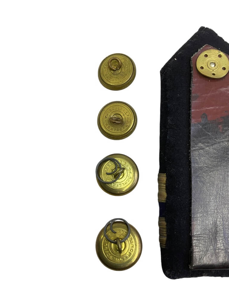 This collection includes a WW2 Canadian Navy Officers Cap Badge and Shoulder Board, both rich in historical significance. The cap badge, intricately designed with the Canadian Navy’s emblem, features a detailed image of the crown, a lion, and the anchor, symbolizing the naval strength of Canada during WW2. The badge is meticulously crafted from a blend of metals, giving it durability and an authentic vintage feel. Accompanying the badge is a shoulder board, adorned with distinct markings and symbols used to denote rank during the wartime. Made from a sturdy cloth material, it showcases a combination of gold and silver threads beautifully woven into its design. Both items bear a testament to the courage and honor of the Canadian Navy officers who served during the Second World War. They represent a significant part of Canada’s military history and make a valuable addition to any military memorabilia collection.