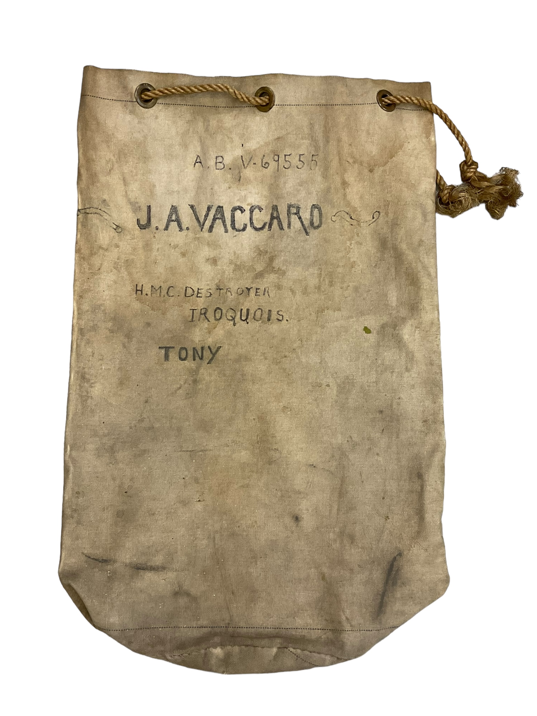 Relive a piece of naval history with this exquisite WW2 Canadian Navy RCN HMCS Iroquois Named Small Duffle Bag. This unique duffle bag, once belonging to a crew member of the HMCS Iroquois—a Tribal-class destroyer famed for its service during World War II—exudes authenticity and nostalgia. Crafted durable materials, the bag features the name of its original owner, adding a personal touch to its storied past. Whether you’re a military memorabilia collector, a history enthusiast, or simply seeking a distinctive travel companion, this duffle bag is a remarkable artifact. Its compact size ensures practicality for everyday use while serving as a poignant reminder of the bravery and dedication of the Royal Canadian Navy during one of the most significant conflicts of the 20th century. Don’t miss this chance to own a tangible piece of Canadian naval history.