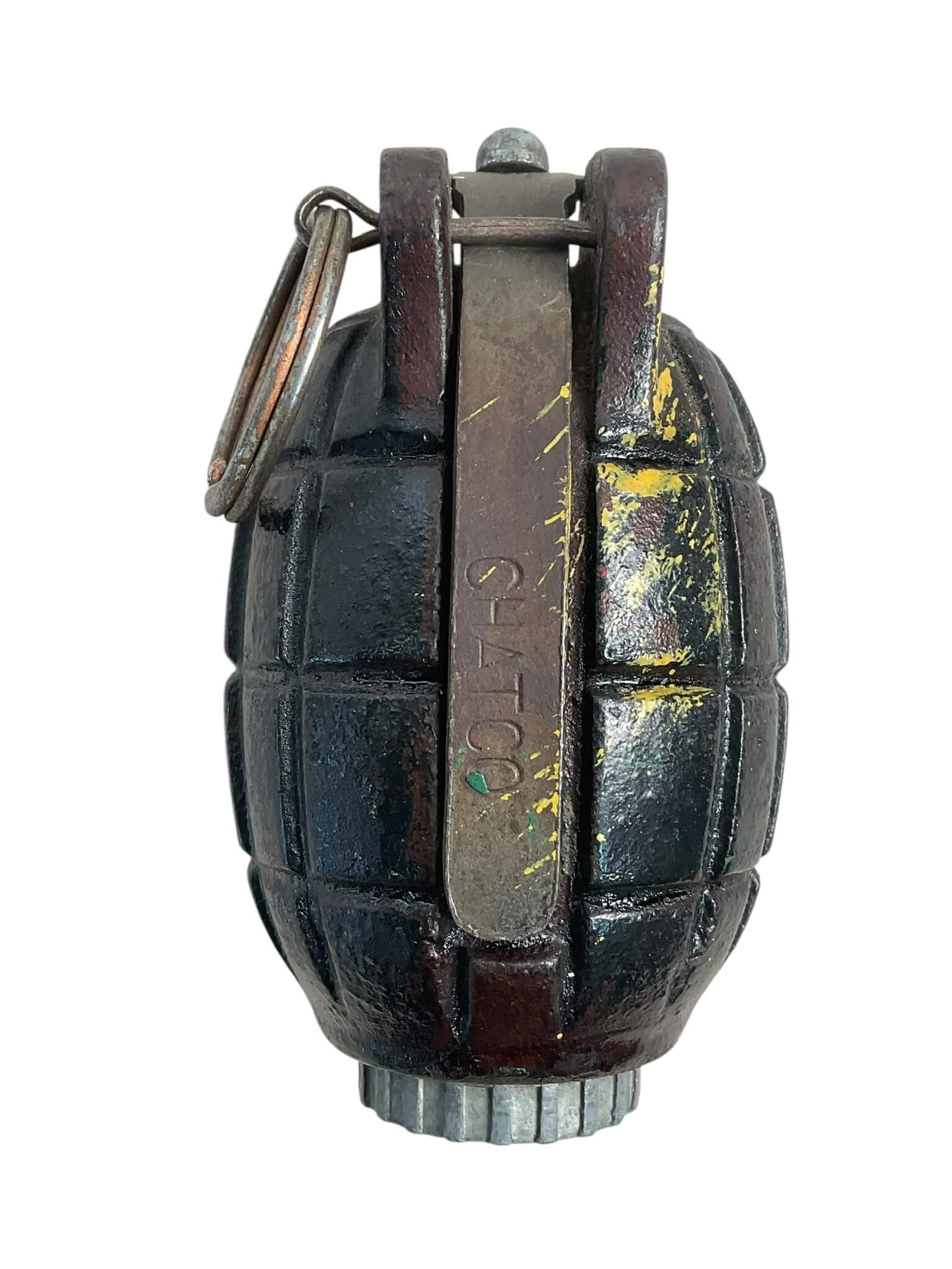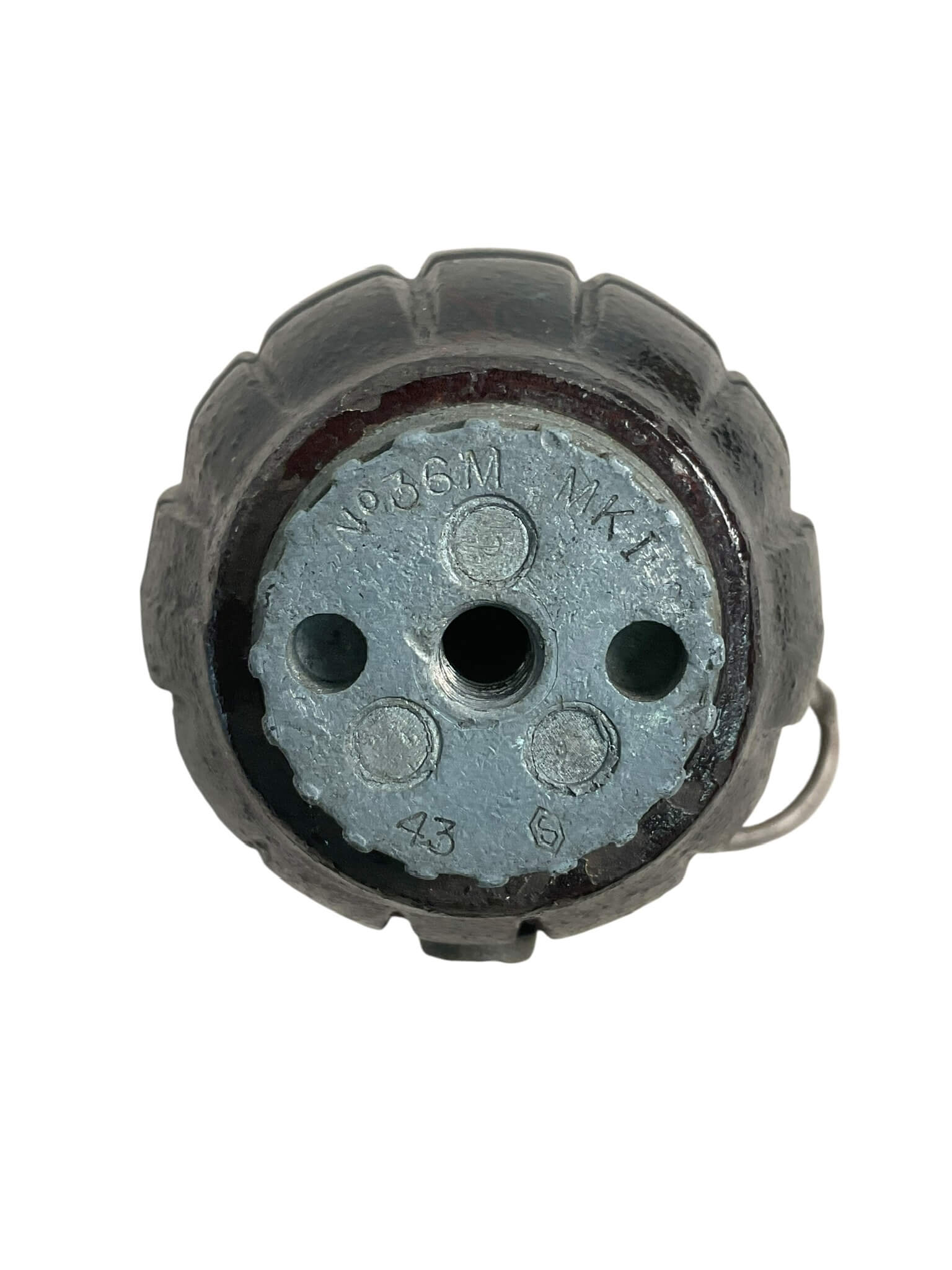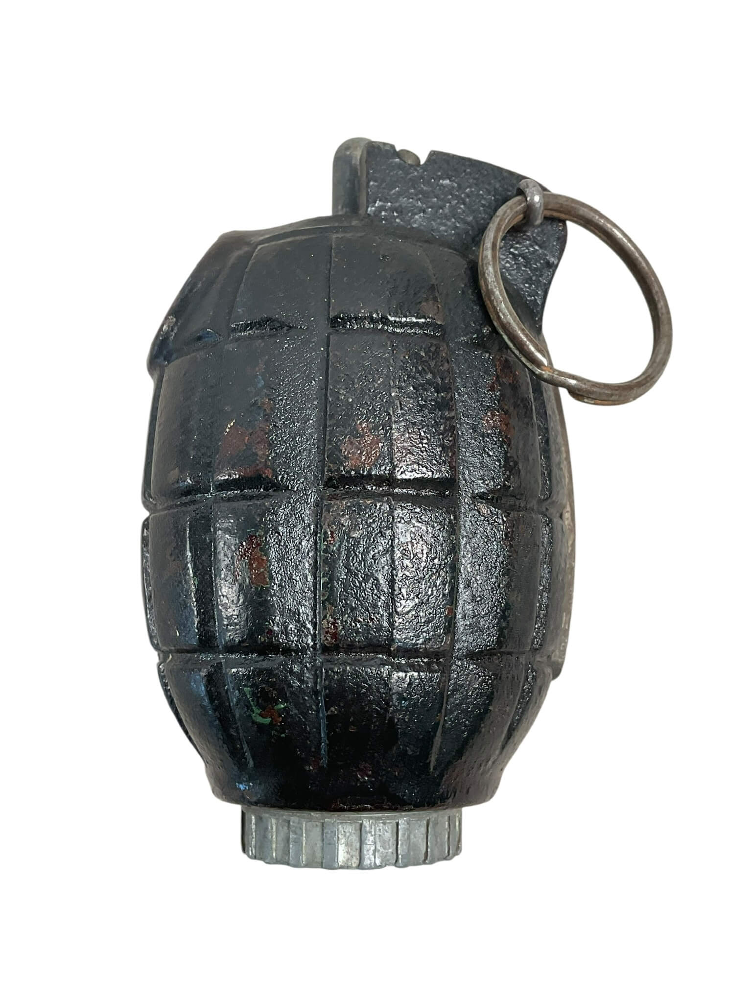 The WW2 Canadian No 36 Mills Chatco INERT is an original, historical military artifact from World War II. Manufactured by Chatco in Canada, this inert No 36 Mills grenade showcases authentic detailing and materials of the period. Noted for its relevance to war memorabilia collectors, it is no longer functional for safety reasons.