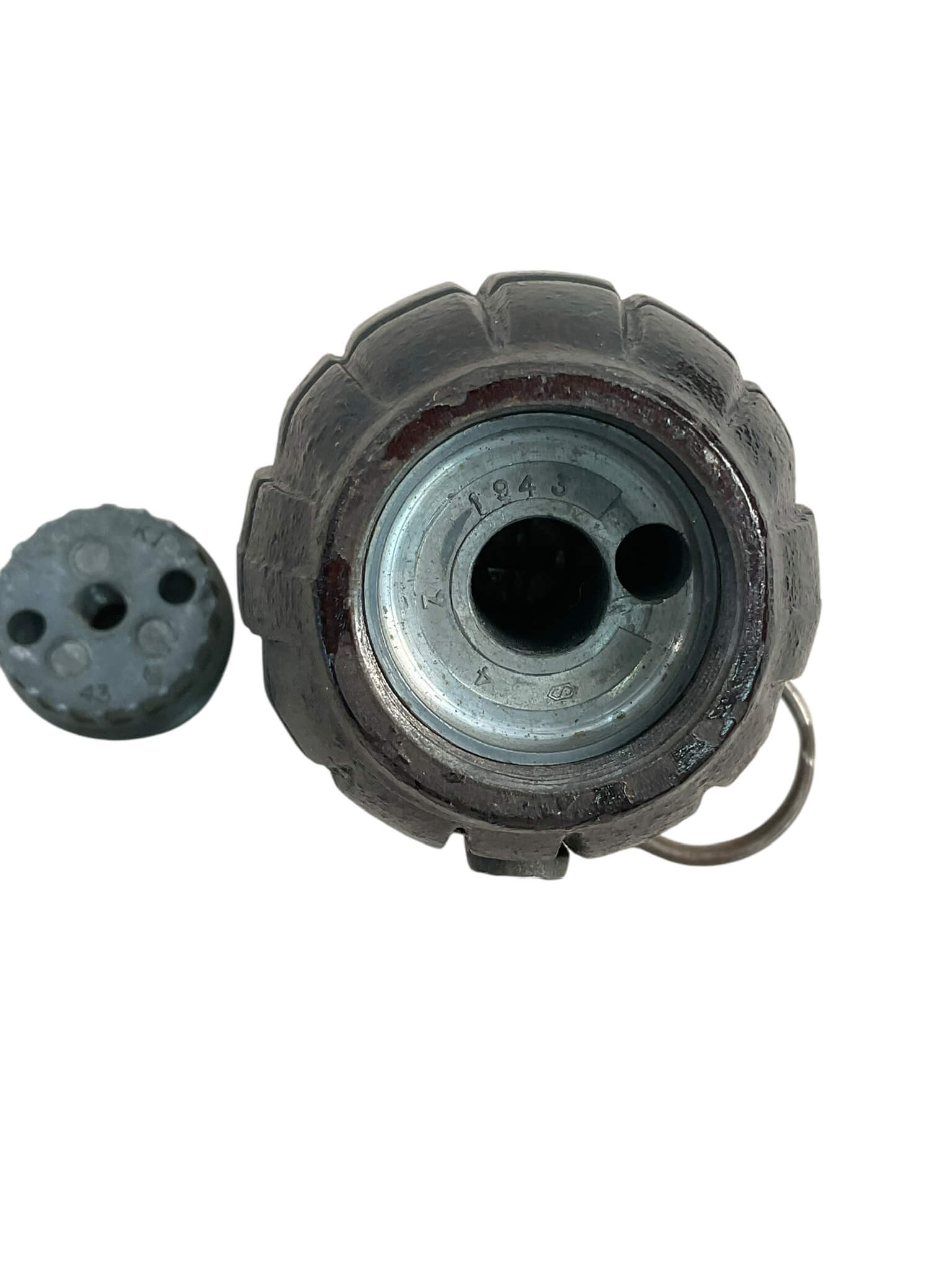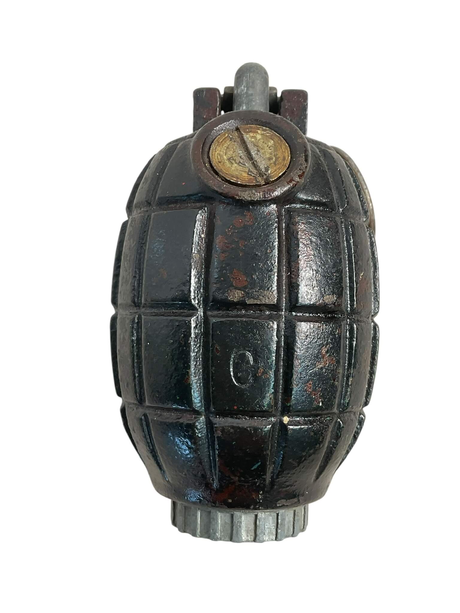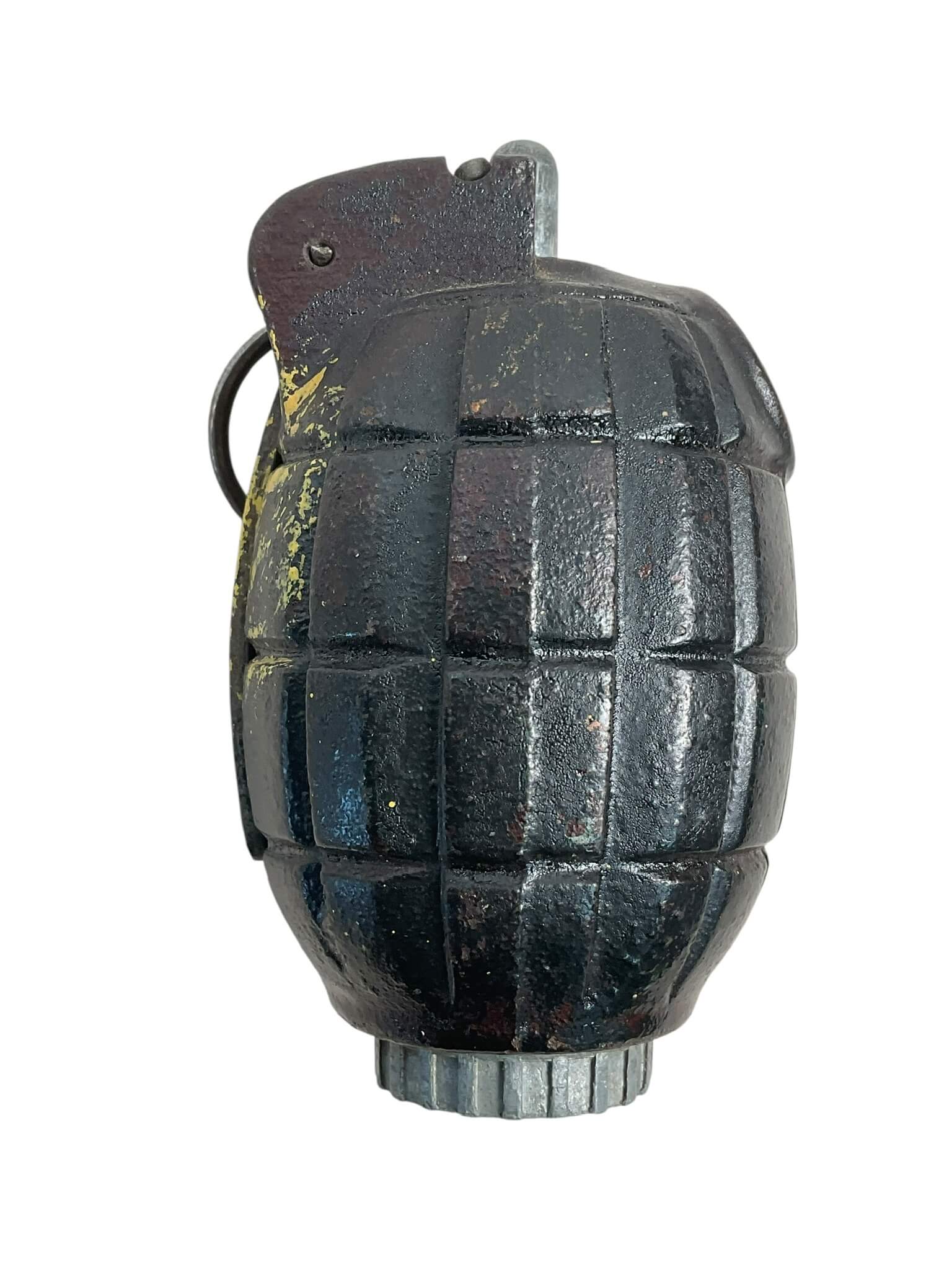 The WW2 Canadian No 36 Mills Chatco INERT is an original, historical military artifact from World War II. Manufactured by Chatco in Canada, this inert No 36 Mills grenade showcases authentic detailing and materials of the period. Noted for its relevance to war memorabilia collectors, it is no longer functional for safety reasons.