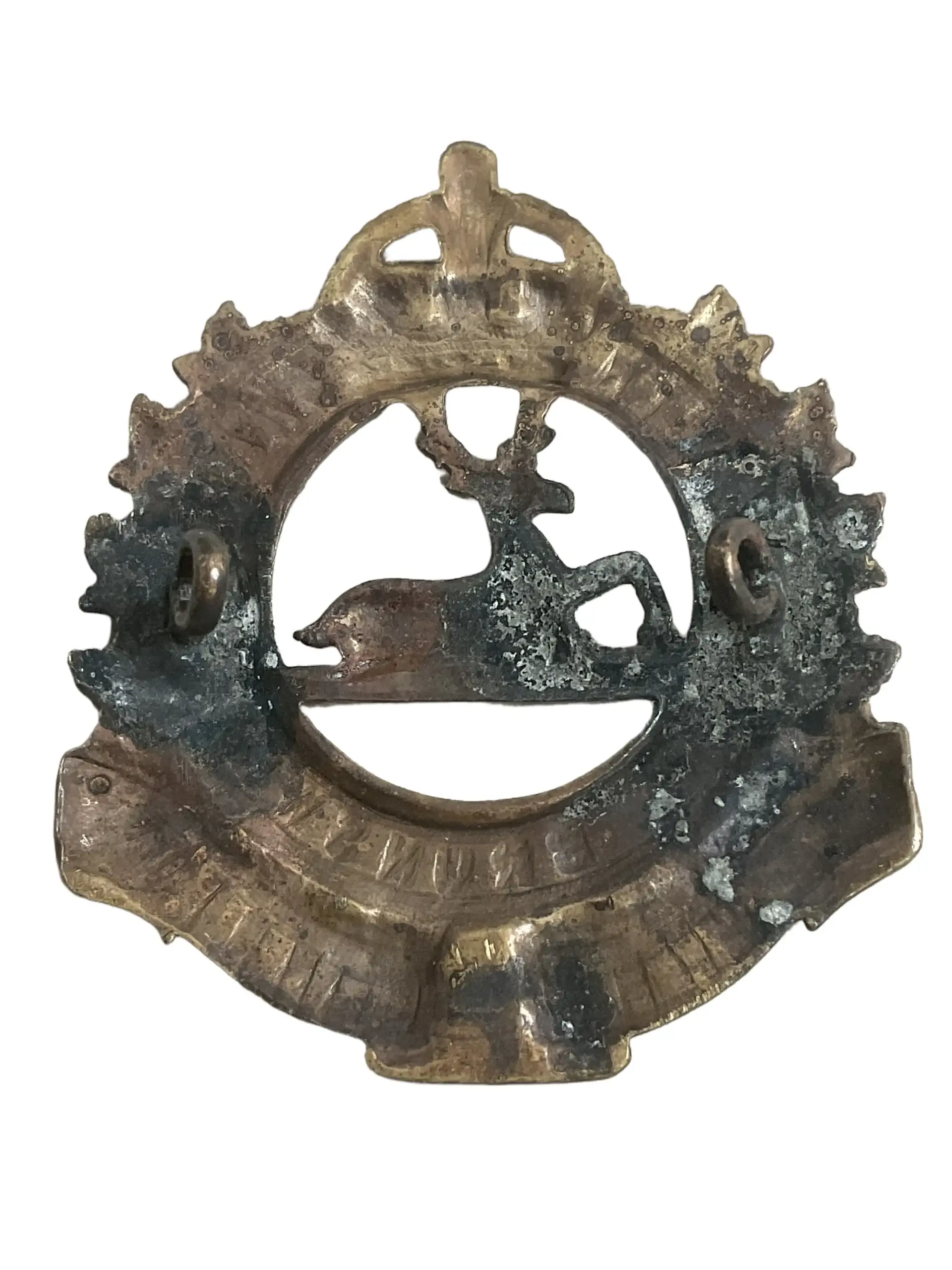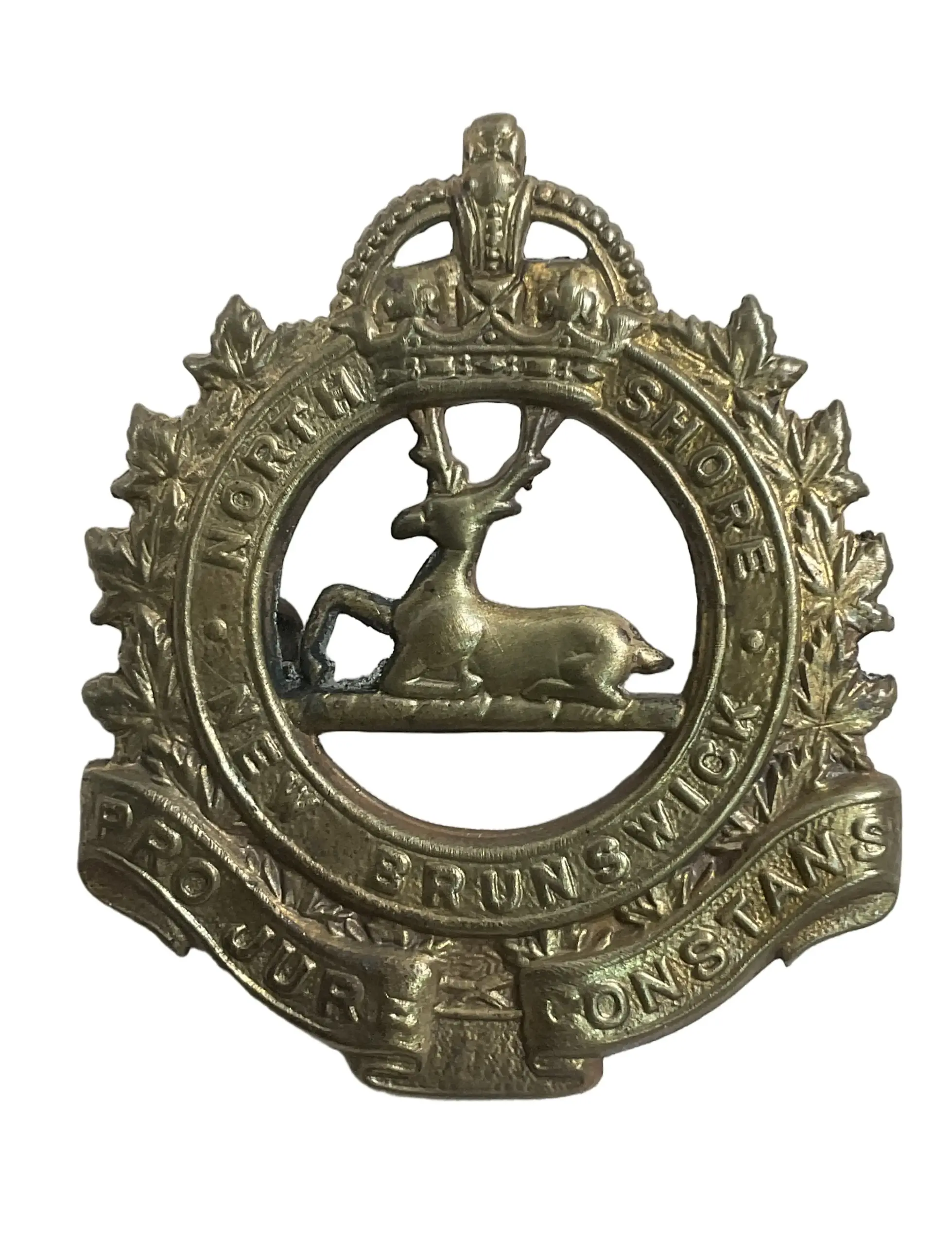 The WW2 Canadian North Shore New Brunswick Cap Badge is an authentic military insignia issued to members of the North Shore (New Brunswick) Regiment during the Second World War. The badge is constructed of brass and features distinctive elements such as the regimental emblem, which typically includes a beaver above a scroll inscribed with “North Shore (N.B.) Regt.” and is surmounted by a crown, signifying loyalty to the British Crown. This cap badge was worn by regiment personnel on the service headdress as a part of their standard uniform. The North Shore (New Brunswick) Regiment served notably in the Normandy landings and subsequent North-West European campaigns. The design and manufacture of the badge were regulated by Canadian military specifications in the 1940s. The badge’s reverse generally includes lugs or a slider for attachment. This item is a representative artifact of Canadian military history and regimental identity in the Second World War.