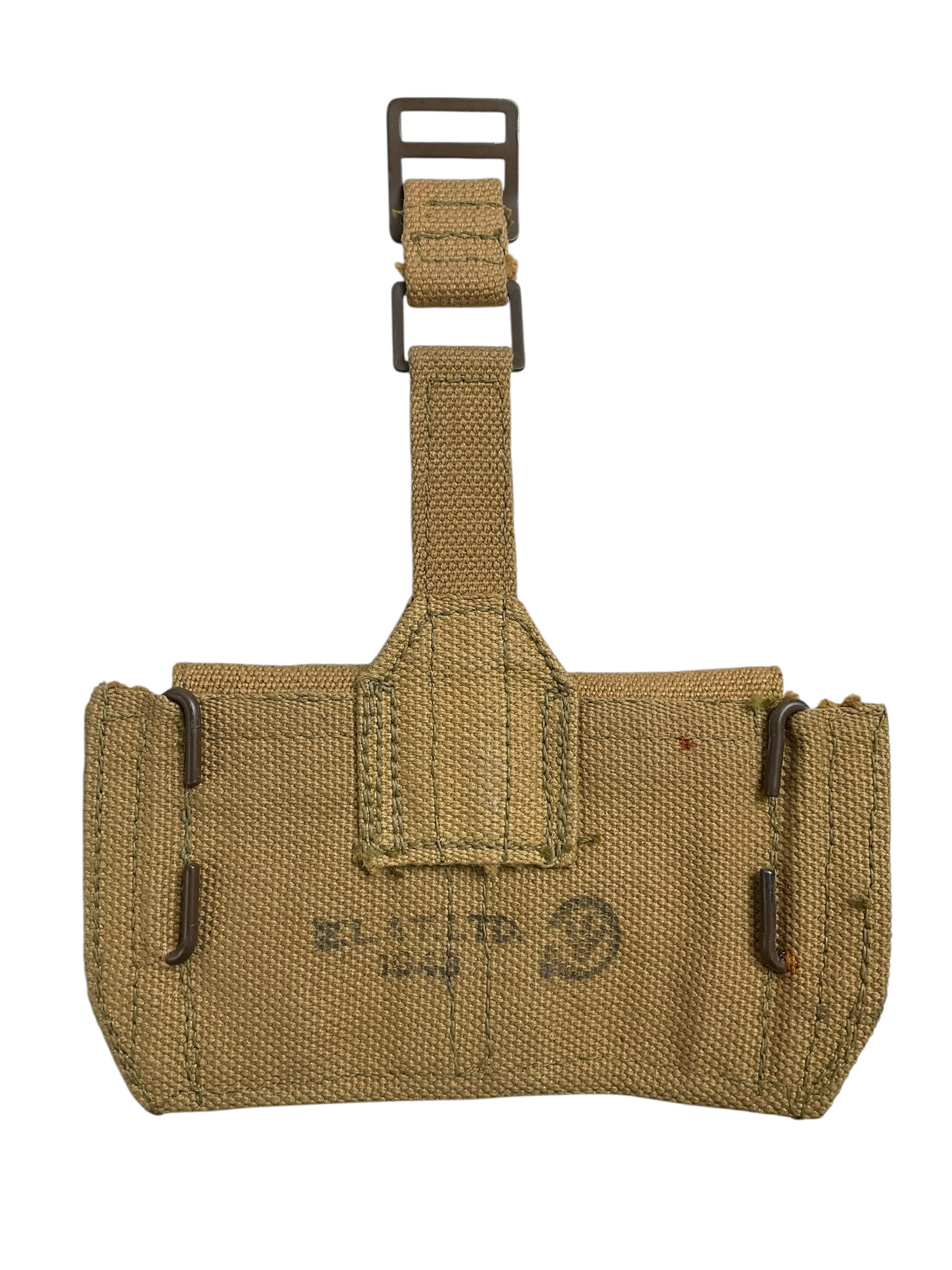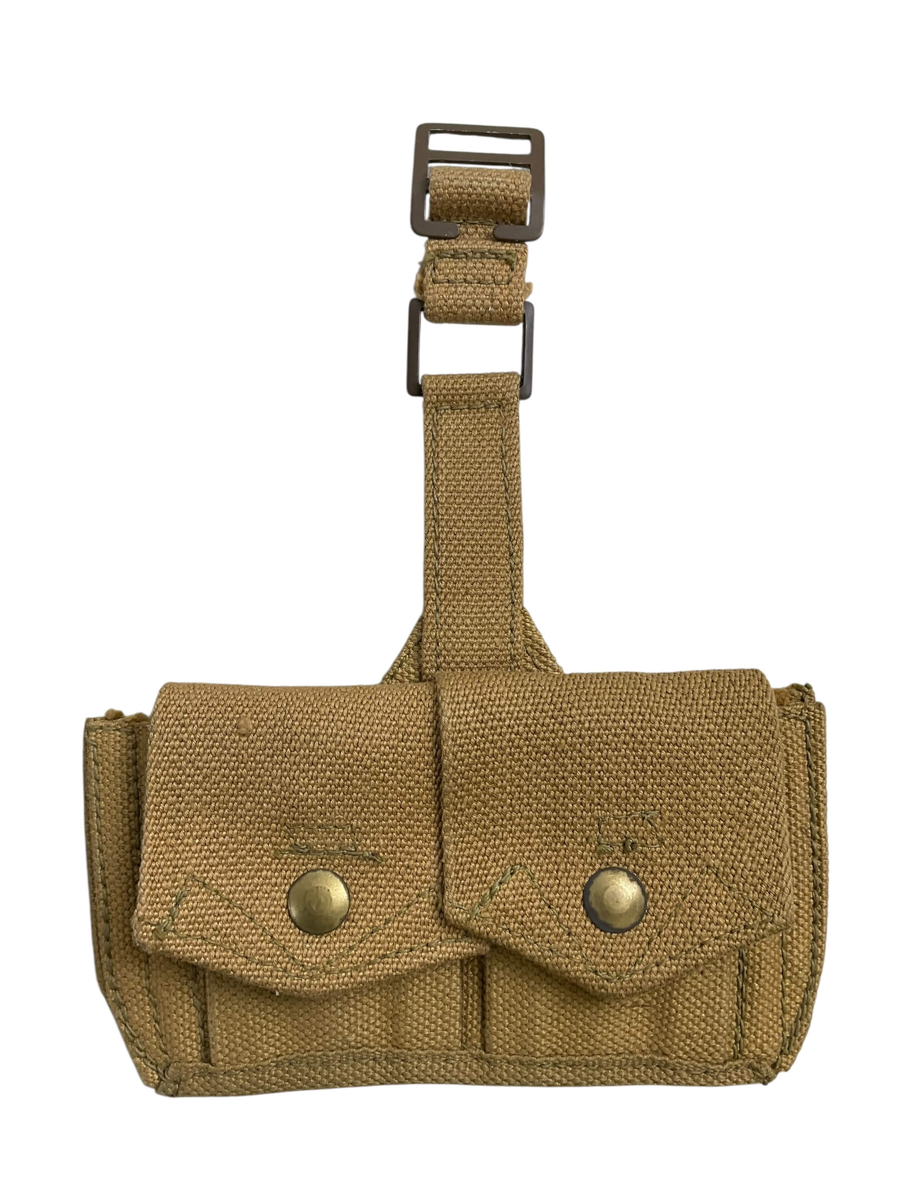This offering is an exquisite pair of WW2 Canadian P37 Ammo Pouches, dated 1943. Embellished with the iconic C Broad Arrow – a symbol of Canadian military equipment – these pouches are steeped in historical significance. They were specifically designed to hold ammunition for the soldiers on the front lines, a testament to their essential role during the war. This pair is in remarkable condition given its age, with the robust canvas material showing minimal signs of wear. These pouches reflect the rigorous standards of wartime production, with solid stitching and metal fixtures. The 1943 date stamp and C Broad Arrow mark authenticate these pouches, making them a valuable addition to any military memorabilia collection or historical display. A tangible piece of Canadian World War II history, these P37 ammo pouches offer a unique glimpse into the past.