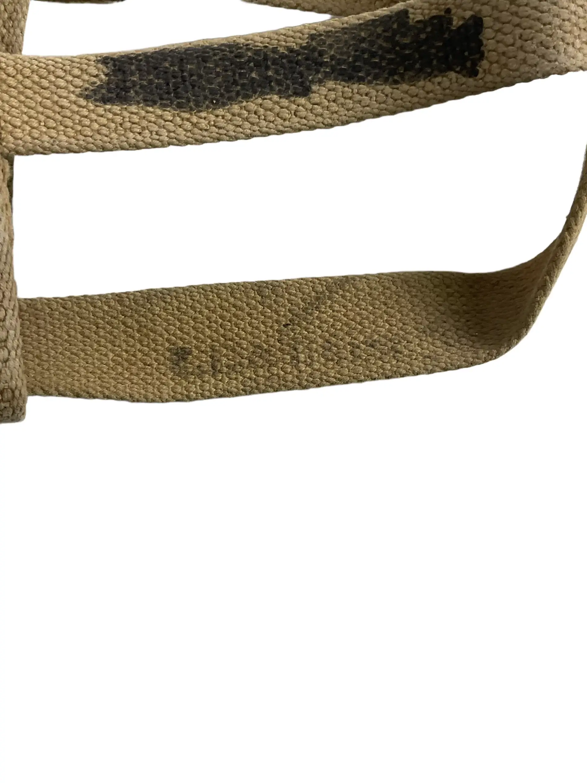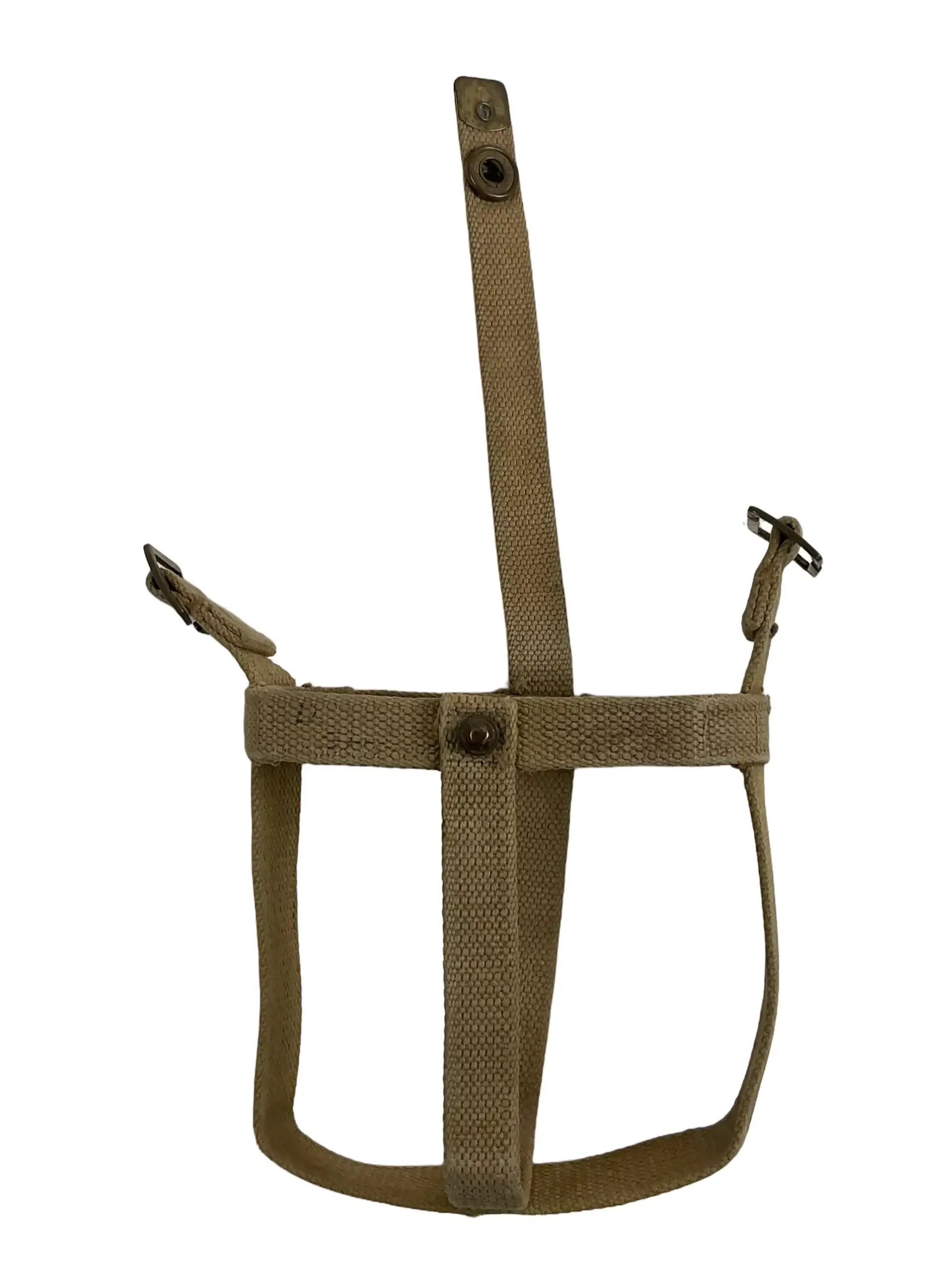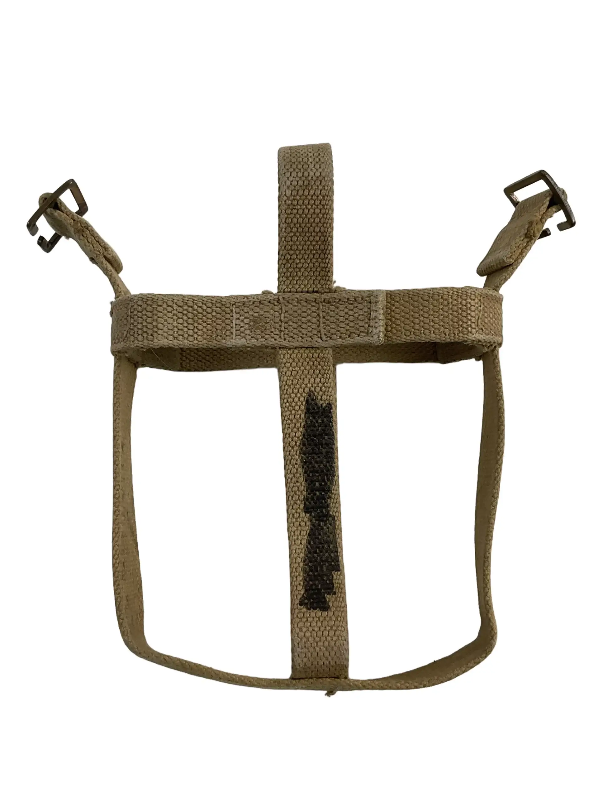 The WW2 Canadian P37 Web Skeleton Water Bottle Canteen Carrier is an original piece of military webbing equipment issued to Canadian forces during the Second World War. Designed as part of the Pattern 1937 (P37) webbing system, this carrier was intended to securely hold the standard-issue enamel or aluminum water bottle. Constructed from durable khaki cotton webbing, the “s