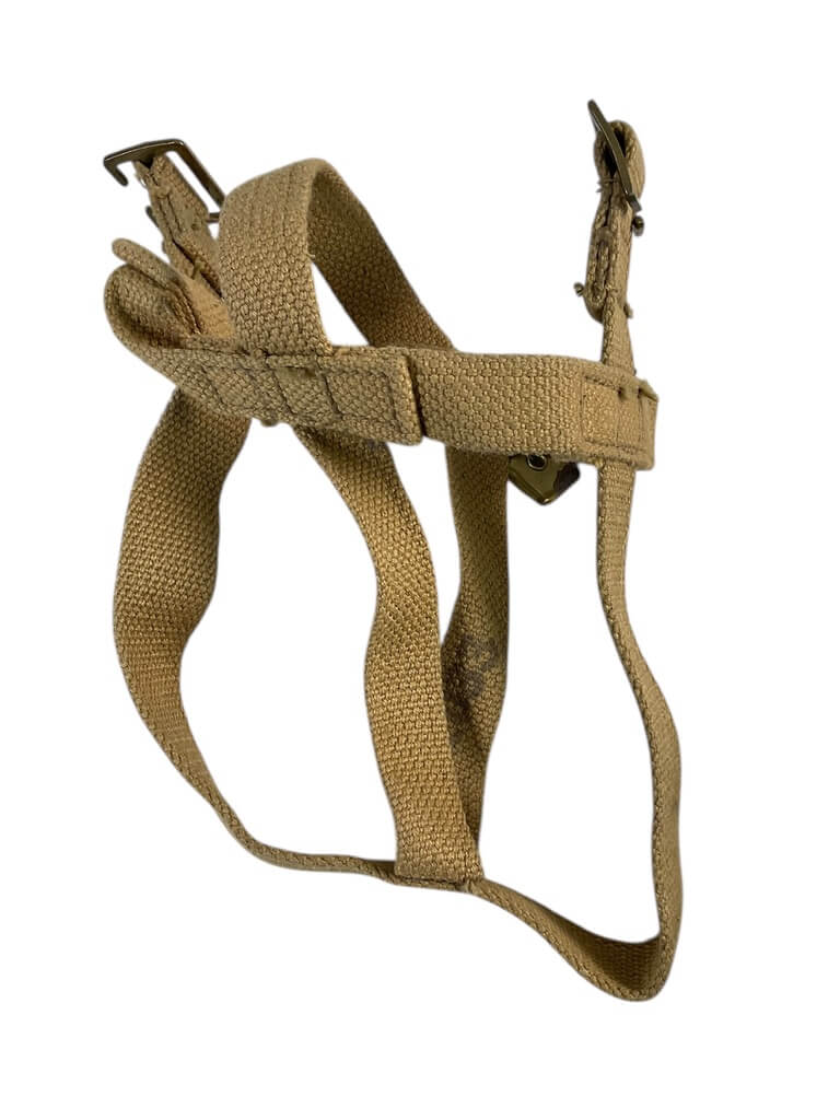 The WW2 Canadian P37 Web Skeleton Water Bottle Canteen Carrier is an original piece of military equipment issued to Canadian forces during the Second World War. Constructed from durable webbing material, the carrier is specifically designed to hold the standard-issue water bottle, ensuring secure transport on the soldier’s web gear. This model, known as the “skeleton” carrier, utilizes an open framework for reduced weight and improved ventilation around the canteen. The carrier features the characteristic “C” mark, denoting Canadian manufacture, as well as the British Broad Arrow stamp, indicating government property. Its adjustable web straps and metal fittings allowed it to be easily attached to the P37 webbing set. The design reflects utilitarian wartime requirements, emphasizing practicality and standardization across Commonwealth armies. This carrier is representative of field gear widely used throughout various theaters of war by Canadian military personnel during the 1940s.