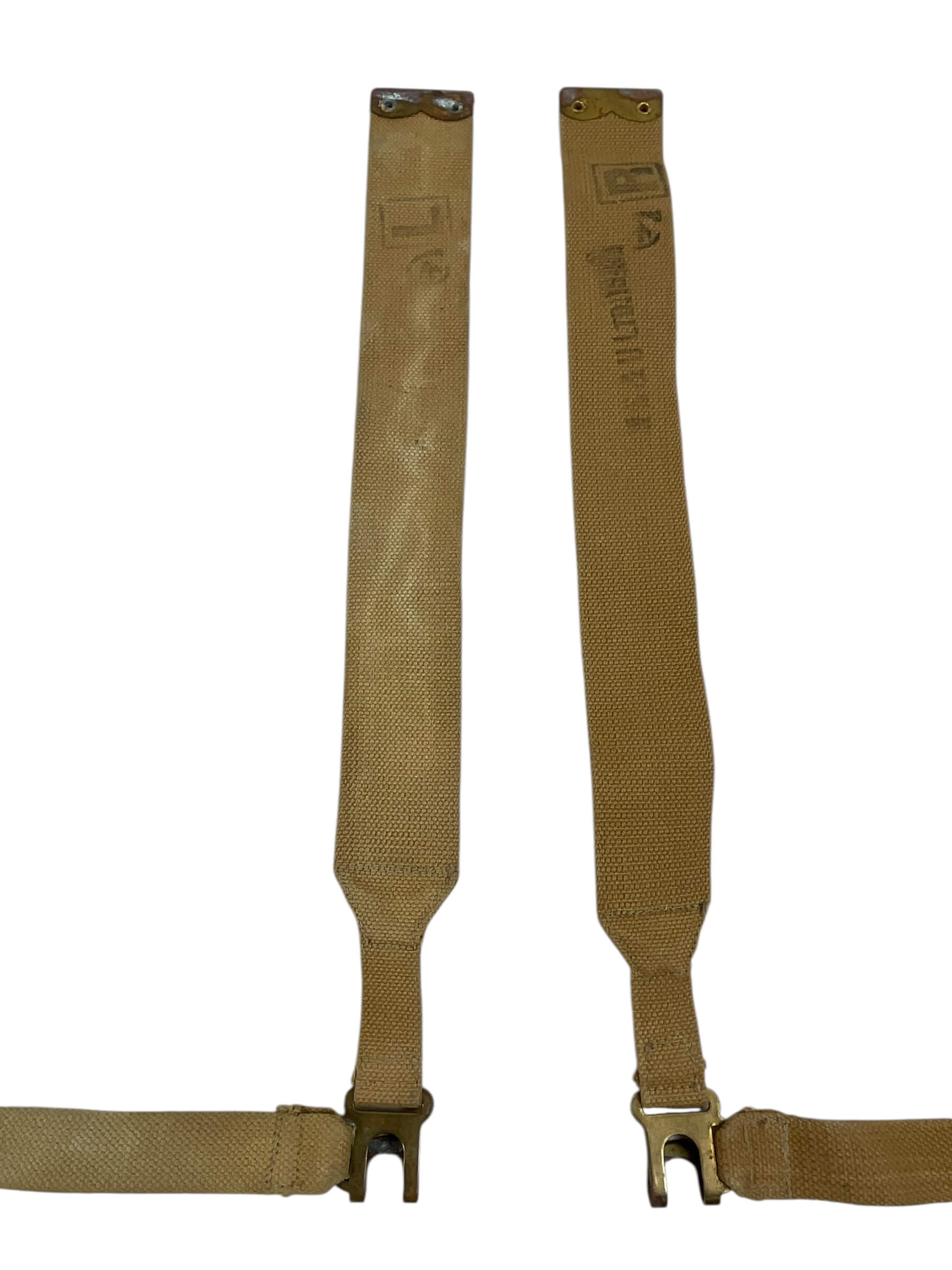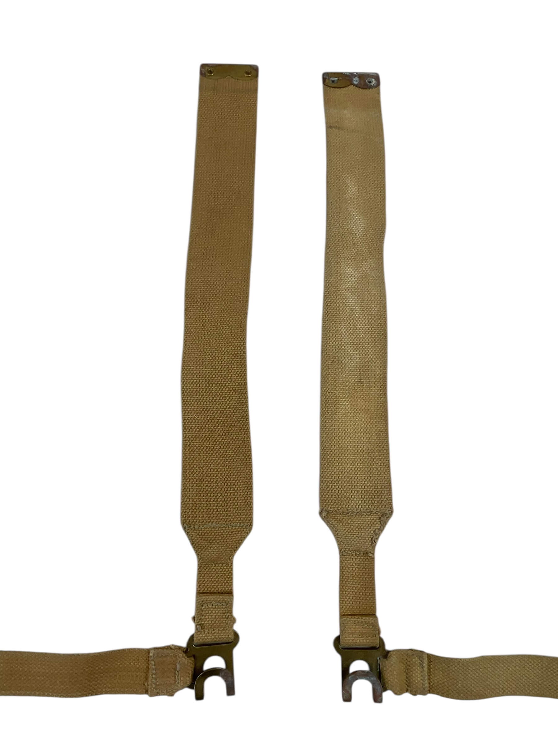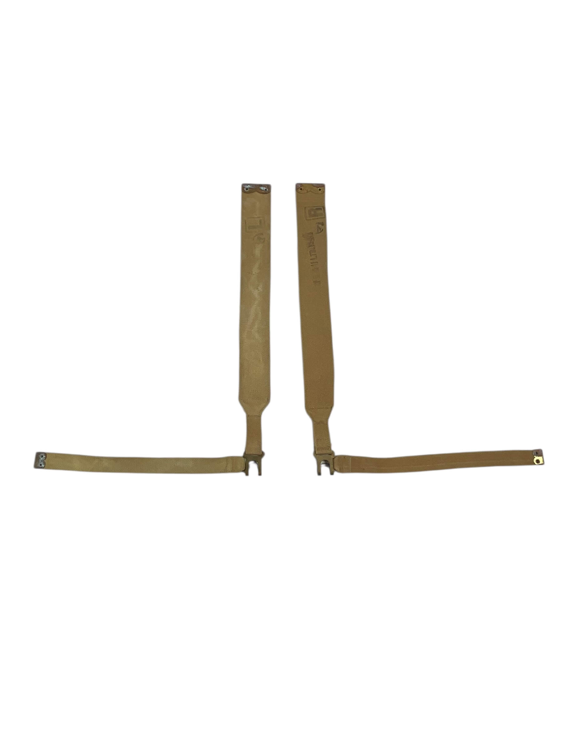 This product features a pair of WW2 Canadian P37 Webbing L Straps, a vital piece of military kit used extensively during the Second World War. Made with high-quality, durable fabric, these authentic straps were designed to attach to the P37 webbing system, used by Canadian soldiers to carry their equipment in the war. The L-shaped design ensures a more secure and stable attachment, providing the wearer with increased comfort and mobility. These straps are historically accurate, making them ideal for collectors, reenactments, or anyone with an interest in military history. This pair of straps retains their original integrity and functionality, offering a true glimpse into the past.