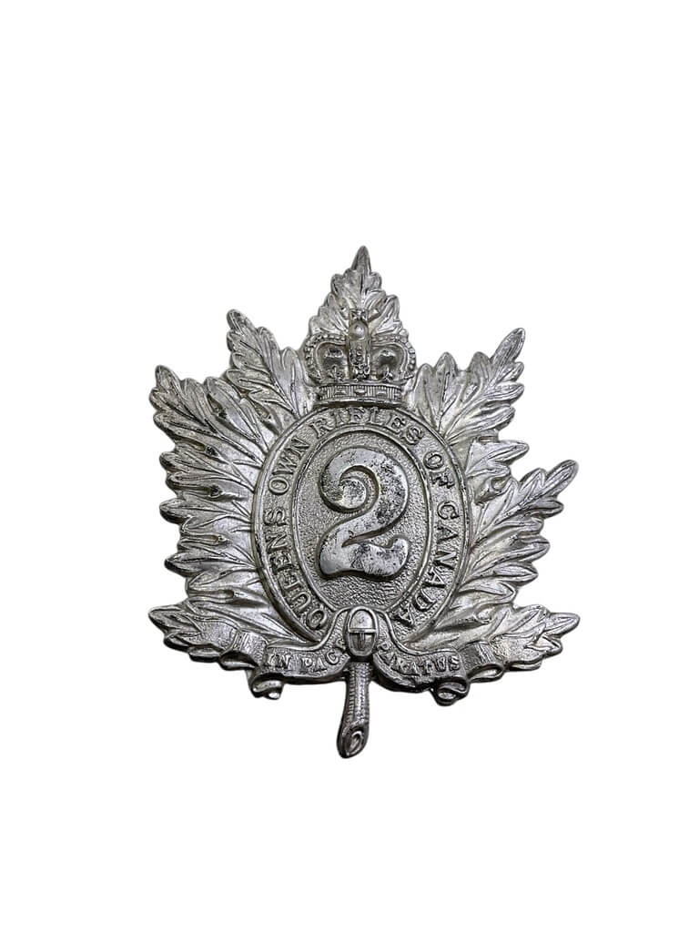 This title refers to an authentic piece of military memorabilia, the WW2 Canadian Queen’s Own Rifles of Canada QOR Silver Officers Cap Badge. This emblem signifies the Queen’s Own Rifles (QOR) of Canada, a distinguished primary reserve infantry regiment based in Toronto. The badge, made of silver, would have been worn by officers during World War II as an essential part of their uniform. It displays the regiment’s insignia, a complex design that includes the distinct elements of the regiment’s rich history and heritage. As a genuine artifact from the WWII era, it offers a direct connection to the past, making it a valuable collectible for military enthusiasts, historians, or anyone who appreciates unique historical items. It’s a testament to the bravery and honor of the officers who served Canada during one of the most challenging periods in world history.