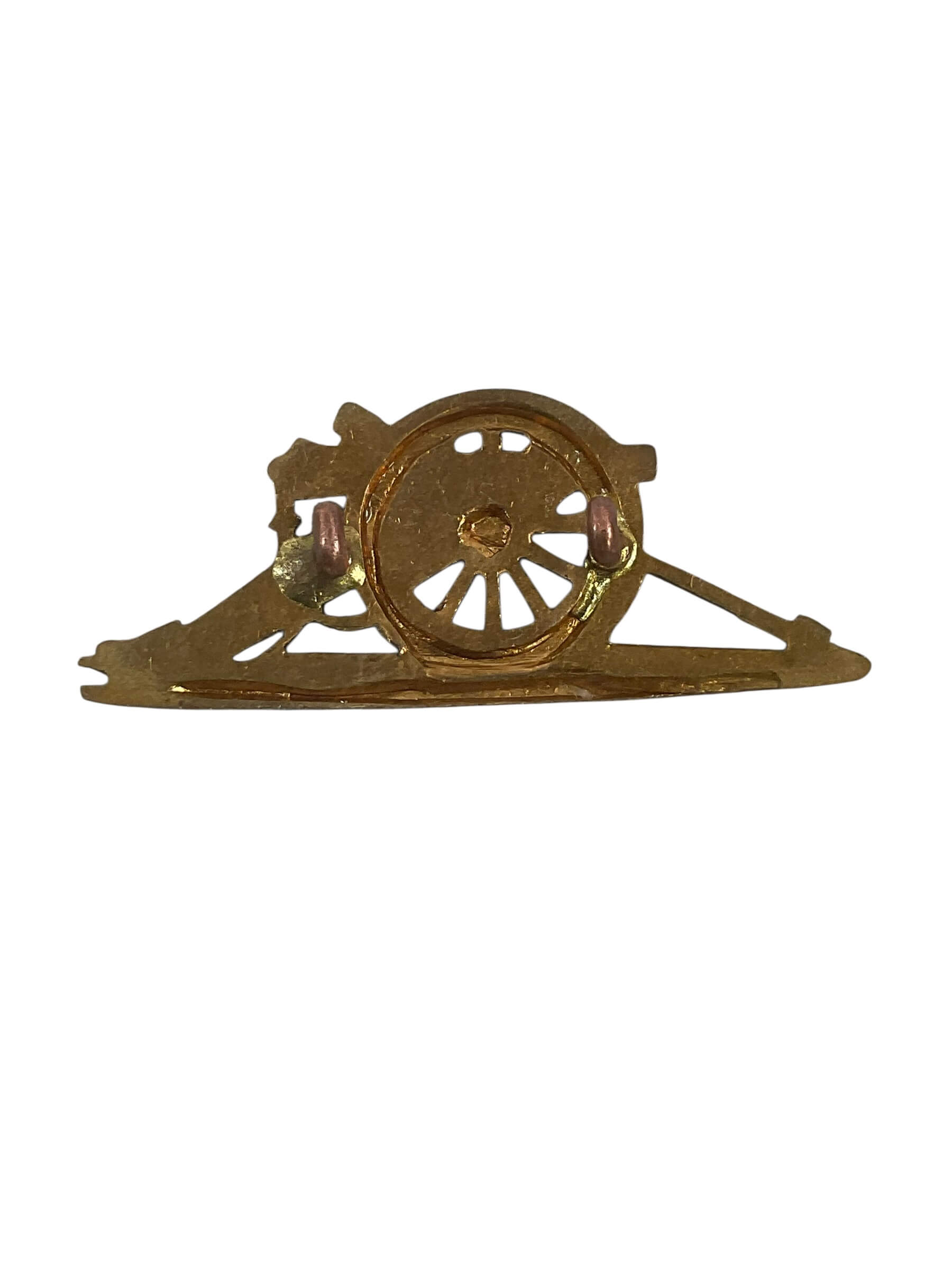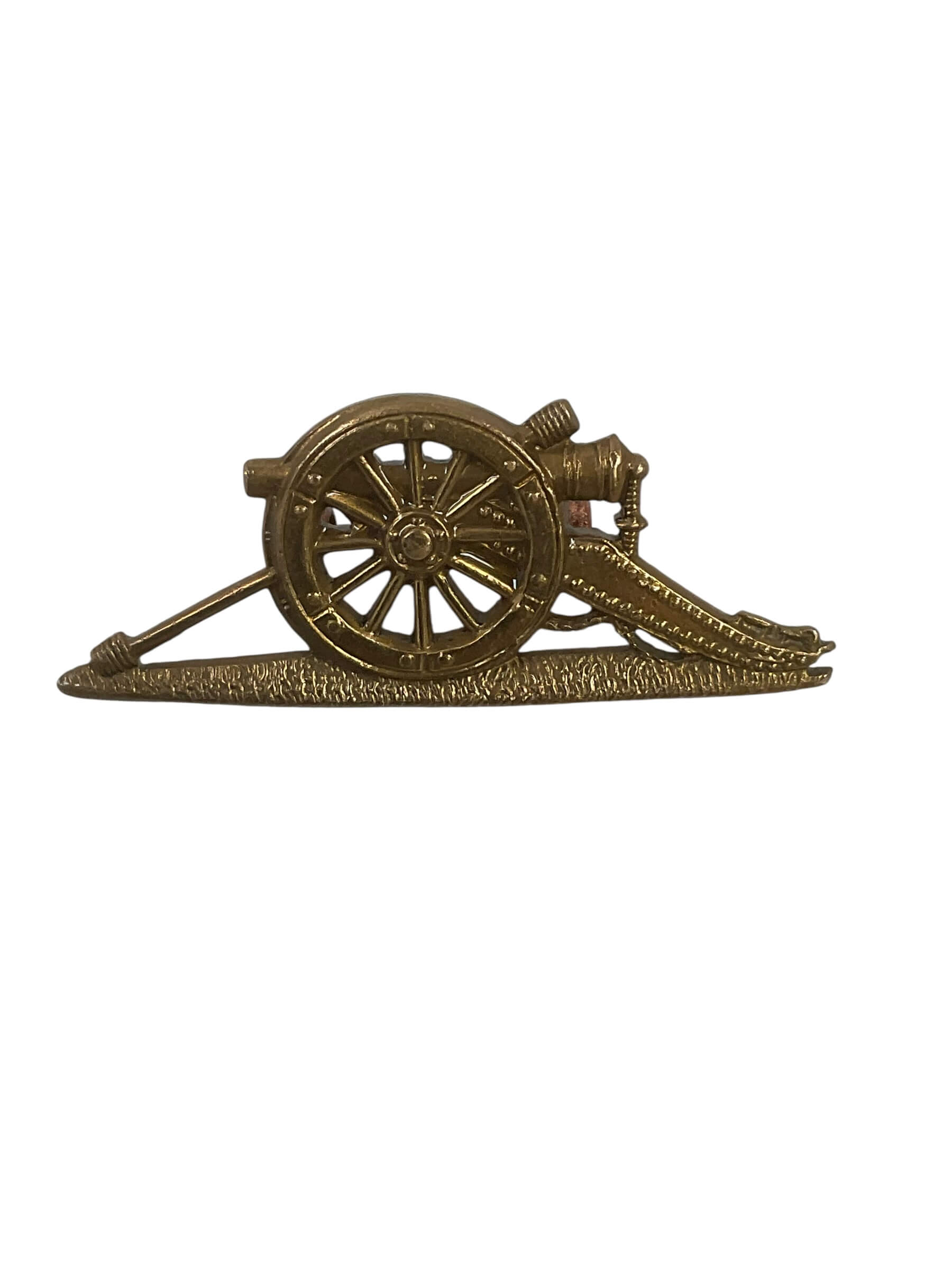 The WW2 Canadian RCA Artillery Master Gunner Badge is a qualification insignia issued to members of the Royal Canadian Artillery during the Second World War. This badge was awarded to gunners who achieved the rank of Master Gunner, recognizing advanced training and expertise in artillery operations, procedures, and leadership. Typically constructed of khaki wool or cloth, the badge features an embroidered design depicting a single grenade above a pair of crossed cannons, symbolizing artillery proficiency and authority. The insignia was worn on the lower sleeve of the service dress uniform, signifying the wearer’s qualification and specialized role within the unit. Such badges reflect the system of trade and rank distinction used by the Canadian military during the 1939–1945 period. The WW2 Canadian RCA Artillery Master Gunner Badge is a significant representation of Canadian artillery history and uniform insignia from the era.