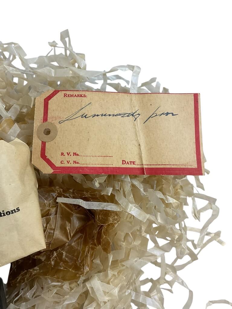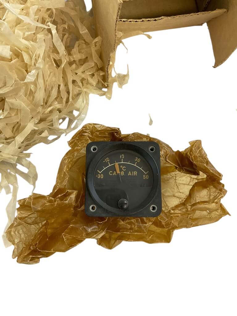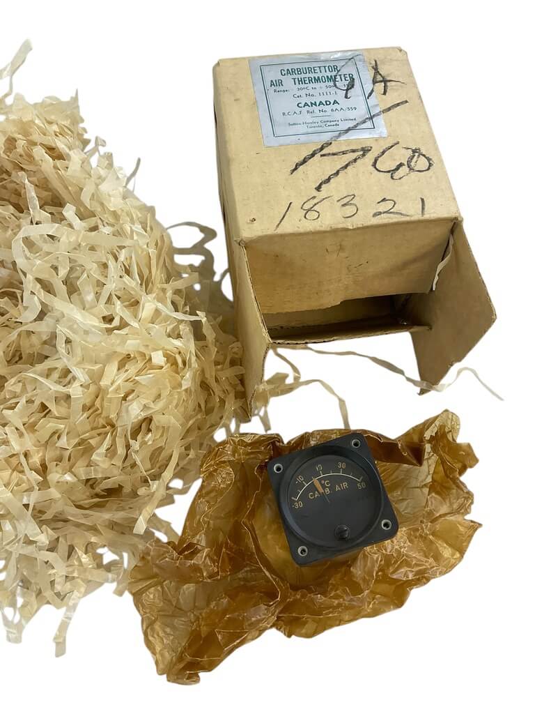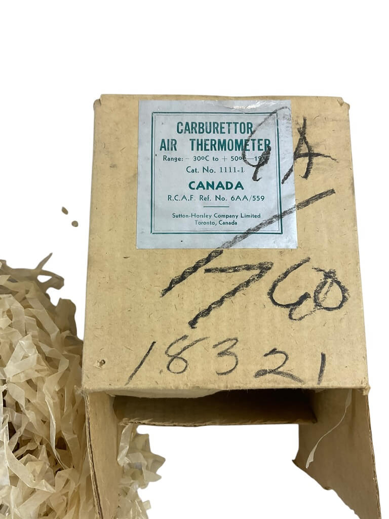 This item is a World War II-era Canadian Royal Canadian Air Force (RCAF) Aircraft Carburettor Air Thermometer, still in the original packaging (NIB – New in Box). This rare and vintage piece is an essential device that was used for measuring the temperature of air entering the carburettor, ensuring optimal performance and safety of the aircraft. Crafted with precision during the 1940s, it serves as an important relic of the wartime aviation technology. The thermometer, untouched and preserved in its original state, is a valuable find for military memorabilia collectors or aviation enthusiasts. It not only symbolizes the technological advancements of that era, but also pays homage to the heroic efforts of the RCAF during WWII. This unique piece offers a tangible connection to Canada’s aviation history and the nation’s contribution to the Allied war efforts.