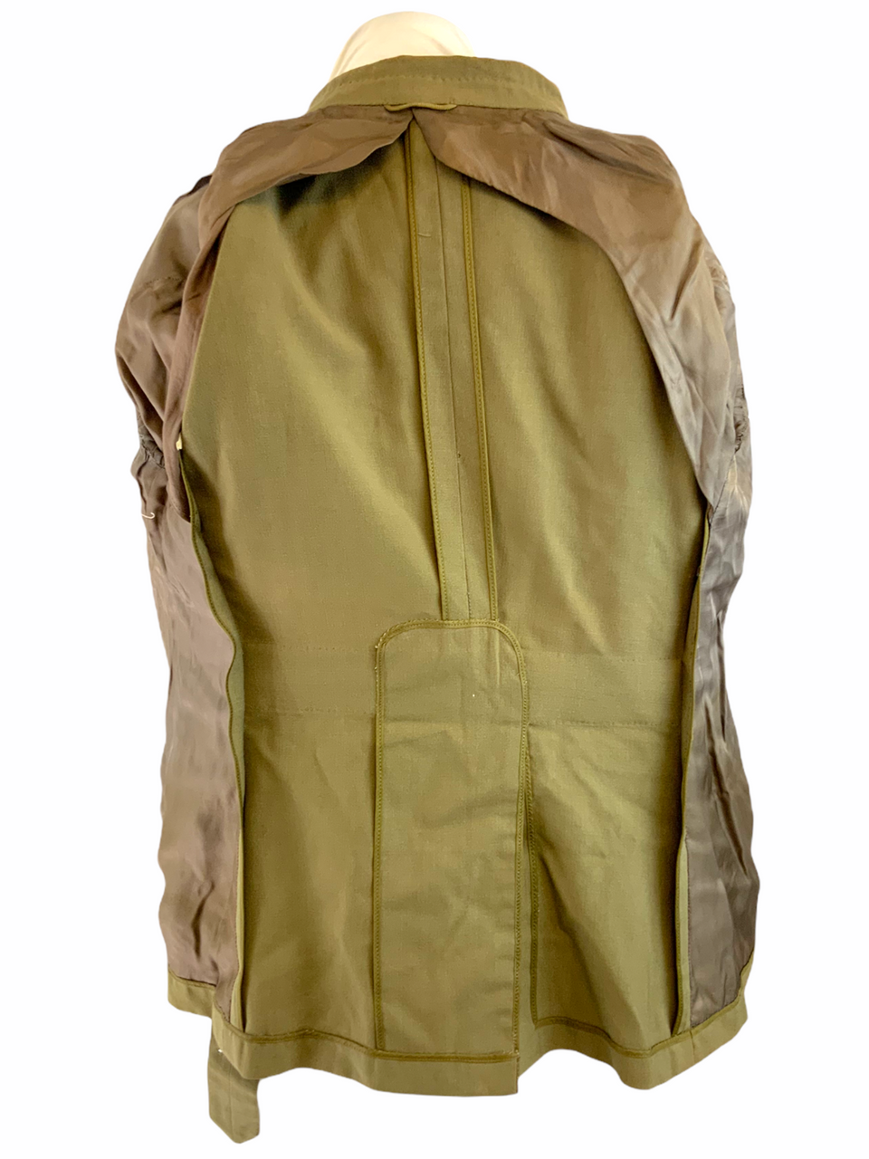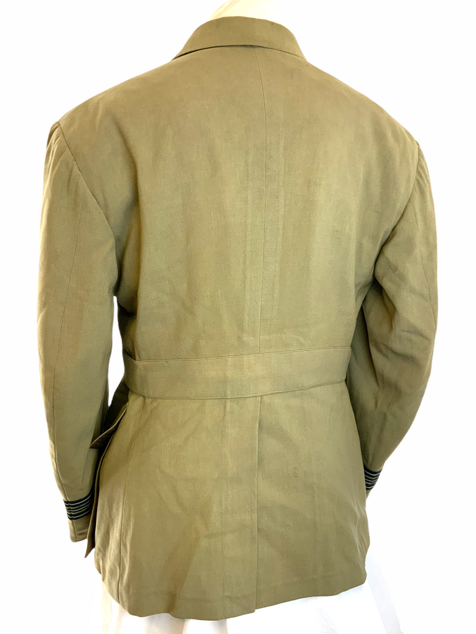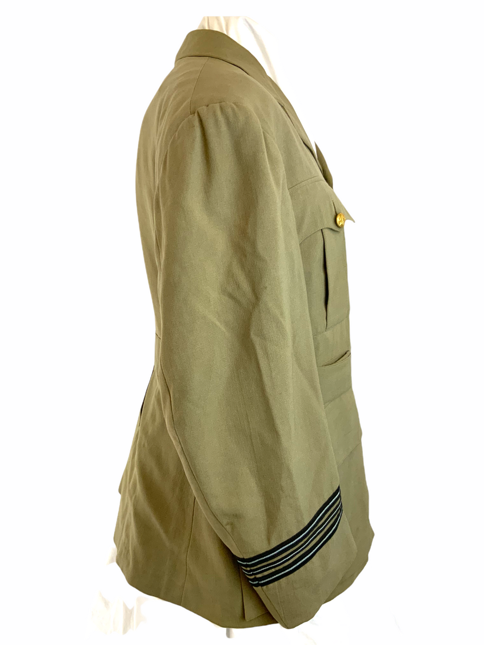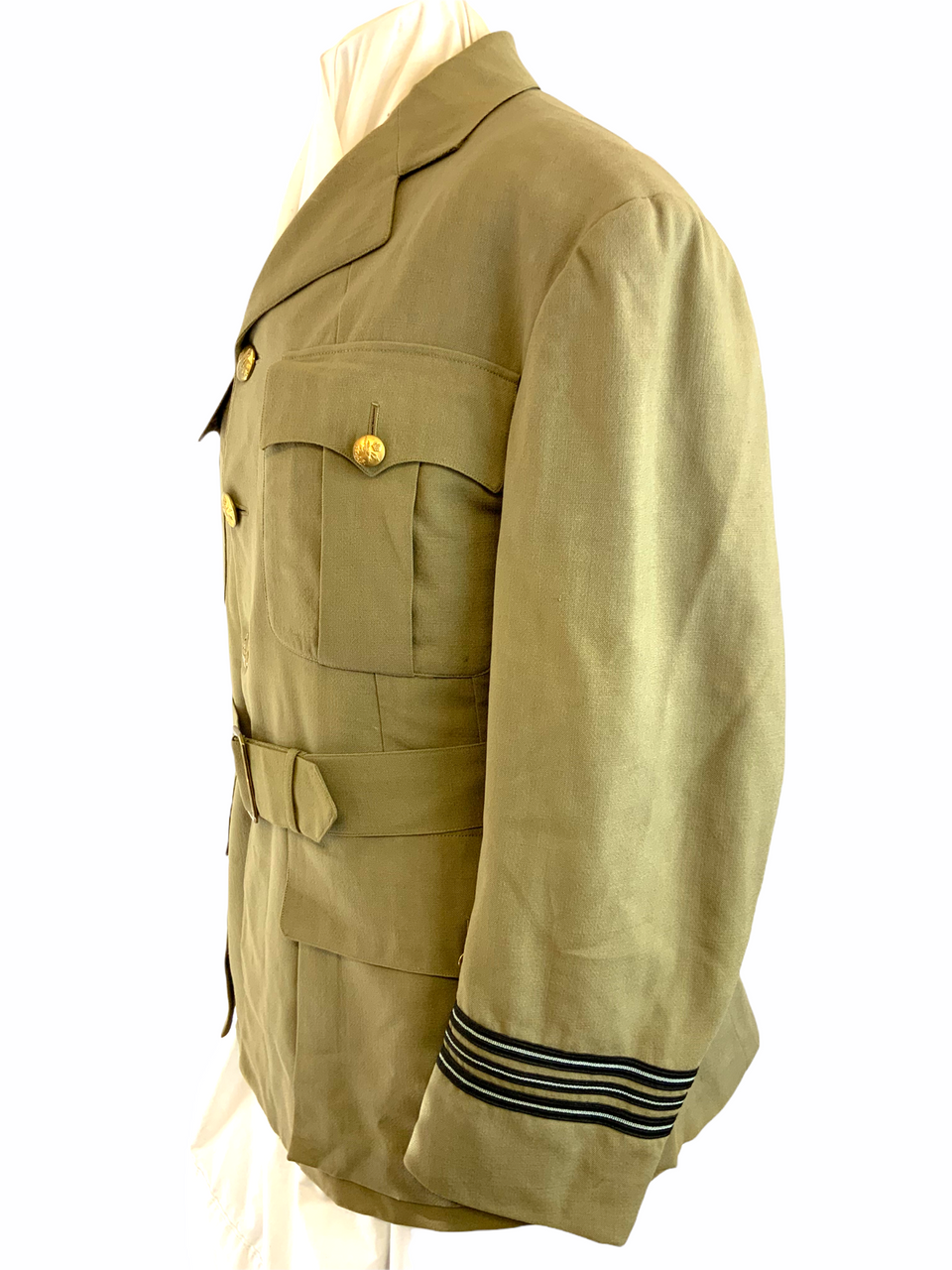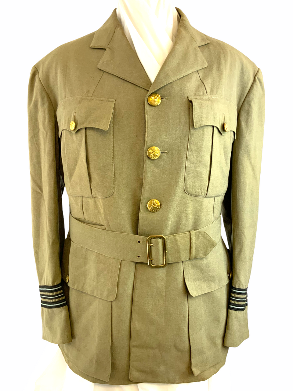 This vintage World War II Royal Canadian Air Force (RCAF) Flying Officer’s jacket is a historic collectible, originating from the pivotal year of 1941. This authentic TW (Tropical Worsted) jacket, tailored for a 40-inch chest, showcases the brave history of Canadian aviation forces. It is a rare, named piece, adding a personal touch to its storied past, and likely once belonged to a valiant officer who served during the war. The jacket features original detailing and insignia, beautifully preserved to reflect the era’s military attire. Whether you are a military history enthusiast or a collector of wartime memorabilia, this RCAF officer’s jacket serves as a tangible connection to the courageous aviators who flew in the defense of freedom. Its well-preserved condition makes it an exceptional acquisition and a tribute to the legacy of those who served with distinction during World War II.