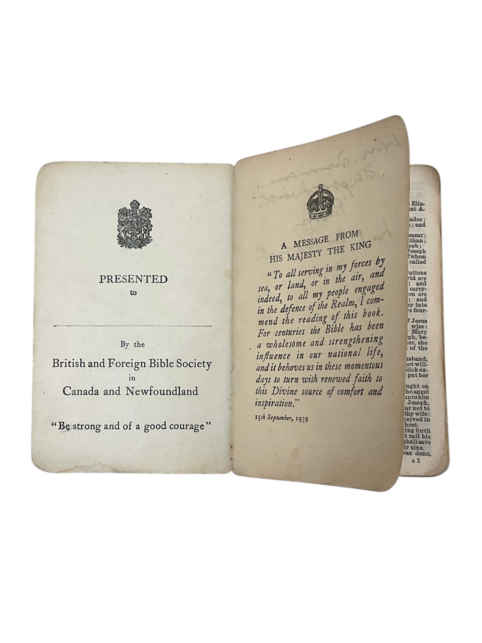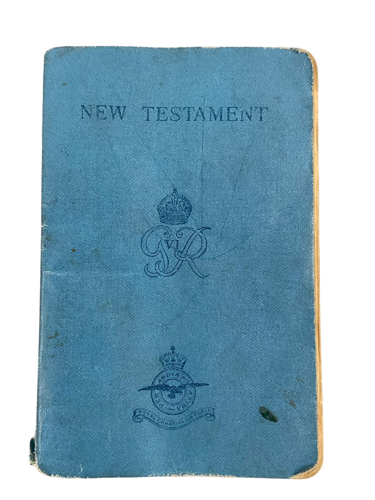 The WW2 Canadian RCAF New Testament Bible is an original softcover religious reference issued to members of the Royal Canadian Air Force during the Second World War. Designed for portability, this compact edition features a durable paper cover and fits easily into a uniform pocket. The interior consists of the New Testament text, traditionally printed, along with a presentation page that may include service-related dedications or inscriptions. Issued under the authority of military chaplains, such Bibles were distributed to provide spiritual support to personnel serving in various capacities, whether at home or overseas. The production and distribution of these volumes reflect the broader practice among Allied forces of supplying service members with religious materials during wartime. As an authentic wartime item, it illustrates both the daily realities of service life and the importance placed on morale and faith within the military context of the period.
