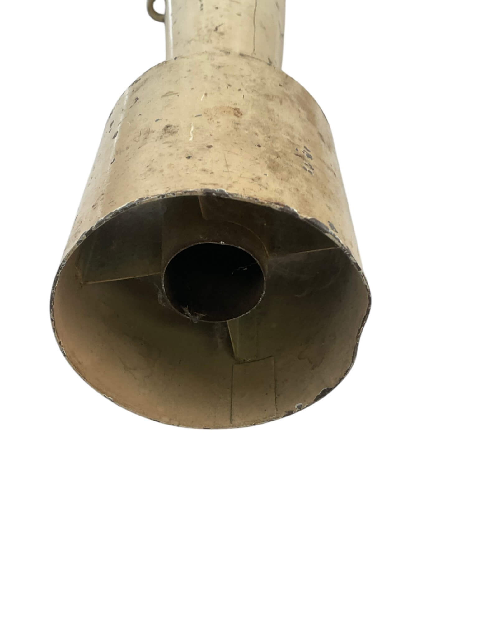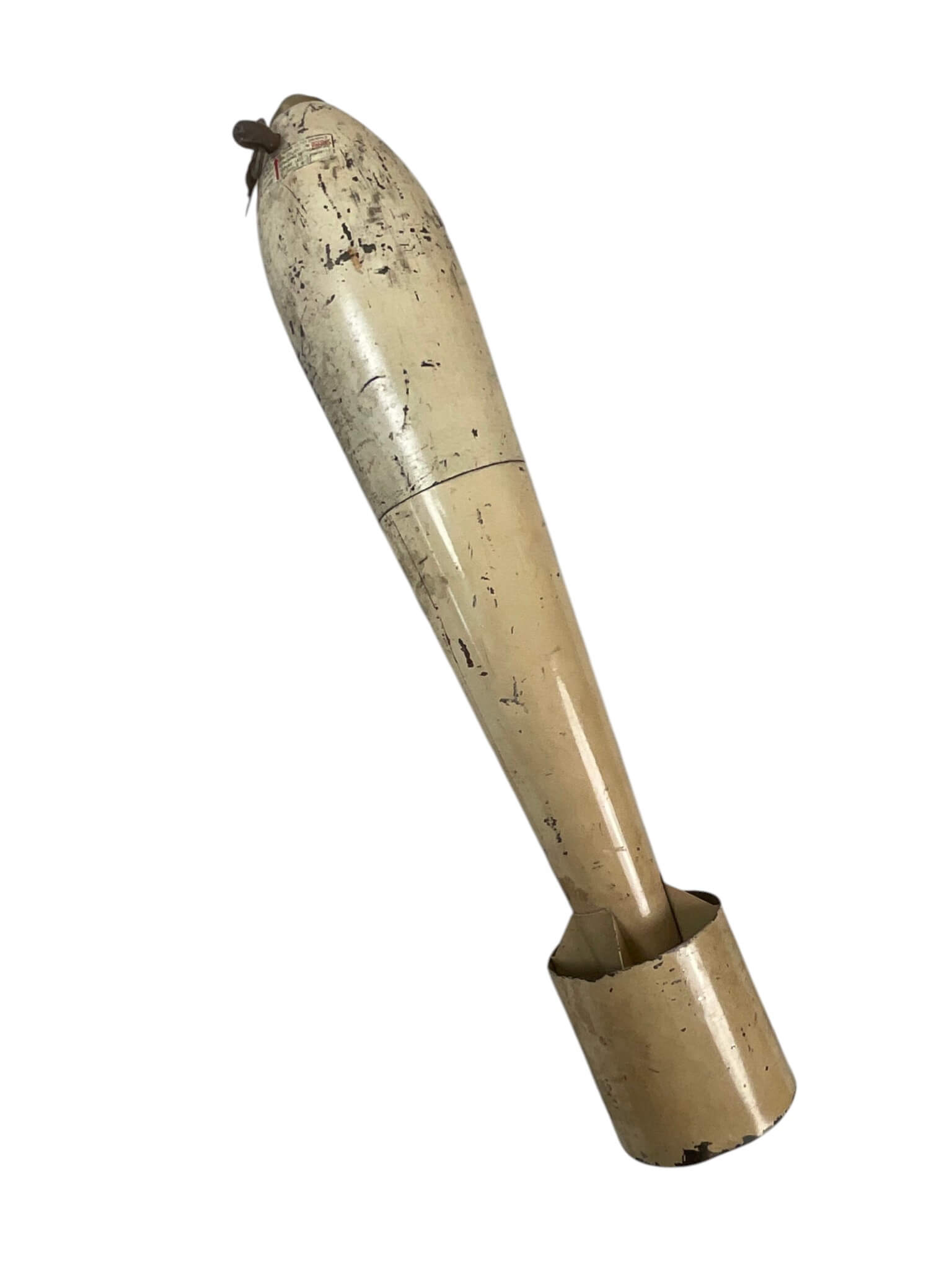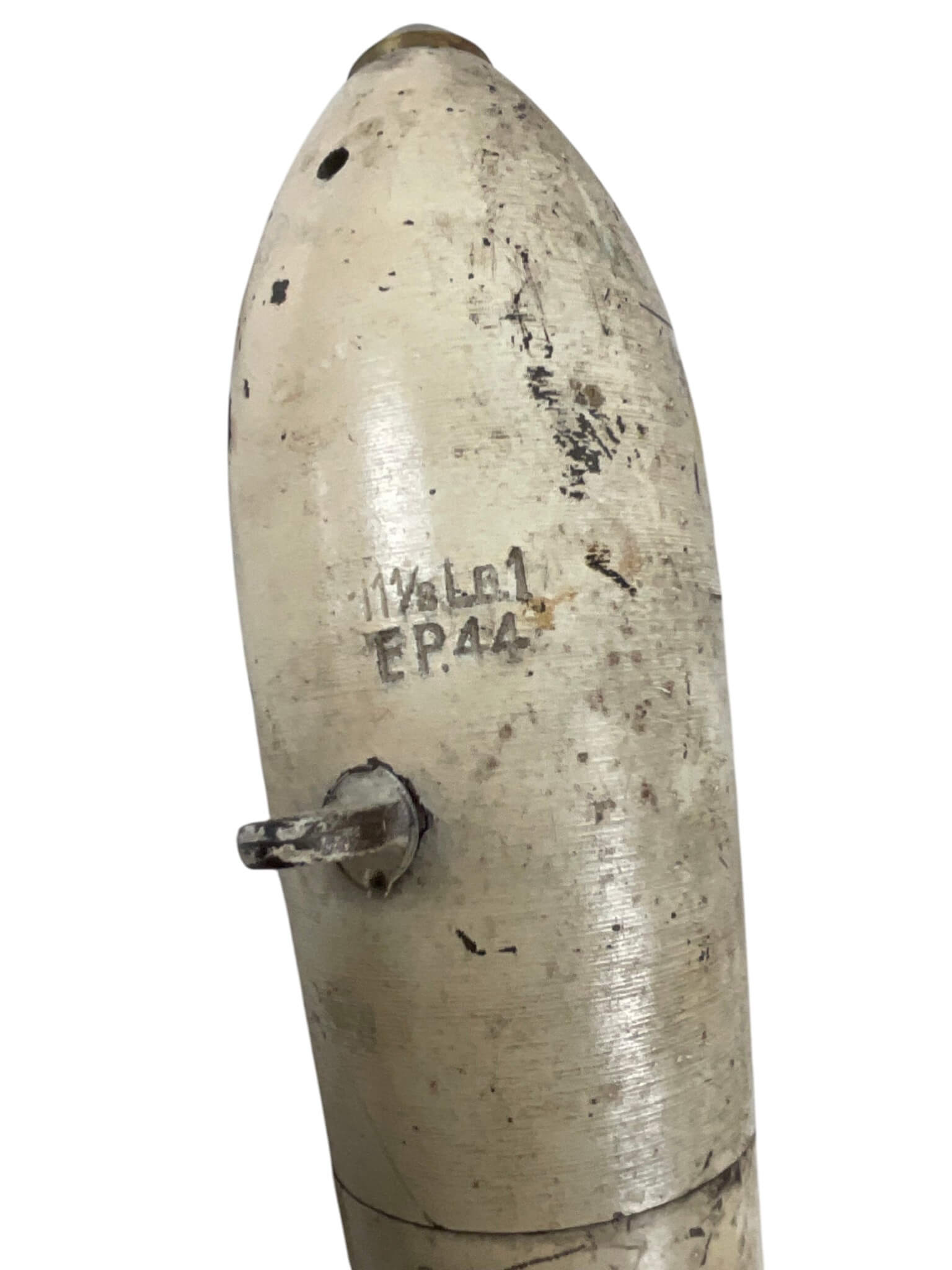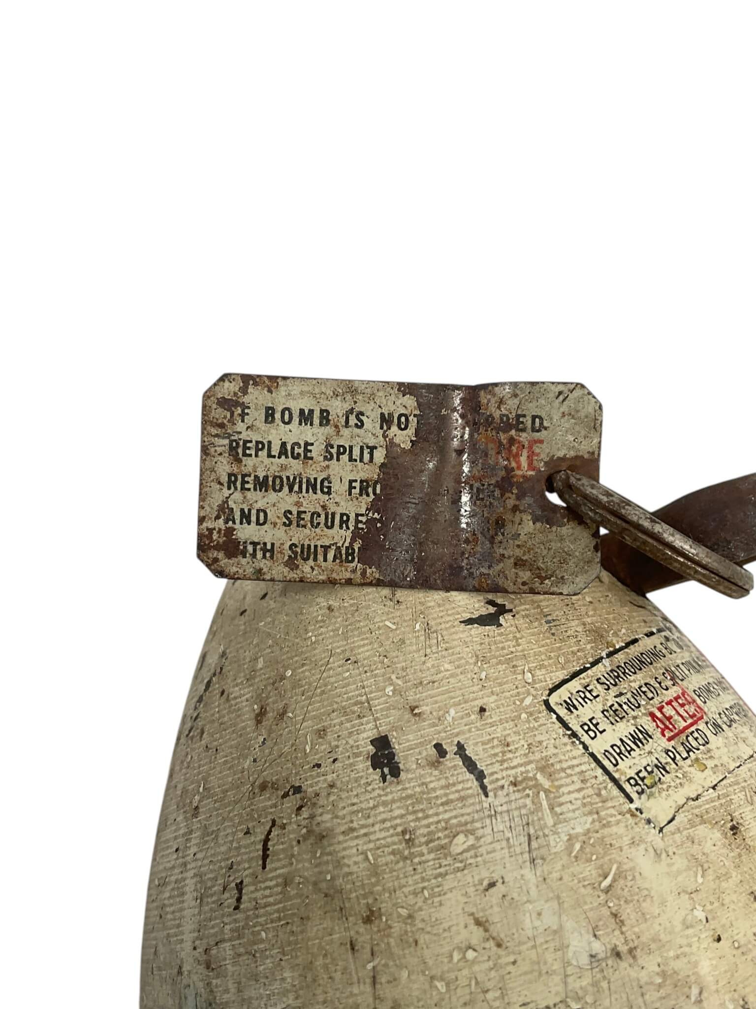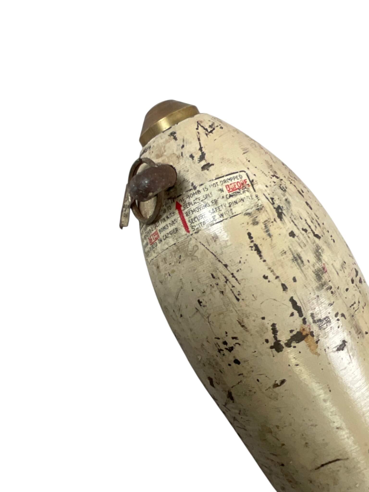 This item is a World War II-era Canadian Royal Canadian Air Force (RCAF) practice bomb, dated 1944. The bomb is inert, meaning it contains no explosive material and is safe for handling and display purposes. Practice bombs such as this were used for training purposes, allowing aircrews to simulate bombing missions without the hazards associated with live munitions. The artifact is constructed from metal and typically features identifying markings, which may include the date, model, and relevant military designations. Items of this type were an essential part of training programs at airbases throughout Canada and allied nations during the conflict. This example provides insight into the equipment utilized by the RCAF in preparing crews for operational roles during World War II. The 1944 date situates this piece within the later years of the war, a period marked by intensive training and operational activity among Commonwealth air forces.