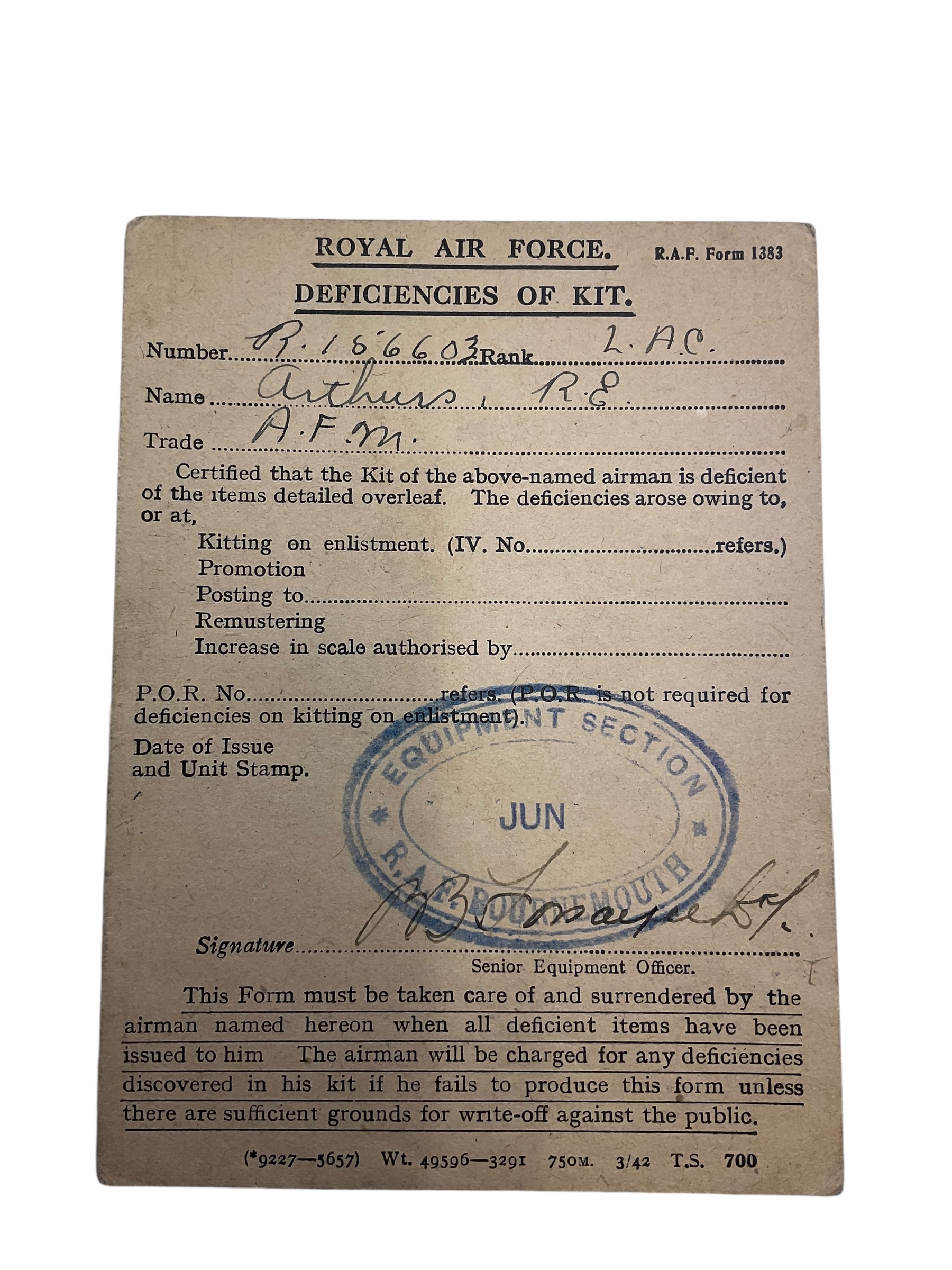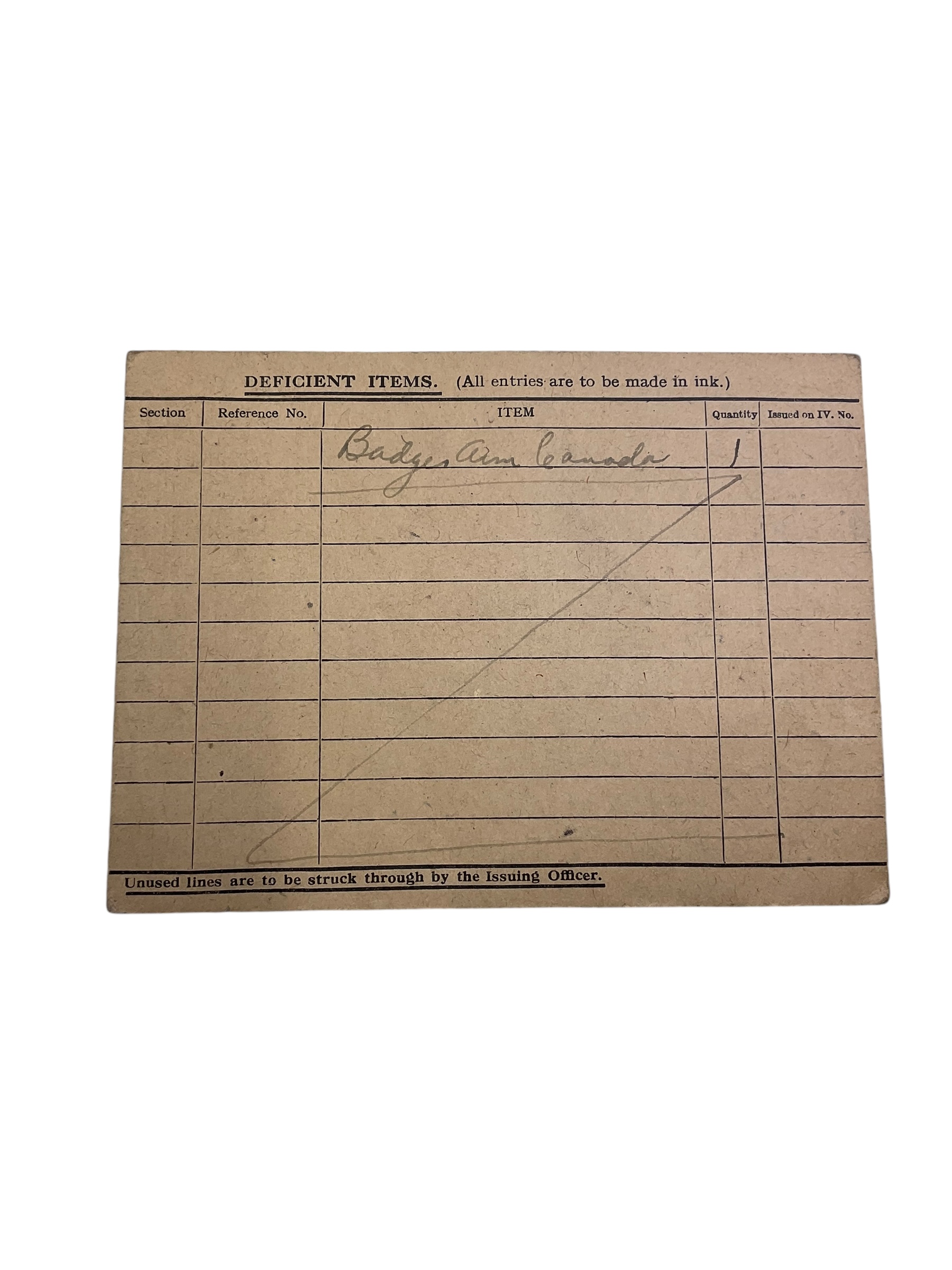 WW2 Canadian RCAF RAF Deficiencies of Kit Card