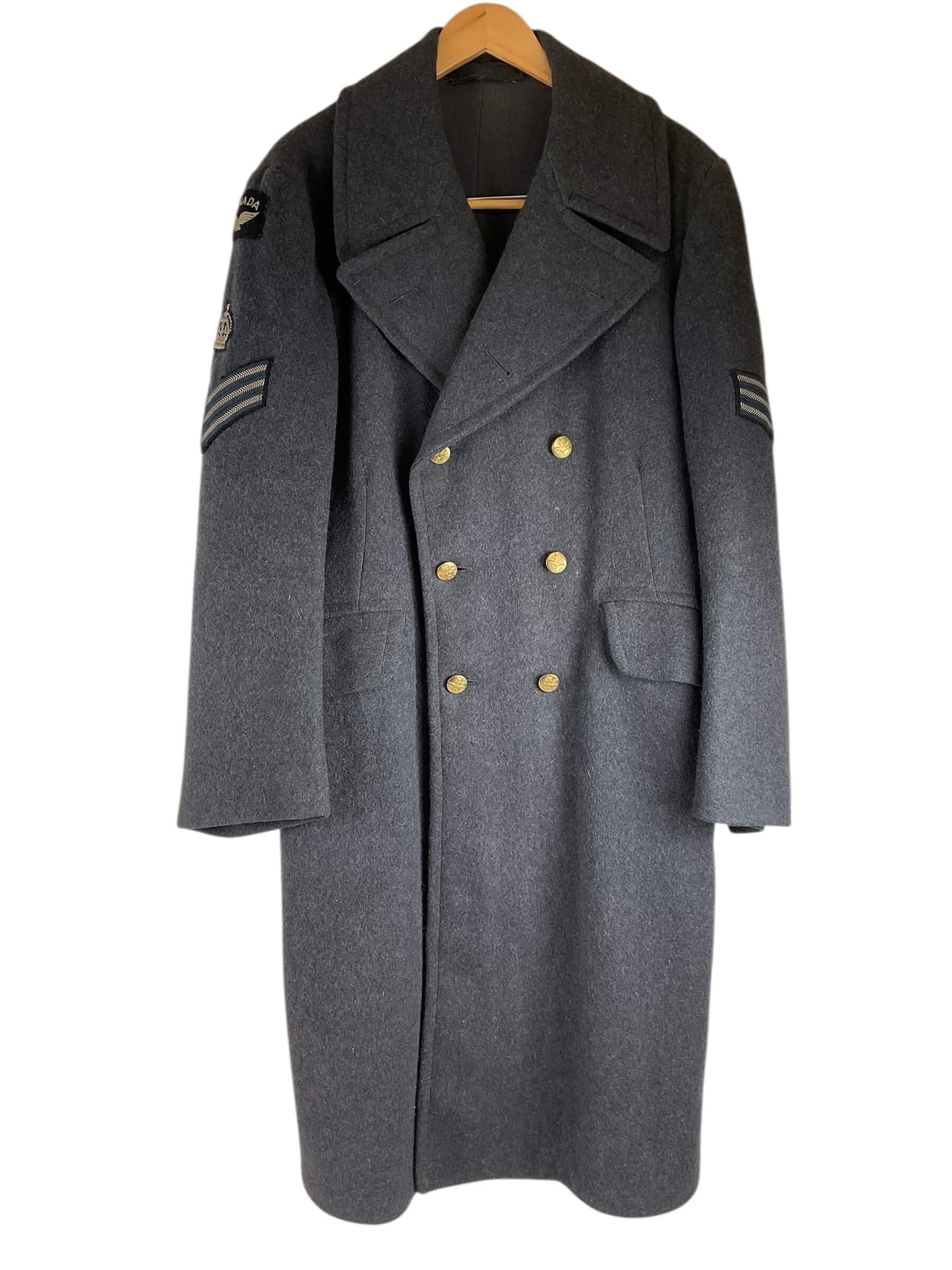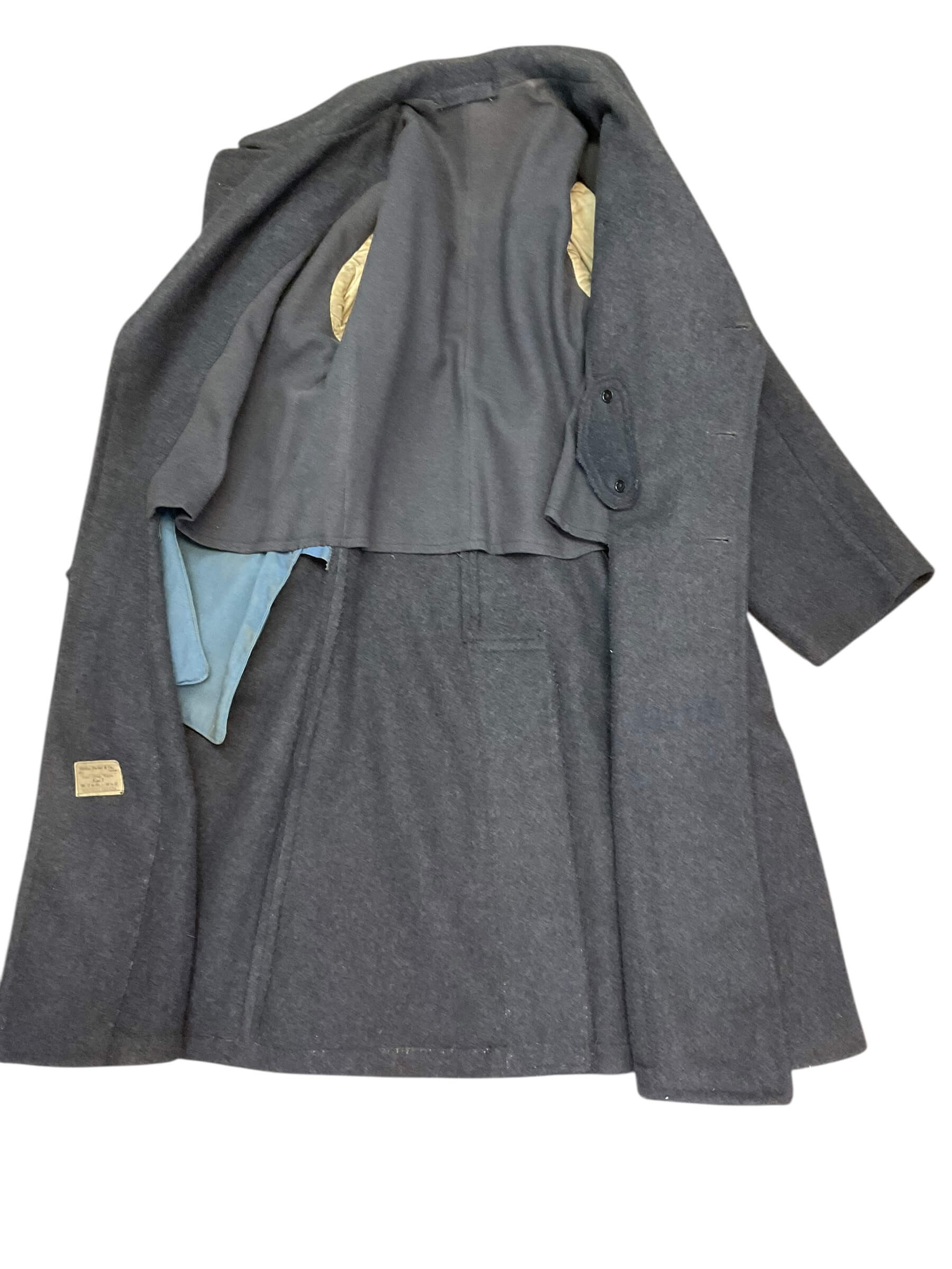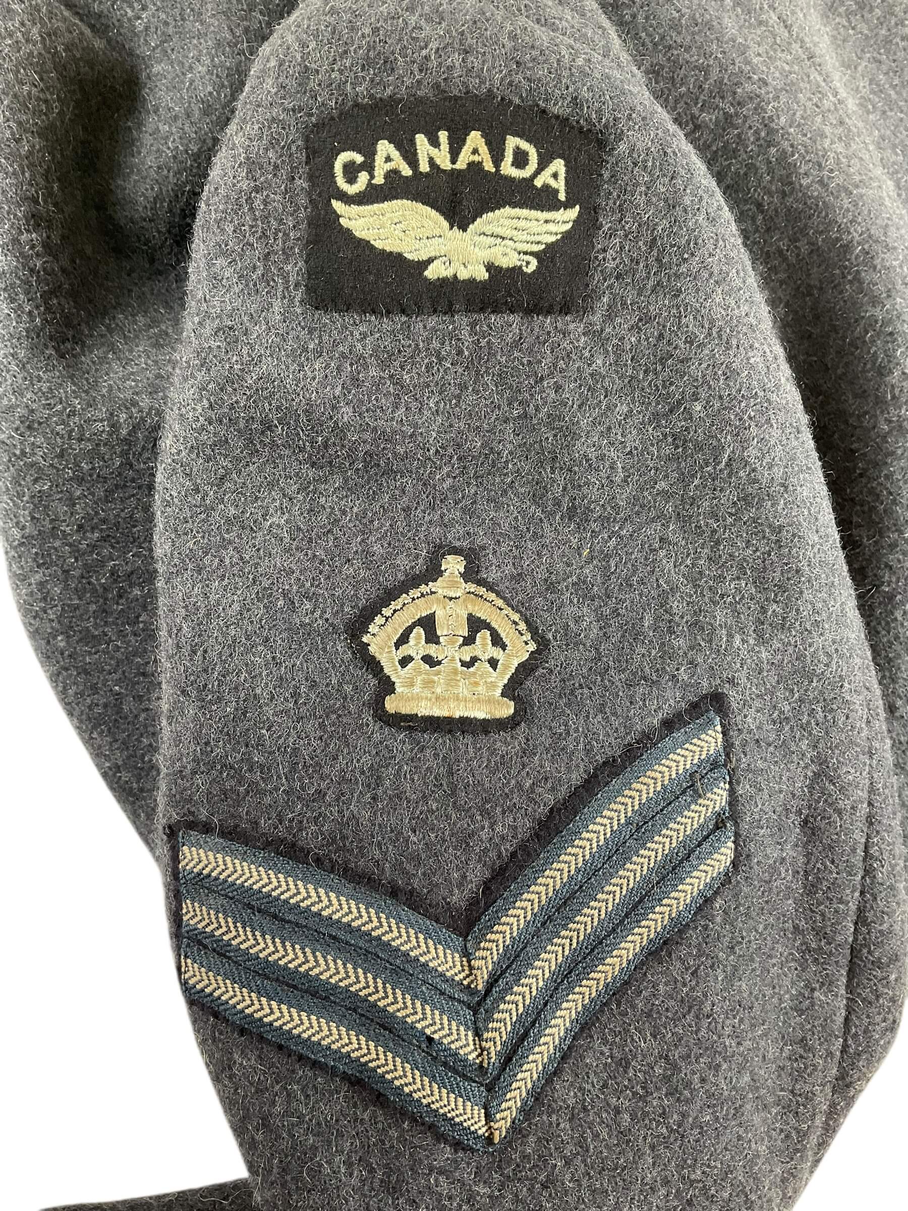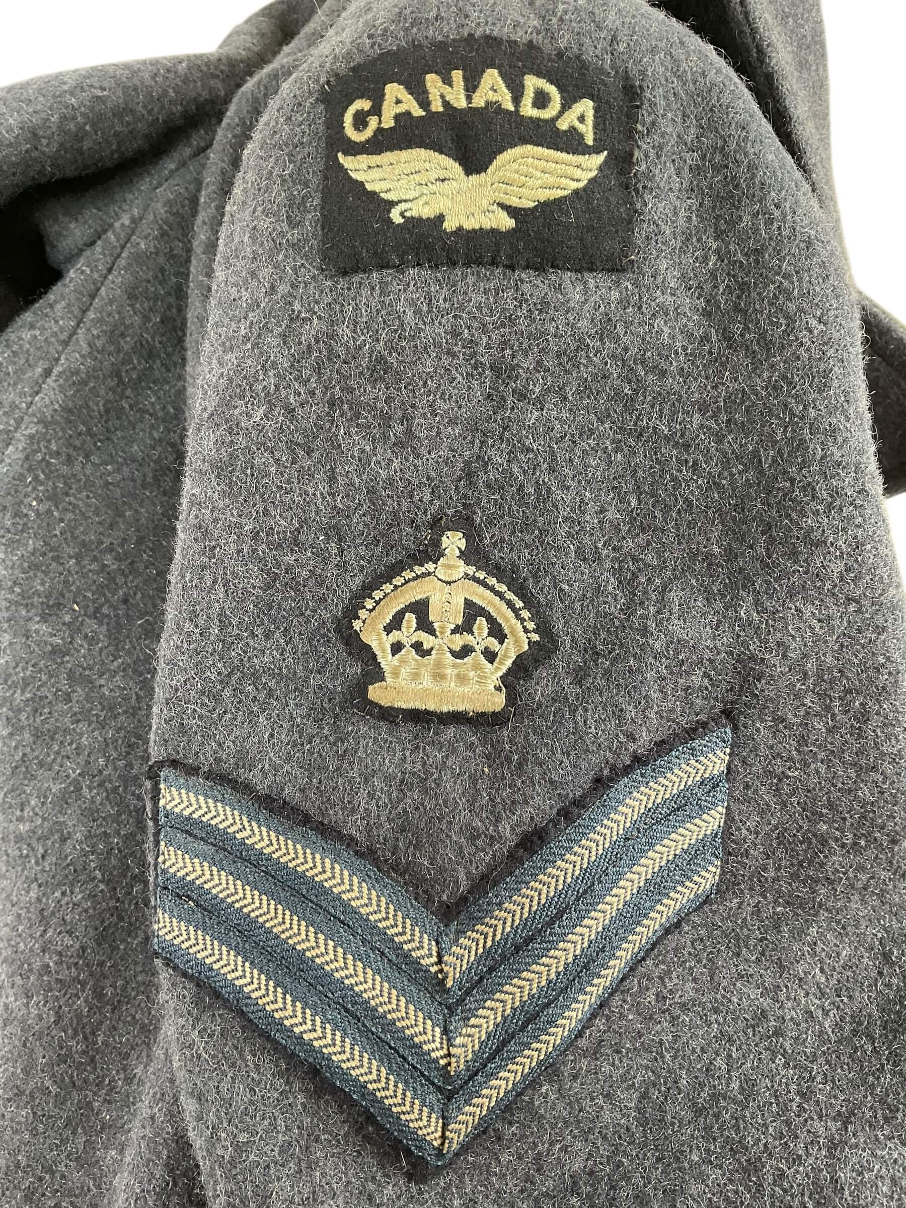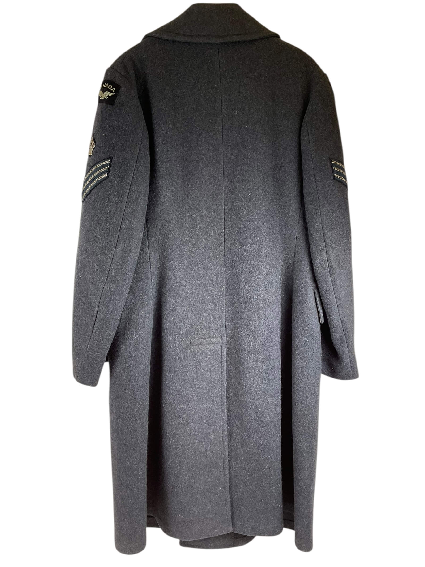 The WW2 Canadian RCAF Sergeants Greatcoat 1942 Dated is a significant piece of military history, steeped in the rich legacy of the Royal Canadian Air Force during the Second World War. This rare garment, dated back to 1942, was once worn by a Canadian RCAF Sergeant during the heat of the war. Made from high-quality, heavy wool, the greatcoat served as an essential piece of uniform, providing warmth and protection in harsh conditions. It is typically navy blue in color, indicative of its air force origin, with distinctive RCAF brass buttons and Sergeant’s insignia. The coat also features a wide collar, double-breasted front, and deep pockets. This unique artifact not only reflects the design and functionality of military wear of the time but also carries with it stories of courage, duty, and sacrifice, making it a worthy addition to any military memorabilia collection.