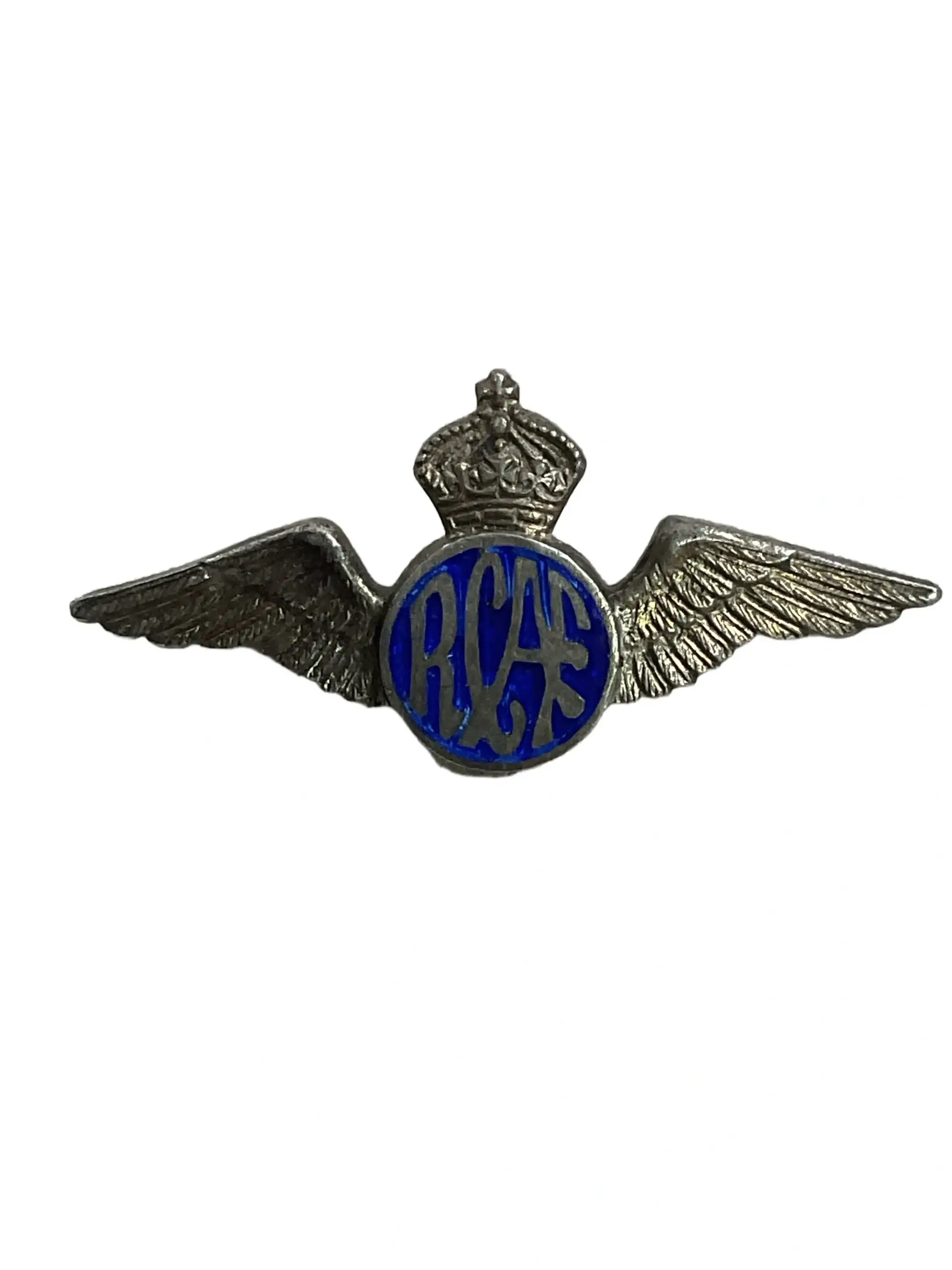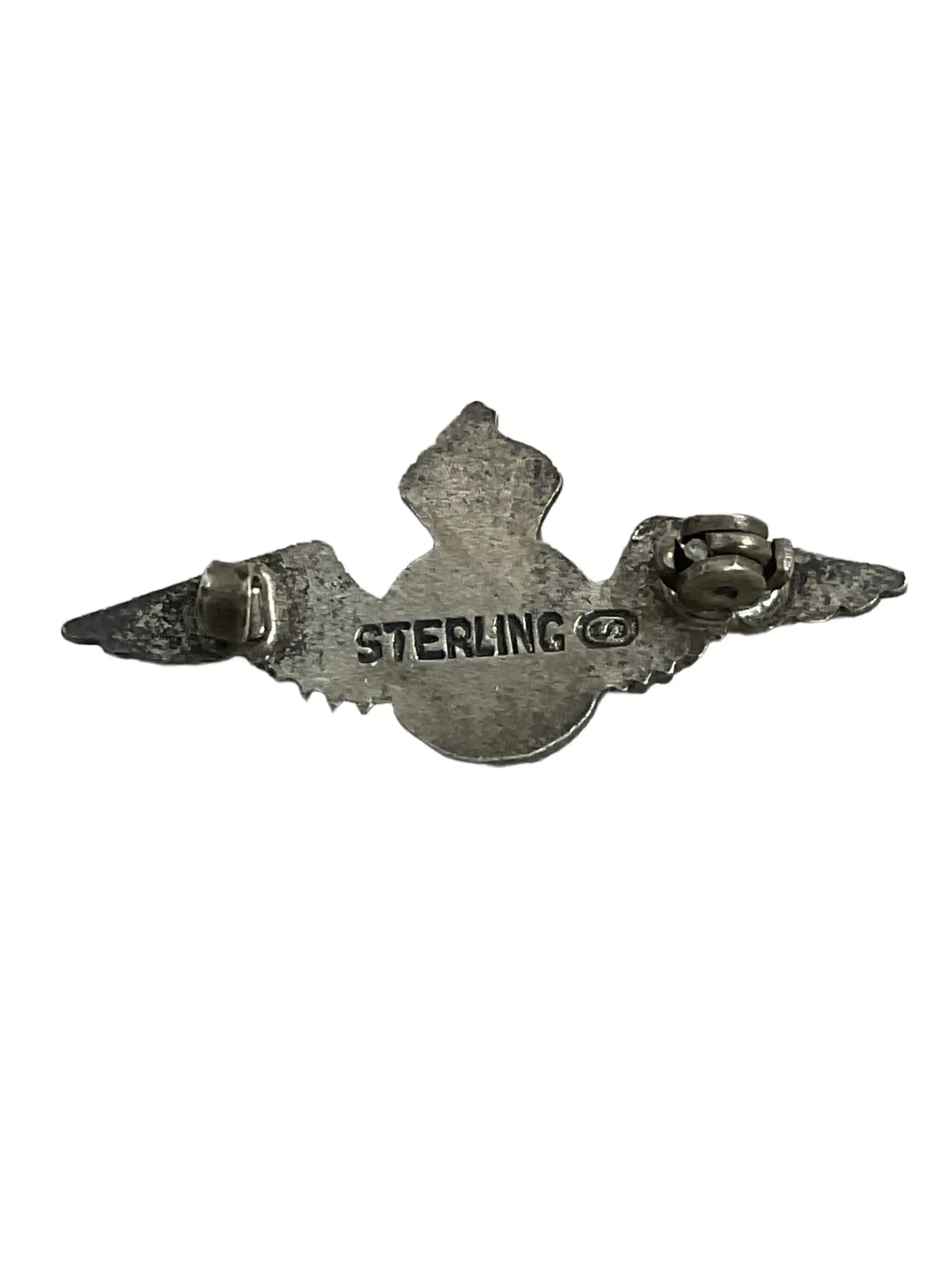 This WW2 Canadian RCAF Sterling Silver Lapel Badge is an original piece issued to members of the Royal Canadian Air Force during the Second World War. The badge is crafted from sterling silver and typically features the winged RCAF emblem, often with the addition of a crown and “RCAF” lettering beneath. Measuring approximately 18–22 mm in width, it was designed for wear on civilian clothing to identify the wearer’s affiliation with the RCAF while off-duty or during non-uniform occasions. Such badges were commonly awarded to both serving personnel and veterans as a mark of their service. The reverse is usually stamped “Sterling” along with a maker’s mark, and it fastens with a straightforward pin mechanism. These lapel badges are collectible artifacts reflecting the contributions of the RCAF within the broader context of Canada’s involvement in the Allied war effort during World War II.