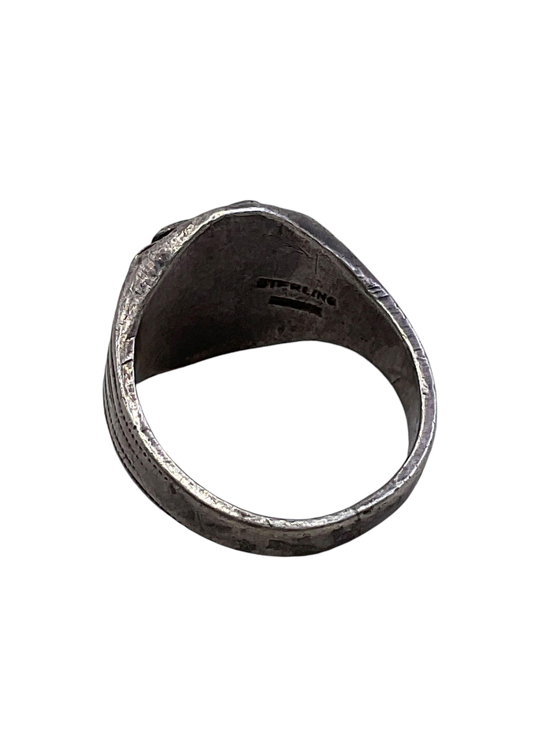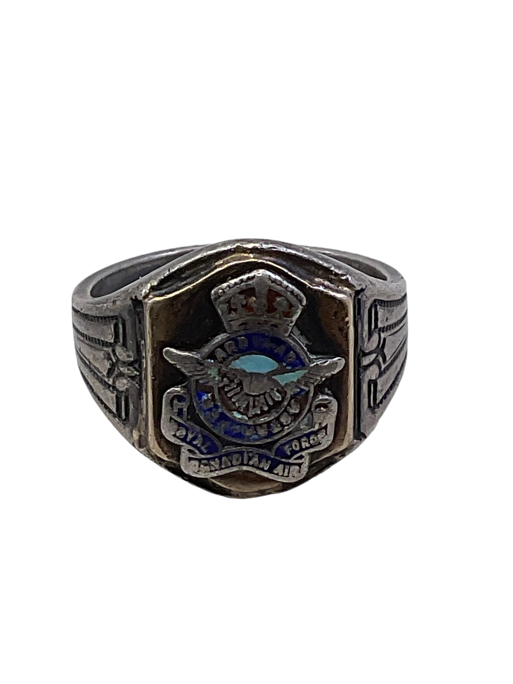 This WW2 Canadian RCAF Sterling Silver Ring is a rare, historical memento from the era of World War II. Crafted from genuine sterling silver, the ring is a tribute to the Royal Canadian Air Force (RCAF), vividly reflecting the rich military history of Canada. The central piece is a meticulously designed emblem of the RCAF, which stands out in sharp relief against the silver band. The ring’s design and craftsmanship hint at the determination and bravery of the RCAF personnel during the war. Its antiquated appearance adds to its allure, making it a perfect collector’s item. Whether you’re a history enthusiast, a military artifact collector or someone who appreciates unique jewelry, this sterling silver ring serves as a tangible reminder of Canada’s contribution to World War II.