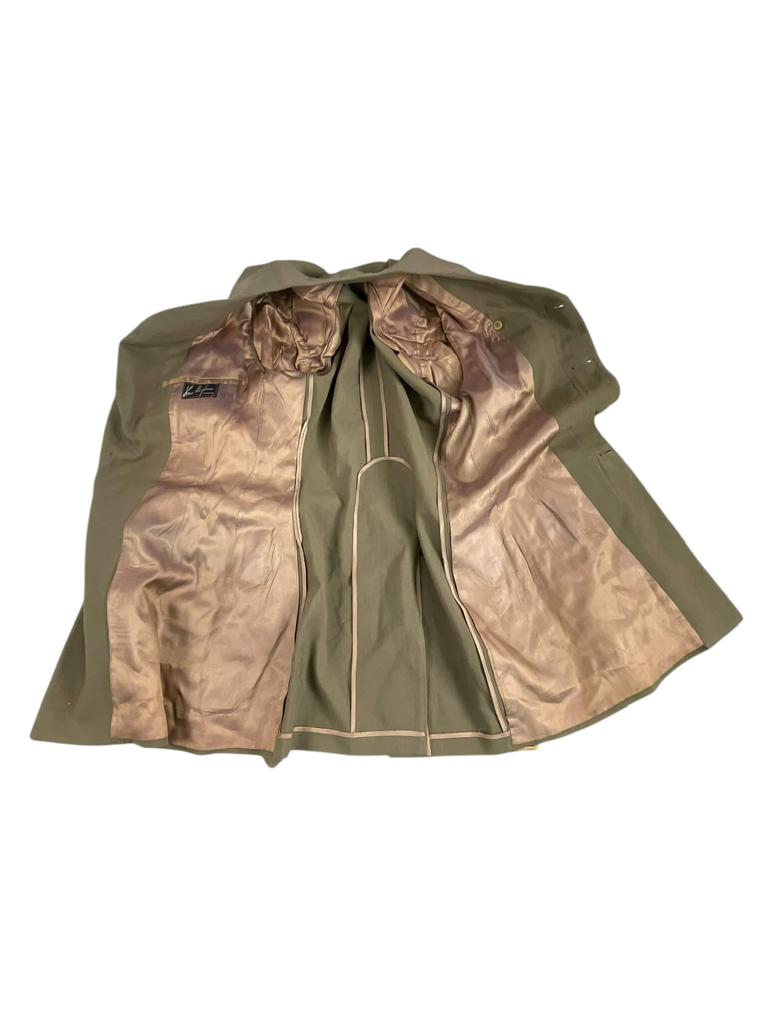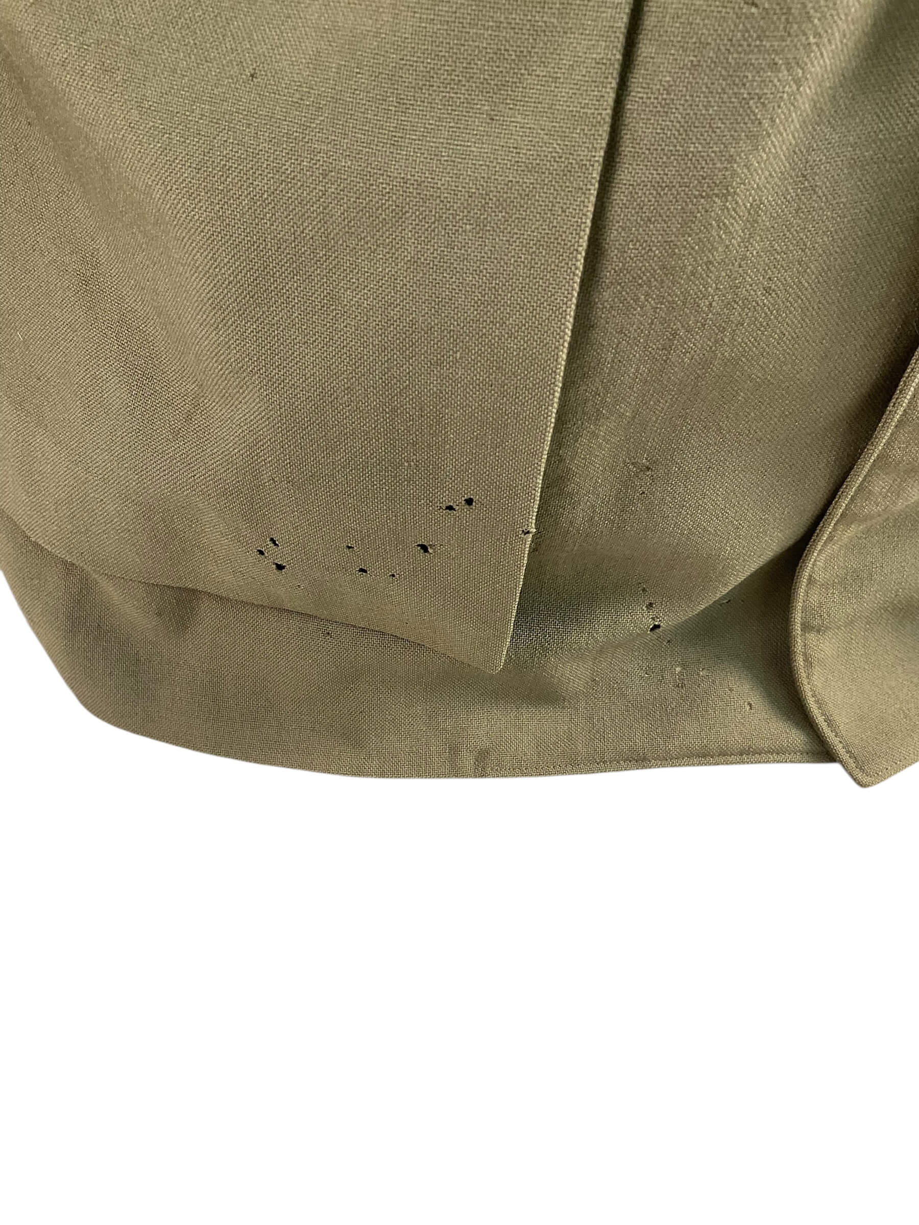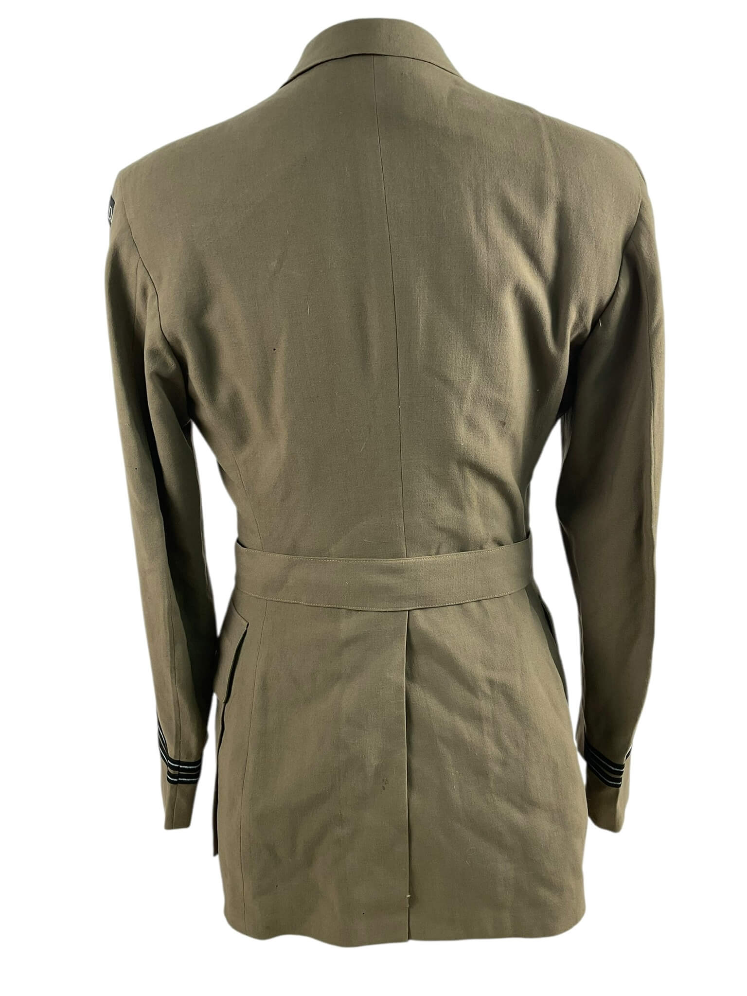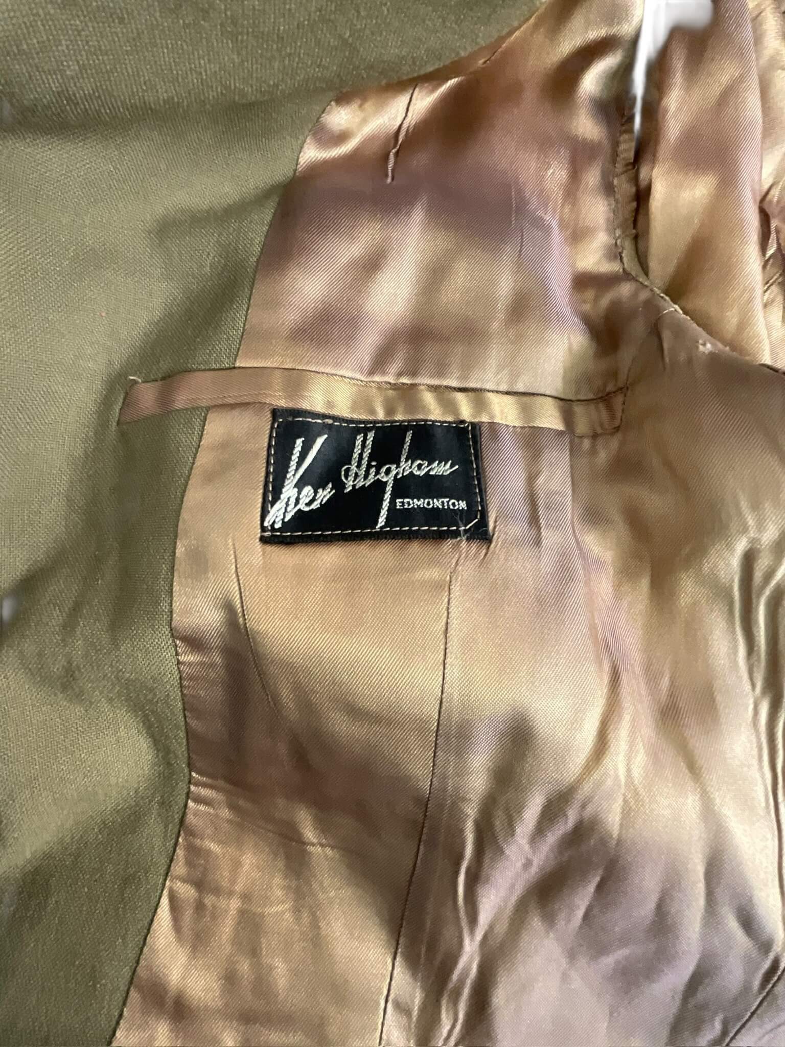 This is a WW2 Canadian RCAF Tropical Worsted Officers 4 Pocket Service Dress Tunic Named. It’s a vintage military uniform piece primarily composed of worsted weave, designed for tropical climates. As a RCAF (Royal Canadian Air Force) attire, it displays Canadian military aesthetics. Features include four functional pockets and it carries a specific name tag, adding to its historical authenticity.