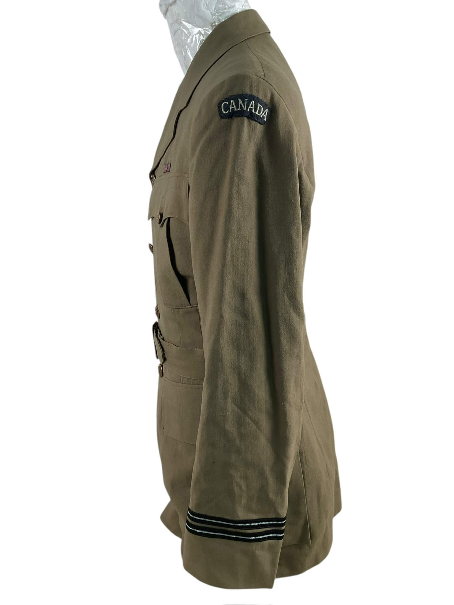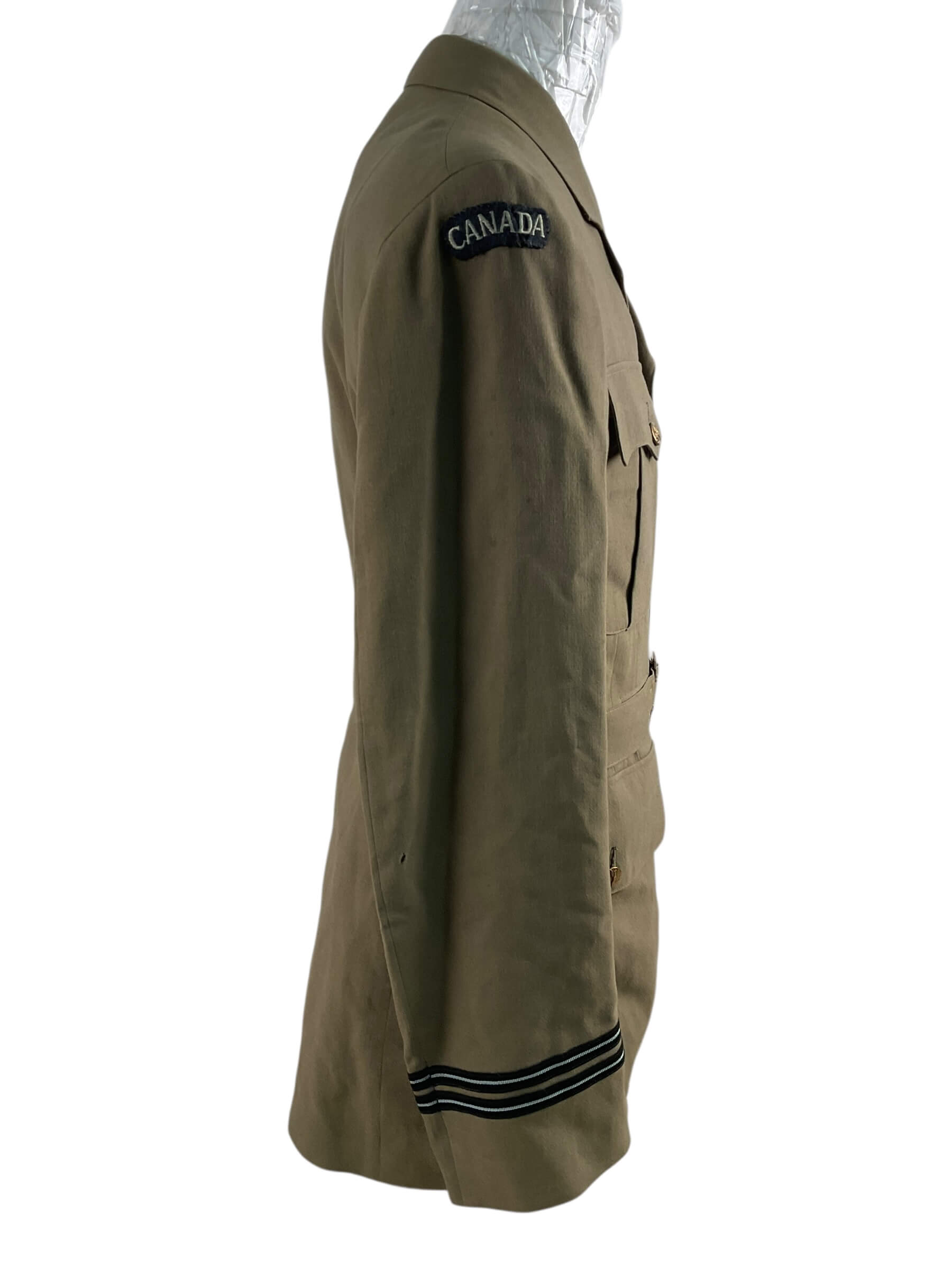 The WW2 Canadian RCAF Tropical Worsted Officers 4 Pocket Service Dress Tunic Named is a highly detailed, meticulously recreated piece of historical memorabilia from the World War II era. Specifically designed for members of the Royal Canadian Air Force (RCAF), this tunic is crafted from tropical worsted fabric, an ideal material for maintaining a professional, composed appearance under warm weather conditions. The tunic is characterized by its four-pocket design, as would have been used for practical storage during service. This particular item is ‘named’, meaning it historically belonged to, or was designated for, a particular officer. However, the identity of the officer is not specified in the product title, and additional details will be found on the product page. As a reproduction, this tunic provides a tangible link to the past, and proves to be an invaluable asset for historical reenactments, film props, costume parties, or personal collections.