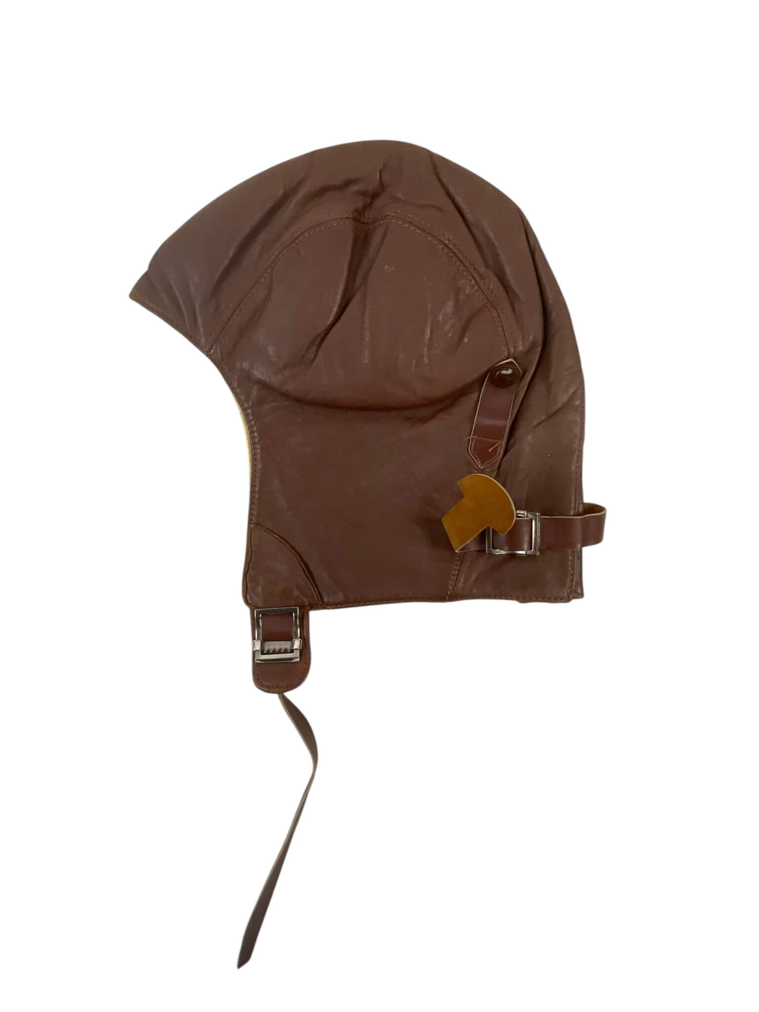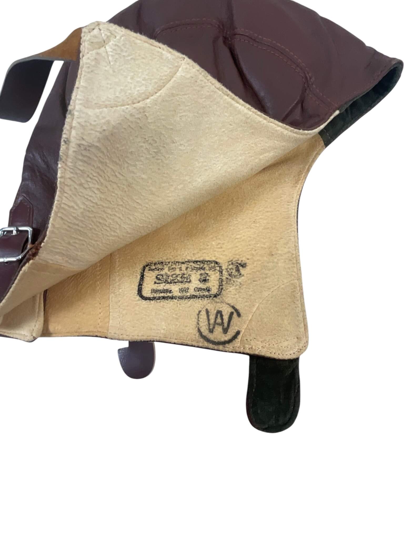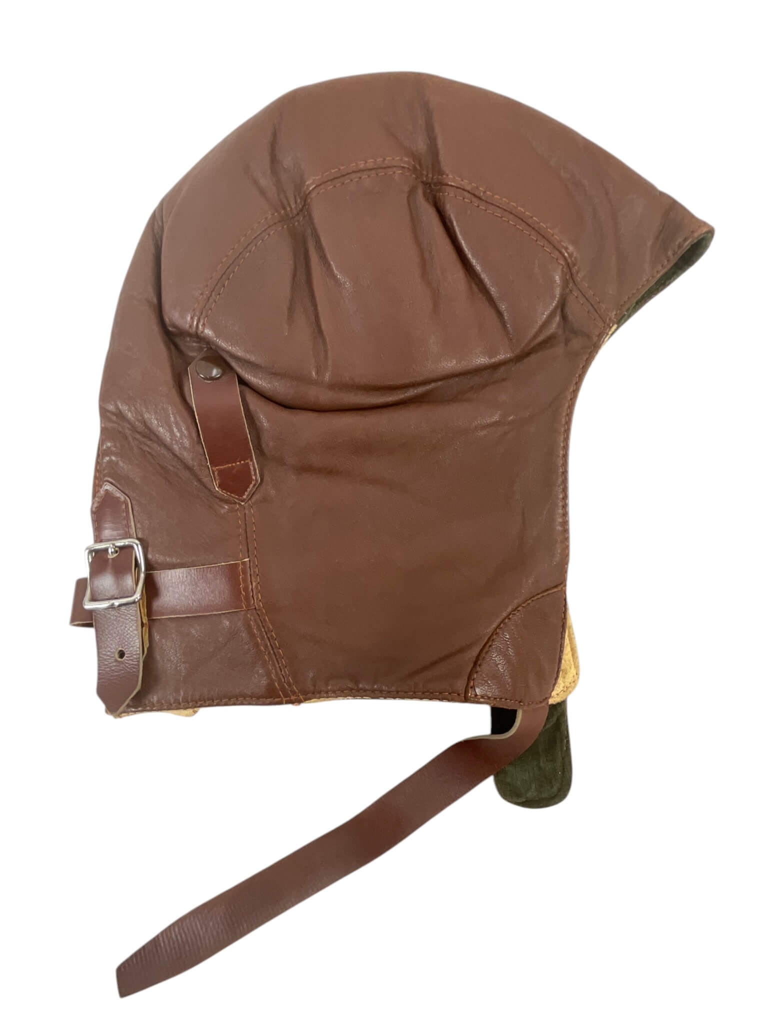The WW2 Canadian RCAF Type B Training Helmet is a Canadian-made flight helmet issued to Royal Canadian Air Force personnel during the Second World War. This example remains in unissued condition and is marked with the “C Broad Arrow” indicating Canadian military acceptance. Designed for use during aircrew training, the Type B helmet features a brown leather exterior, interior chamois padding, and adjustable chin strap. It was typically worn with radio communication equipment and flight goggles, providing basic protection and warmth in open cockpit trainers and early war aircraft. The Canadian variant closely follows the British pattern but includes national manufacturing marks and subtle differences in leather and stitching. Such helmets were integral for pilot instruction throughout the war, reflecting the RCAF’s crucial role in the British Commonwealth Air Training Plan. This unissued example is representative of WWII Canadian aircrew equipment and remains an important artifact from the period.