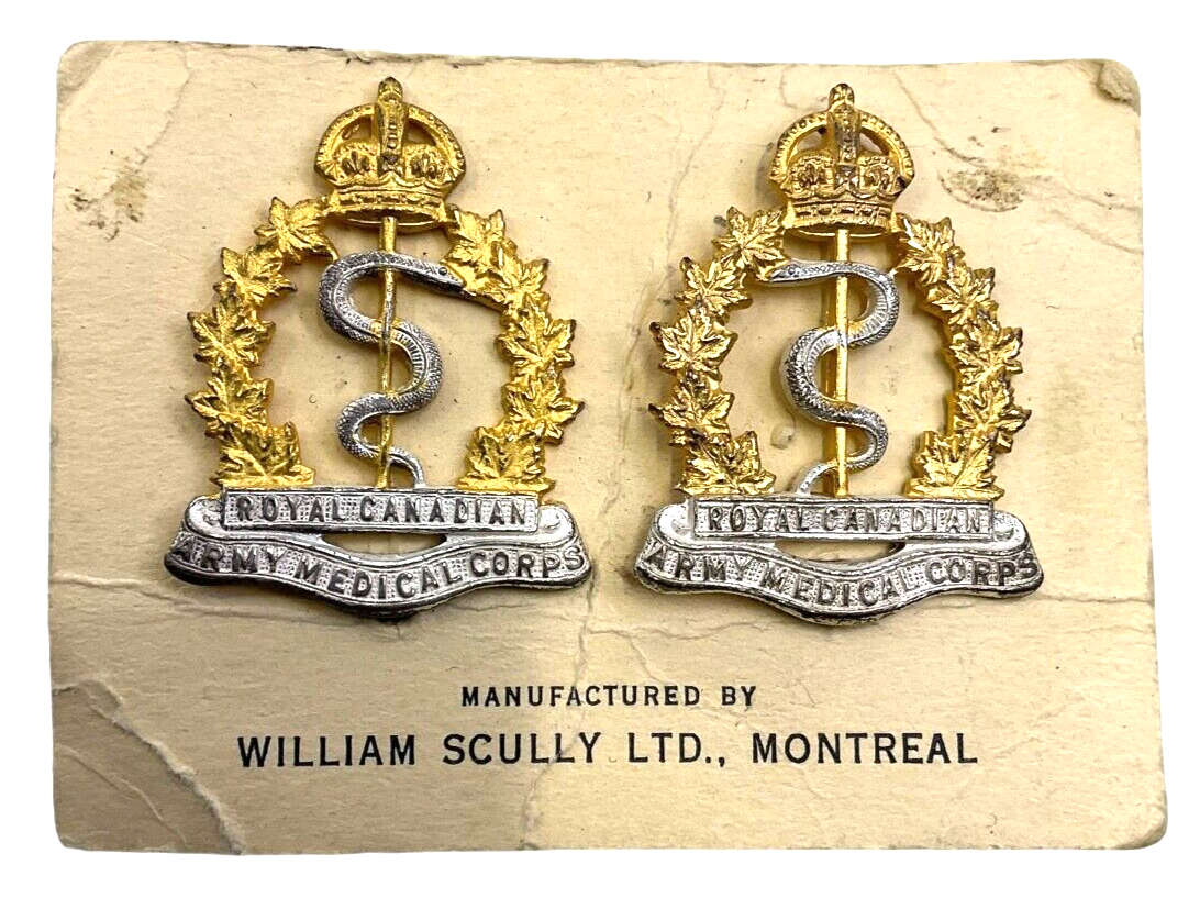 These vintage insignia pieces represent the World War II era Canadian Royal Canadian Army Medical Corps (RCAMC) Officers collar badges, meticulously crafted by the renowned Scully company. Each badge showcases exquisite detail and superior artistry, reflecting the esteemed role of medical officers who valiantly served during the war. The insignia features iconic symbols associated with military medicine and embodies the dedication, skill, and sacrifice of the RCAMC officers. Ideal for collectors of military memorabilia or historians specializing in World War II artifacts, this pair is a striking reminder of Canada’s rich military heritage. Made with precision and care, these badges are not just historical artifacts but also tributes to the brave medical professionals who provided critical care and support amid the harrowing conditions of war. Preserve a piece of history with these distinguished RCAMC collar badge insignias.