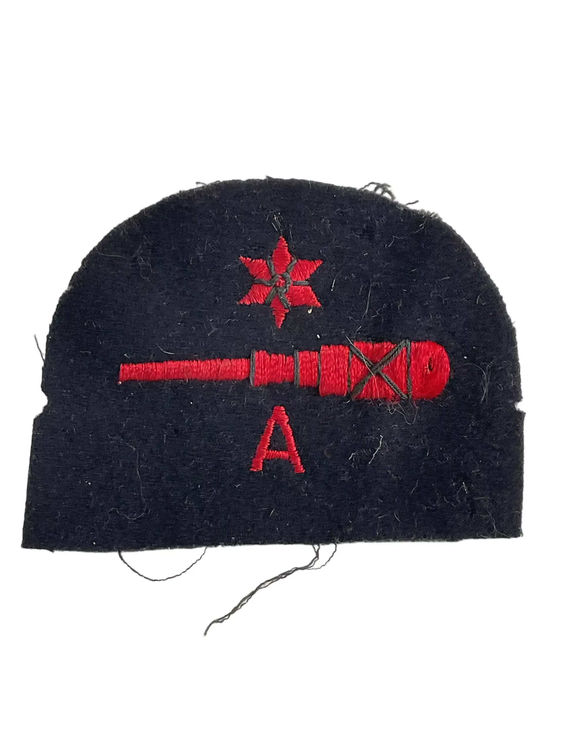 The WW2 Canadian RCN Navy Anti-Aircraft Rating 3rd Class Trade Patch is an original insignia issued to ratings of the Royal Canadian Navy specializing in anti-aircraft defense during the Second World War. This cloth patch typically features a stylized depiction of a gun or crossed cannons embroidered in white thread on a dark navy blue background, signifying the wearer’s technical qualification and role within ship