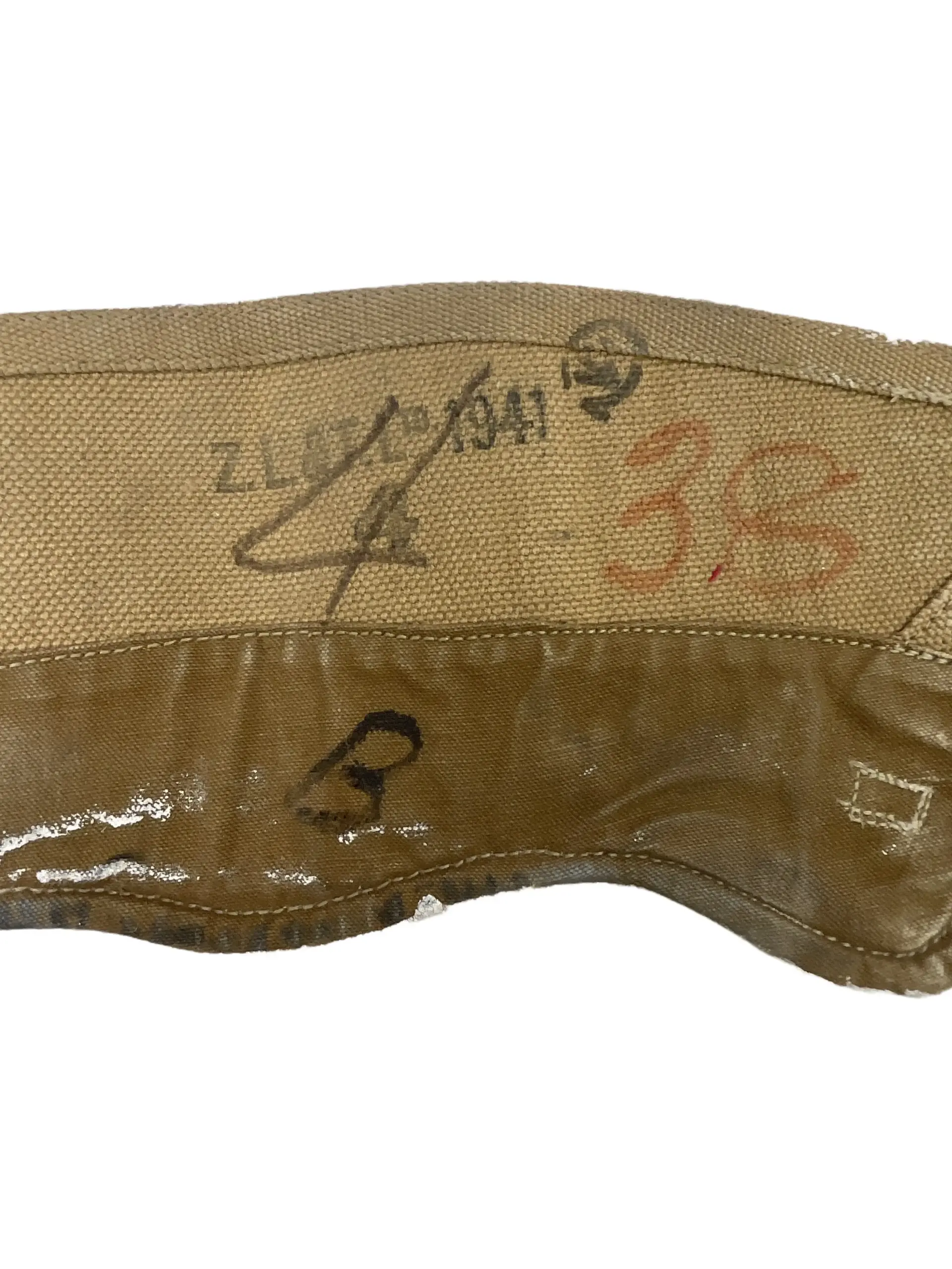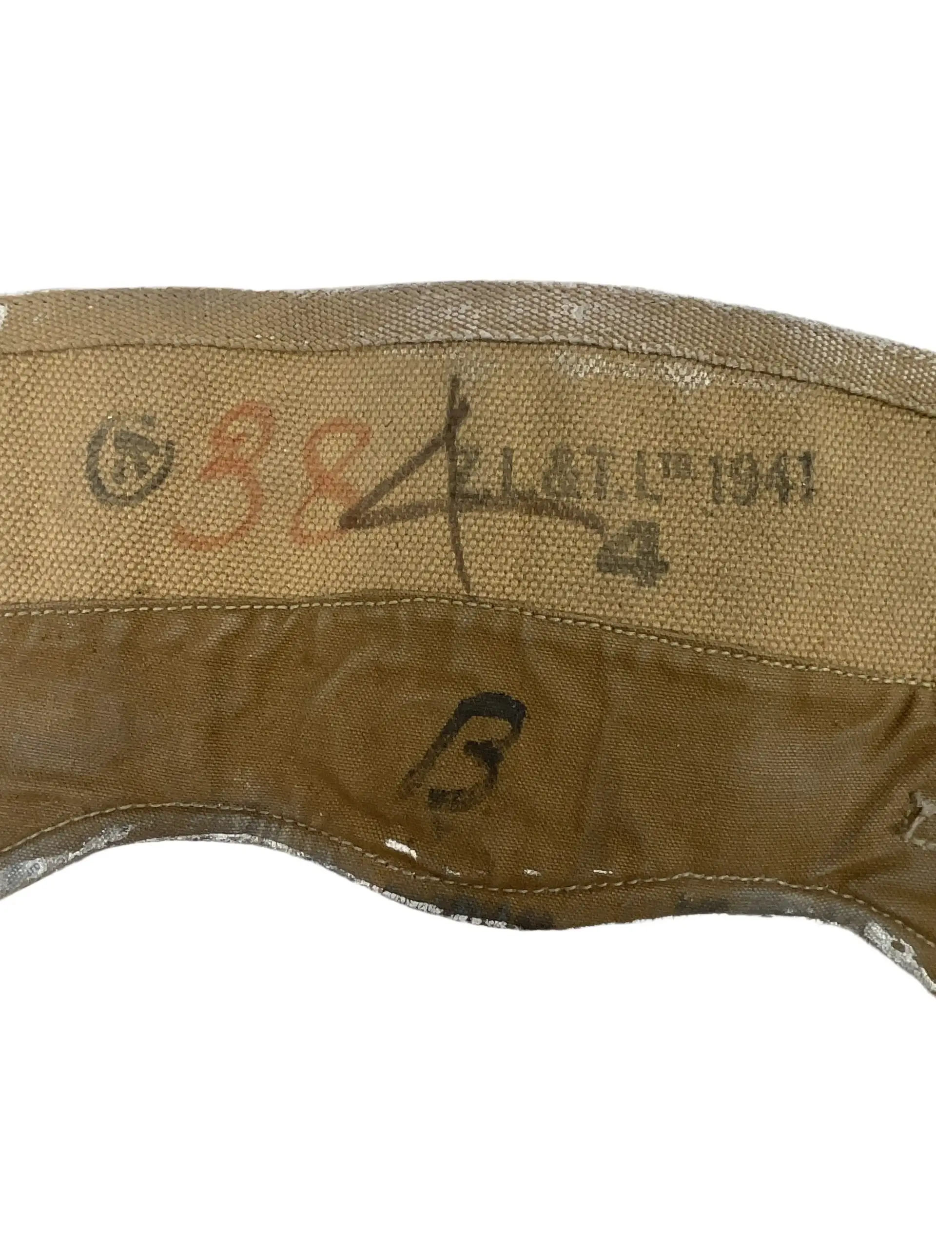 The WW2 Canadian RCN Navy Blancoed Gaiters, Size 4, are authentic military issue items from the Royal Canadian Navy during the Second World War. Gaiters such as these were worn by naval personnel to provide ankle support and protect the lower legs from debris and water when working aboard ships or during shore operations. This pair has been blancoed, meaning they were coated with a whitish cleaning and coloring paste commonly used at the time to maintain a uniform appearance. The gaiters are marked with the broad arrow stamp, signifying government property, and are sized as 4, indicating a particular fit according to period standards. Constructed from durable canvas with sturdy metal buckles and leather reinforcements, these gaiters reflect the practical design intended for use in demanding naval environments. Their markings and finish are consistent with official Canadian military issue during the 1939–1945 period.