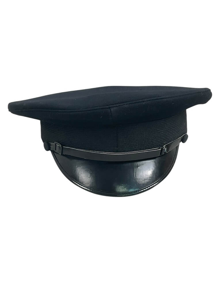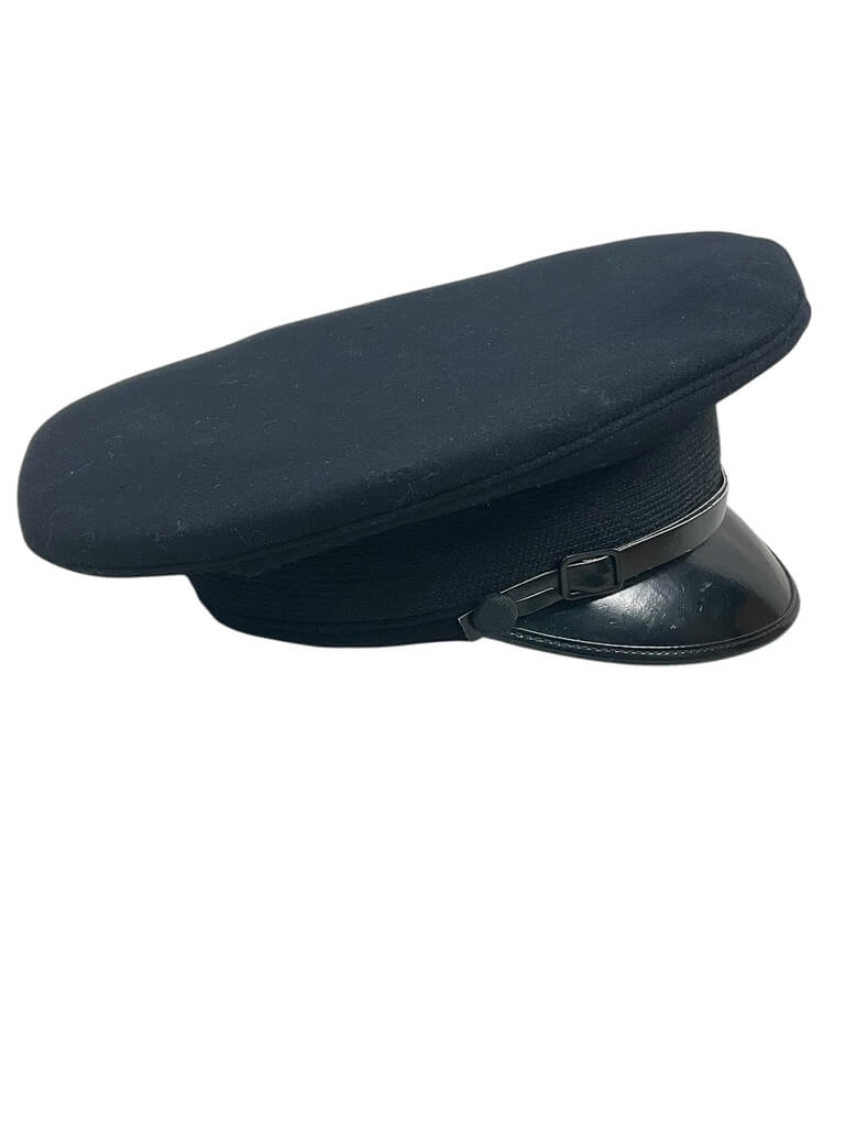 The WW2 Canadian RCN Navy Blue Peak Cap Hat, Size 7 1/2, is an unissued example of headgear as worn by members of the Royal Canadian Navy during the Second World War. This cap is constructed from dark navy blue wool with a rigid, raised crown and a stitched peak (visor) designed to provide shade and protection. The hat features a blackened chin strap