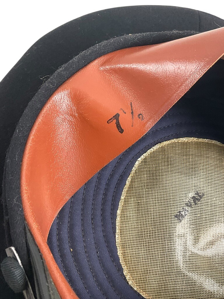 This WW2 Canadian Royal Canadian Navy (RCN) blue peak cap is an unissued item, retaining its original form and features from the wartime period. Constructed for naval personnel, the cap is made from dark blue wool with a black mohair band, accompanied by a hard black peak (visor). The interior has a leather sweatband and a cloth liner, with size marked as 7 1/2. This headgear was standard issue to RCN officers and enlisted ranks during the Second World War, reflecting the official dress code of the era. The cap does not bear visible signs of wear, indicating its unissued status. It provides a representative example of Canadian naval uniforms from the 1939–1945 period, suitable for reference or study by collectors and historians. Any accompanying insignia or badges would be affixed according to naval regulations but are not present unless otherwise stated.