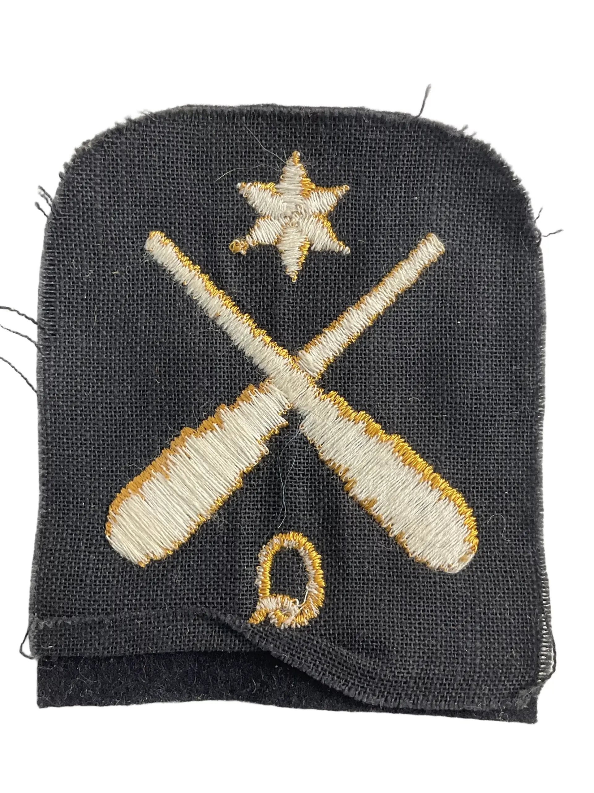 The WW2 Canadian RCN Navy Gunnery Quarter Rating 2nd Class Trade Patch is an original insignia issued to personnel serving in the Royal Canadian Navy during the Second World War. This trade patch was designated for sailors who held the rank of Gunnery Quarter Rating, 2nd Class, recognizing specialization in naval gunnery and ordnance handling. The patch is typically constructed of dark blue wool, featuring an embroidered crossed gun motif and chevrons in gold or yellow thread, with the precise design conforming to wartime regulations of the Canadian Navy. It would have been worn on the uniform sleeve as a distinguishing mark of technical proficiency and rank within the gunnery branch. The use of such patches allowed for quick identification of a sailor’s role and level of expertise on board ship. Today, these patches represent an important aspect of Royal Canadian Navy uniform history during the Second World War.