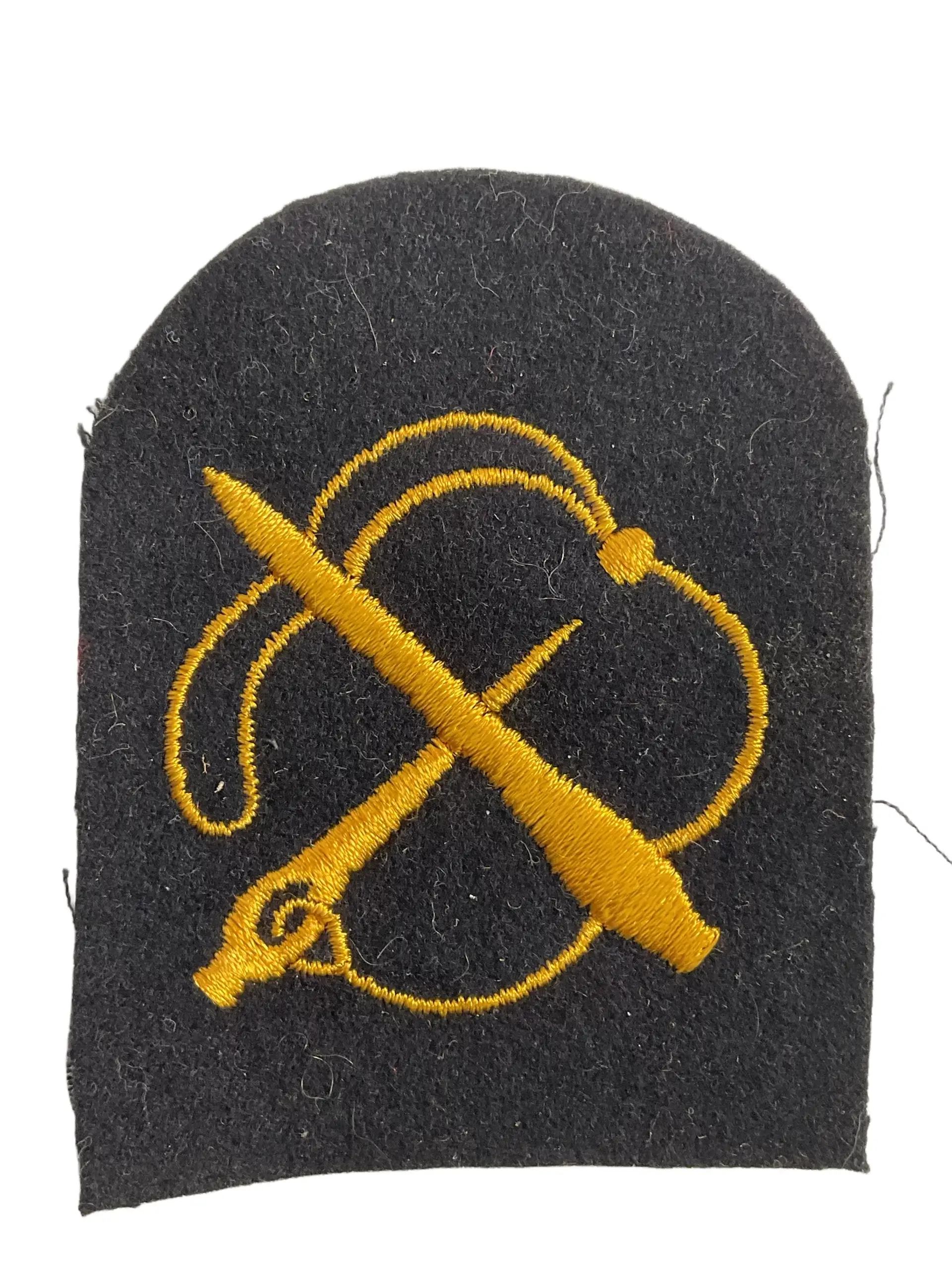 The WW2 Canadian RCN Navy Sailmaker Trade Patch represents the insignia worn by personnel qualified as sailmakers in the Royal Canadian Navy during the Second World War. This cloth badge identifies members trained in the maintenance, repair, and fabrication of canvas equipment, such as sails, awnings, and other fabric-related ship components. Typically, the patch is constructed from navy blue wool with an embroidered white or off-white symbol—usually featuring a needle and thread motif. The patch would have been worn on the right sleeve of the naval uniform, signaling the wearer’s specialized skills to fellow sailors and officers. These patches formed part of a broader system of trade badges within the RCN, designed to indicate proficiency and assignment within specific technical trades. Period examples provide valuable insight into the training, roles, and daily operations aboard Canadian naval vessels during WW2, as well as broader aspects of RCN organization and uniform standards.