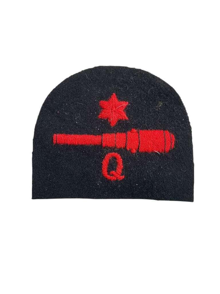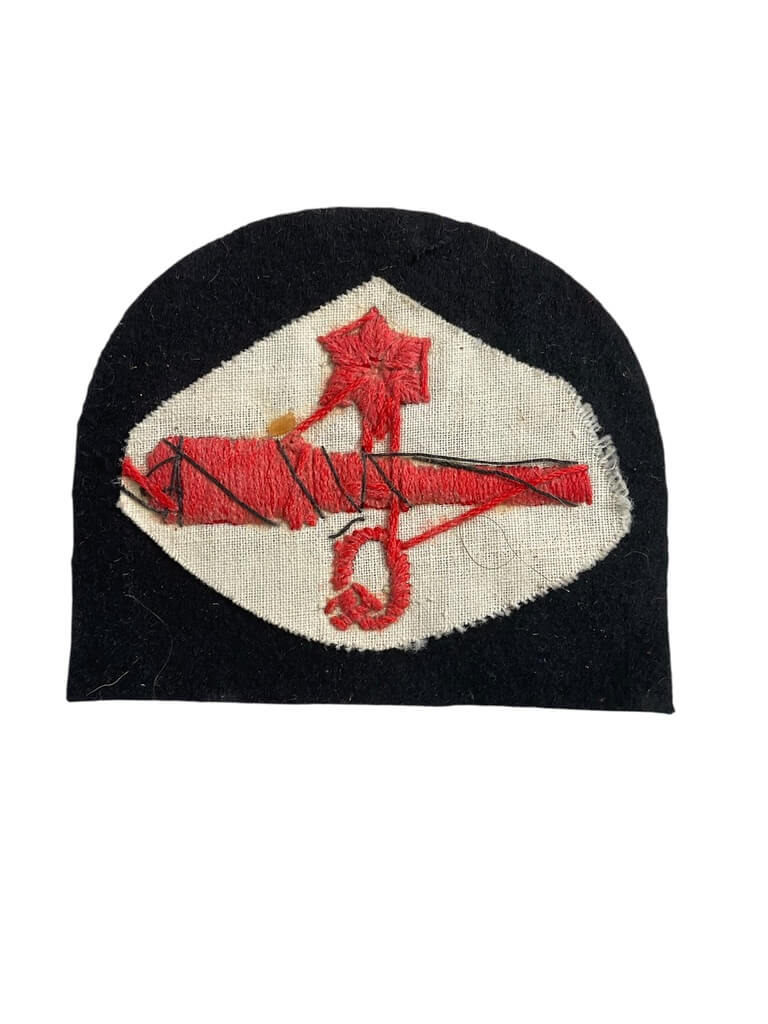 The WW2 Canadian RCN Navy Stoker 2nd Class Rate Patch is an authentic insignia issued to Royal Canadian Navy personnel during the Second World War. This patch was worn by sailors holding the rank of Stoker 2nd Class, a rating responsible for the operation and maintenance of a ship’s boilers and engine rooms. The patch typically features a distinctive design incorporating a ship’s propeller, embroidered in golden or yellow thread on a dark blue wool backing, signifying the engineering branch specialization. The size and shape align with standard Royal Canadian Navy rate badges from the wartime period, intended for placement on the left sleeve of naval uniforms. Stokers played a critical role in shipboard operations, ensuring reliable propulsion and power systems under challenging maritime conditions. This patch provides historical insight into the structure and function of the RCN during World War II and is a representative artifact of Canadian naval history from this era.