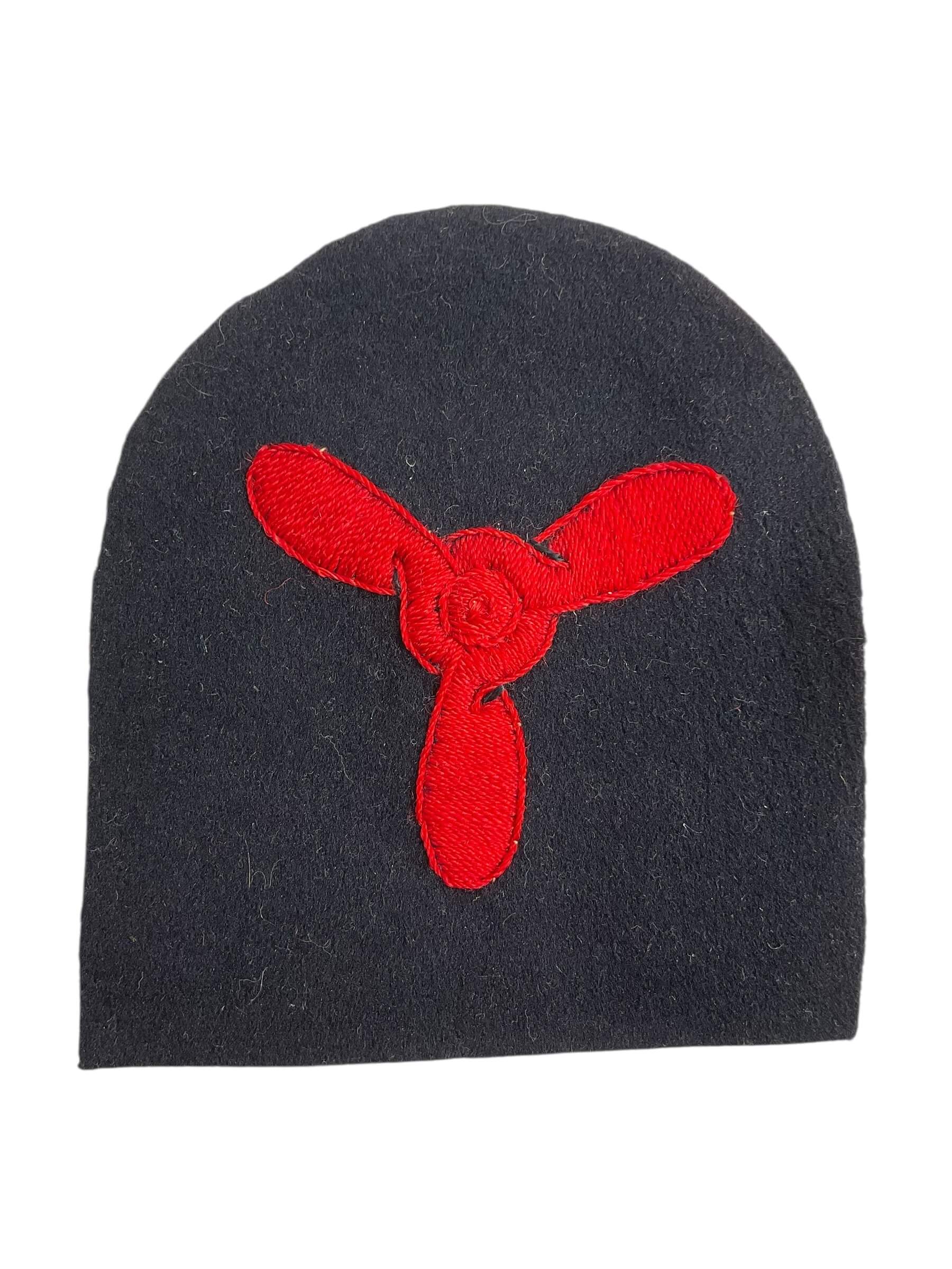 The WW2 Canadian RCN Navy Stoker Rate Trade Patch is an original insignia issued to enlisted personnel of the Royal Canadian Navy during the Second World War. Stokers played a crucial role in ship operations, being responsible for the maintenance and functioning of the vessel’s engines and boilers. The trade patch typically features a stylized propeller or related engineering symbol, embroidered on a dark blue wool backing