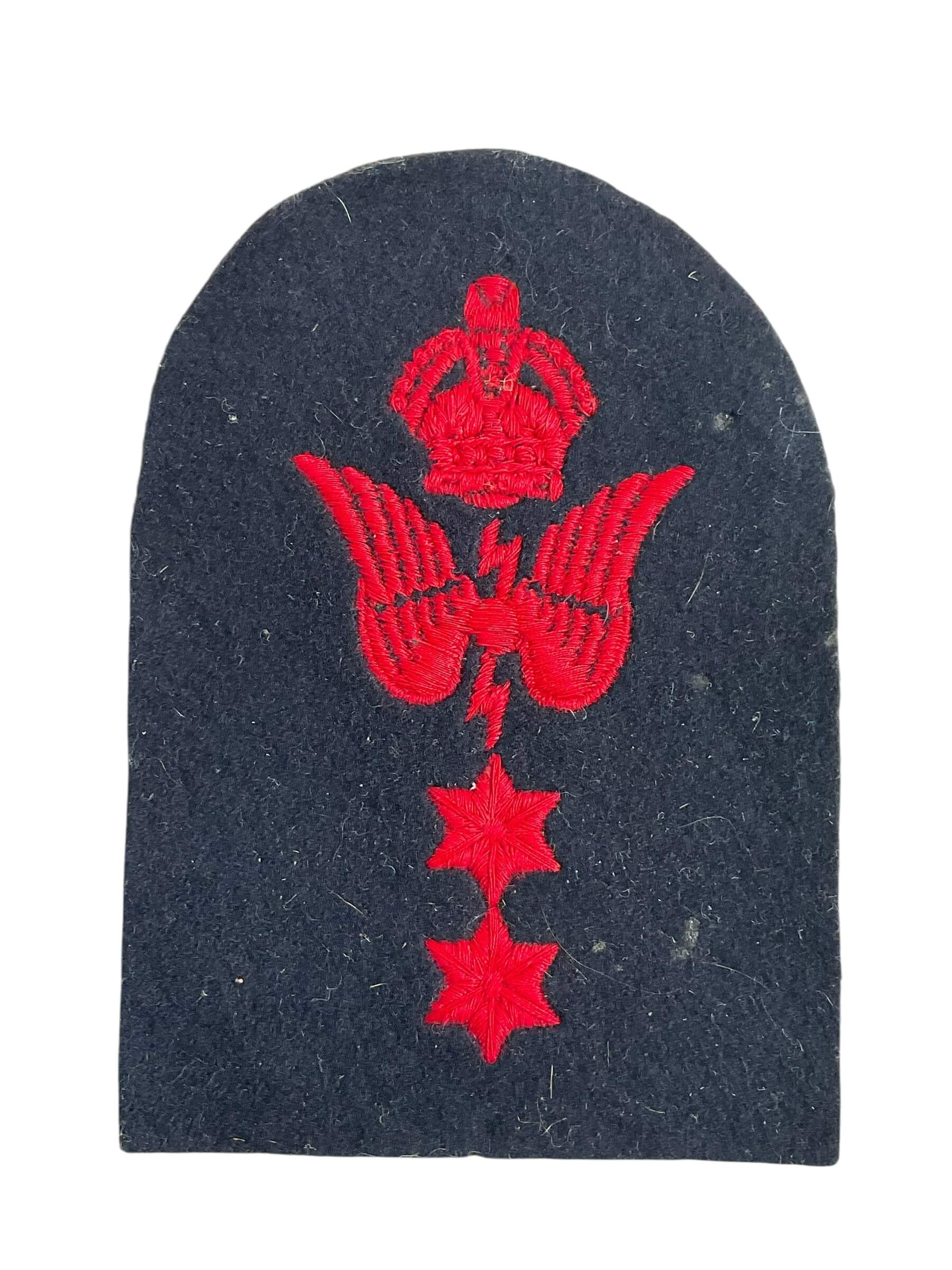 The WW2 Canadian RCN Senior Navy Radio Supervisor Trade Patch is a historical military insignia from the Royal Canadian Navy during World War II. As indicated by its title, the item pertained to the position of Senior Radio Supervisor. The patch displays traditional RCN symbols, serving as testament to the strategic communication role during the war period.