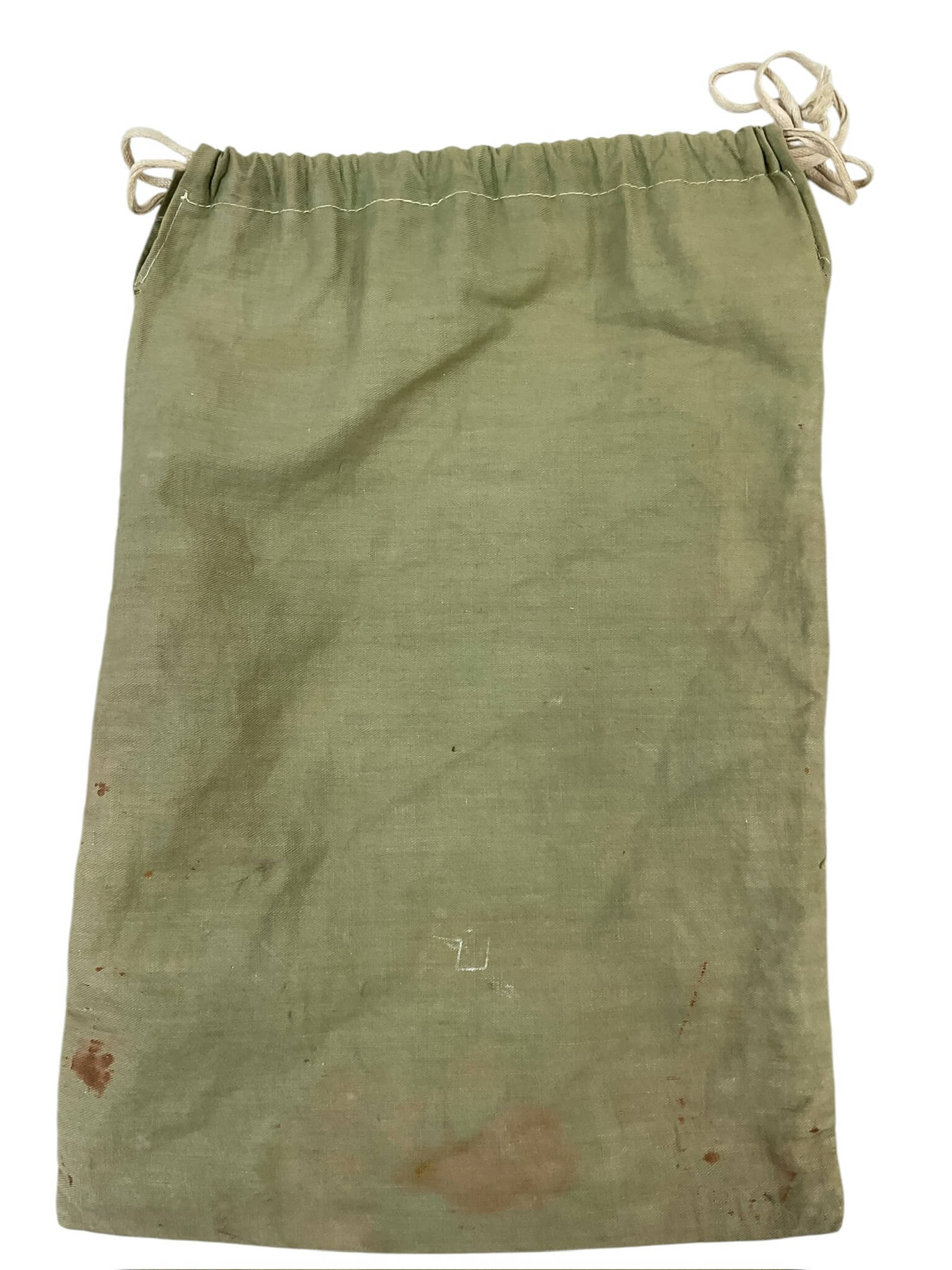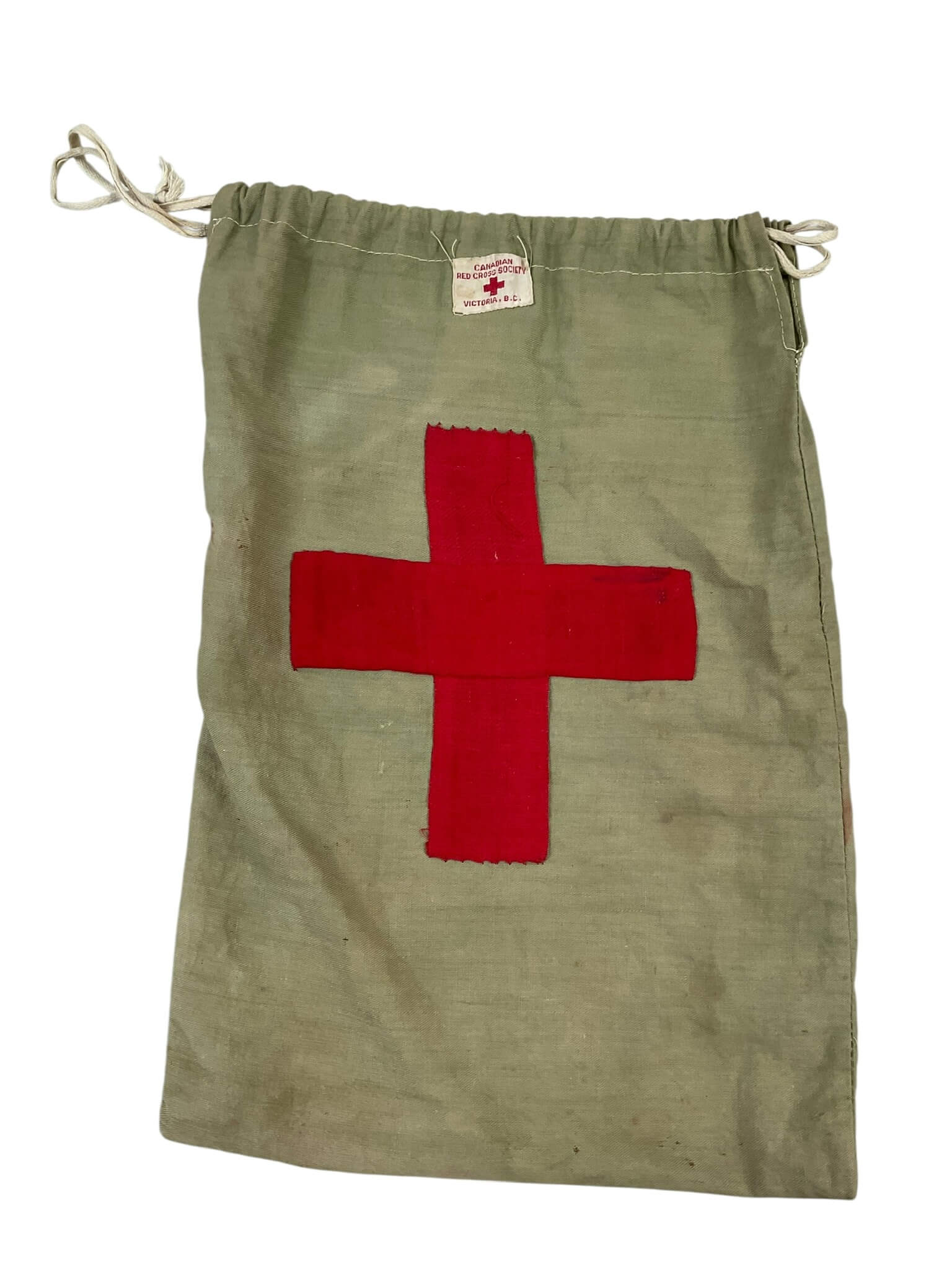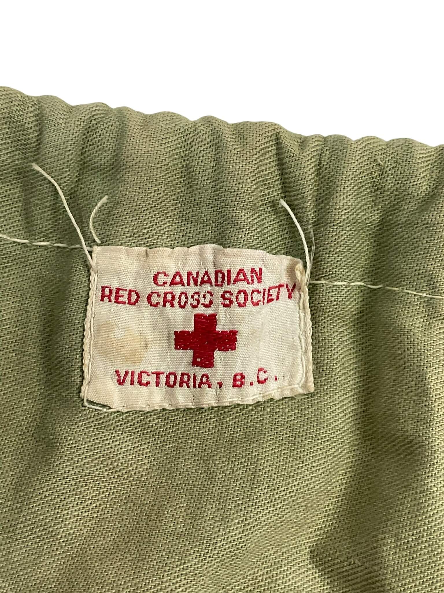 The WW2 Canadian Red Cross Ditty Bag, measuring 13 1/2 inches by 9 1/2 inches, is an original military-issued personal effects bag used by Canadian forces during the Second World War. These canvas bags were distributed by the Canadian Red Cross to servicemen for storage and transport of toiletries, small personal items, or correspondence. The bag is typically constructed of durable cotton canvas, with a drawstring closure at the top for secure containment of contents. Many examples from this period feature stenciled or printed markings indicating the Canadian Red Cross and may include a red cross emblem. Ditty bags such as this were essential for maintaining personal hygiene and organization in field conditions, and their distribution was part of broader morale and welfare efforts by support organizations. This item reflects the contributions of the Canadian Red Cross to the Canadian Armed Forces during the global conflict.