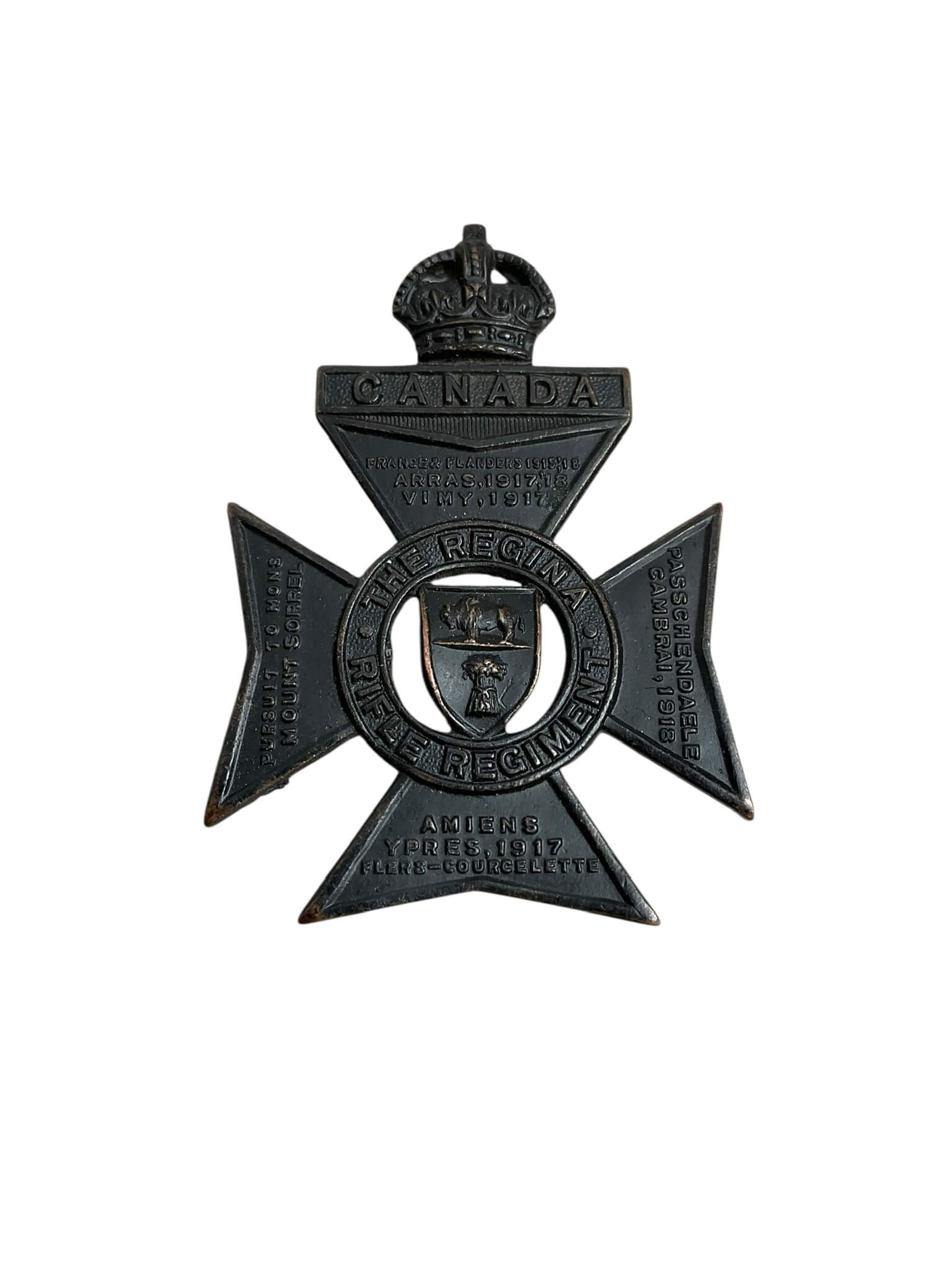 The WW2 Canadian Regina Rifle Regiment Cap Badge is a historical artifact that exemplifies bravery, patriotism, and the rich military history of Canada. This unique cap badge belonged to the esteemed Regina Rifle Regiment, a renowned infantry unit that participated in World War II. The back of the badge holds lugs and a pin for attachment to a military cap. This vintage piece is not just a badge, but a tangible memory of the sacrifices and courage of Canadian soldiers during the tumultuous times of WWII. It is a must-have for military enthusiasts, history buffs, or anyone interested in Canadian heritage.
