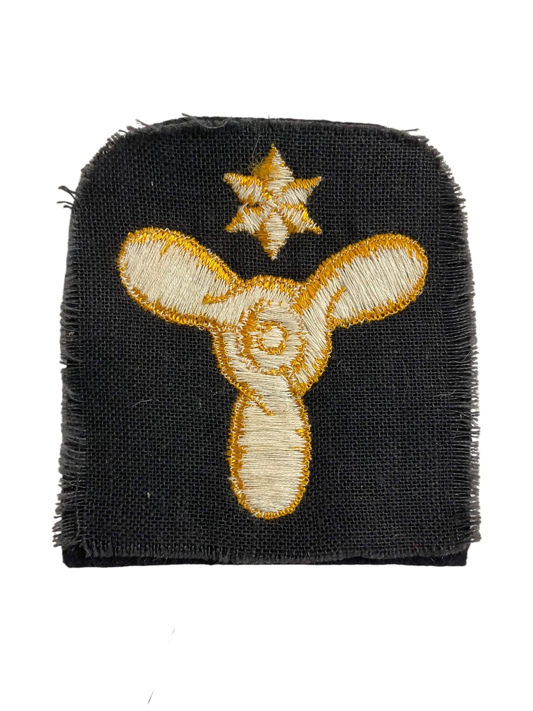 The WW2 Canadian RN Navy Stoker 1st Class Trade Badge is an original cloth insignia issued to Royal Canadian Navy personnel during the Second World War. The badge denotes the rank of Stoker 1st Class, a key engineering position responsible for maintaining and operating a ship’s propulsion and auxiliary machinery. Typically, the badge features a single star positioned above a propeller motif, embroidered in gold
